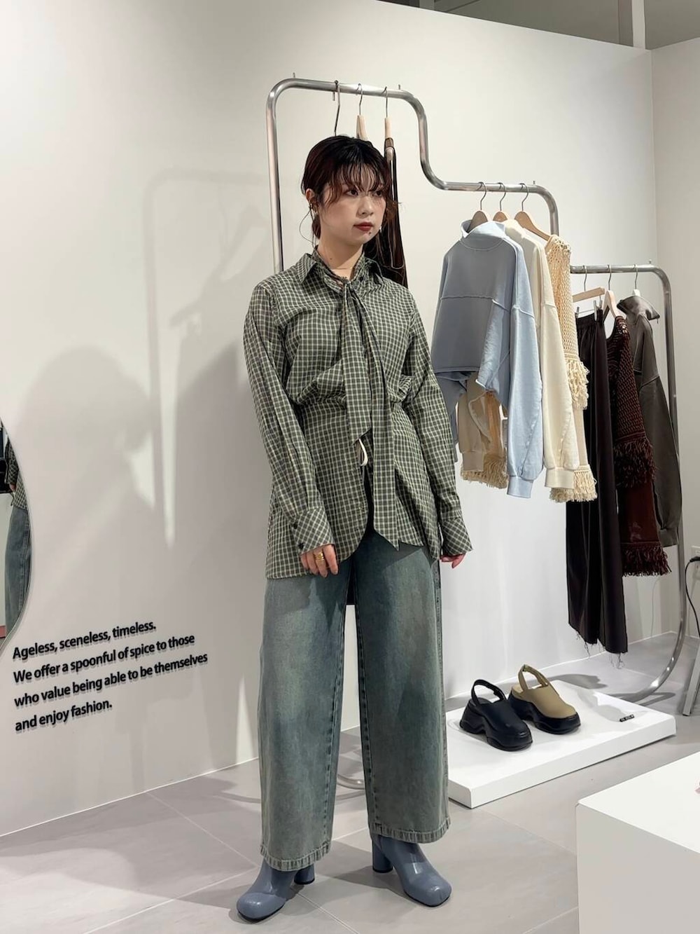 ウエストマークデザインのチェックシャツは、着るだけでメリハリがつきます^^