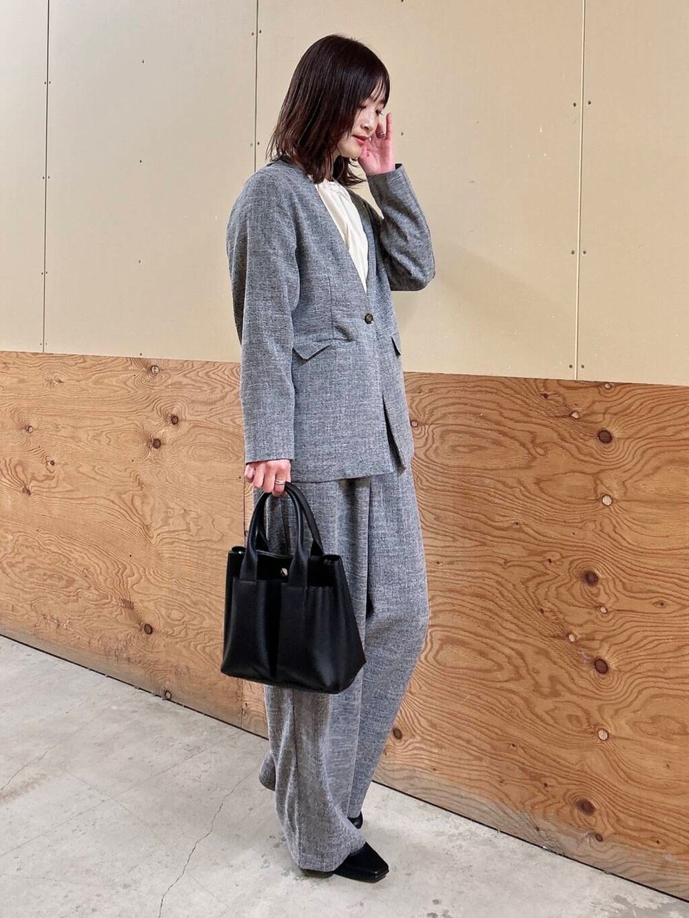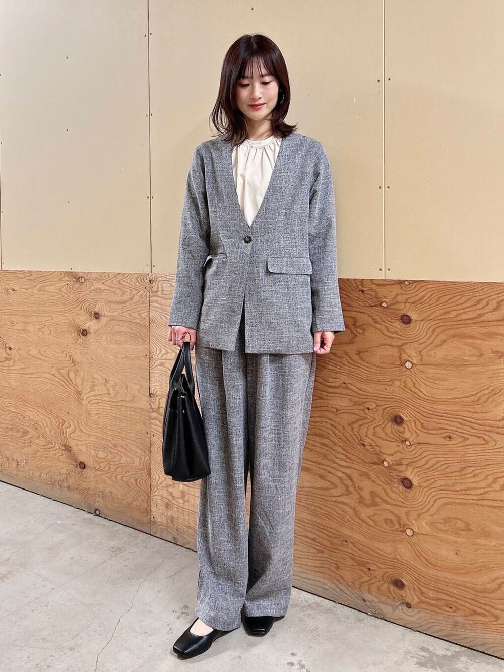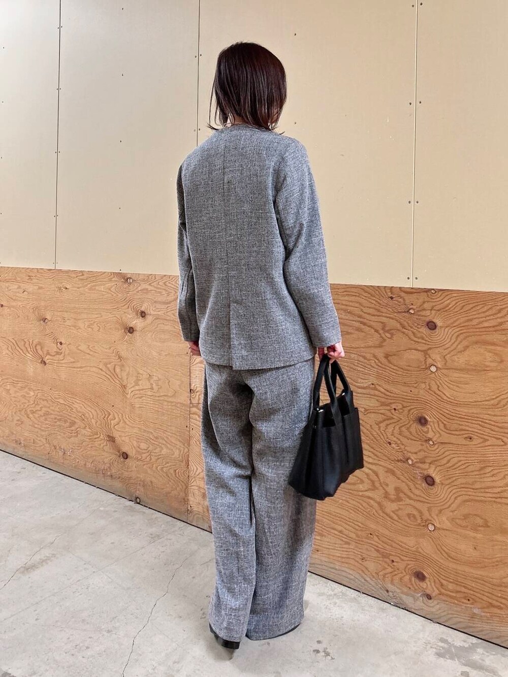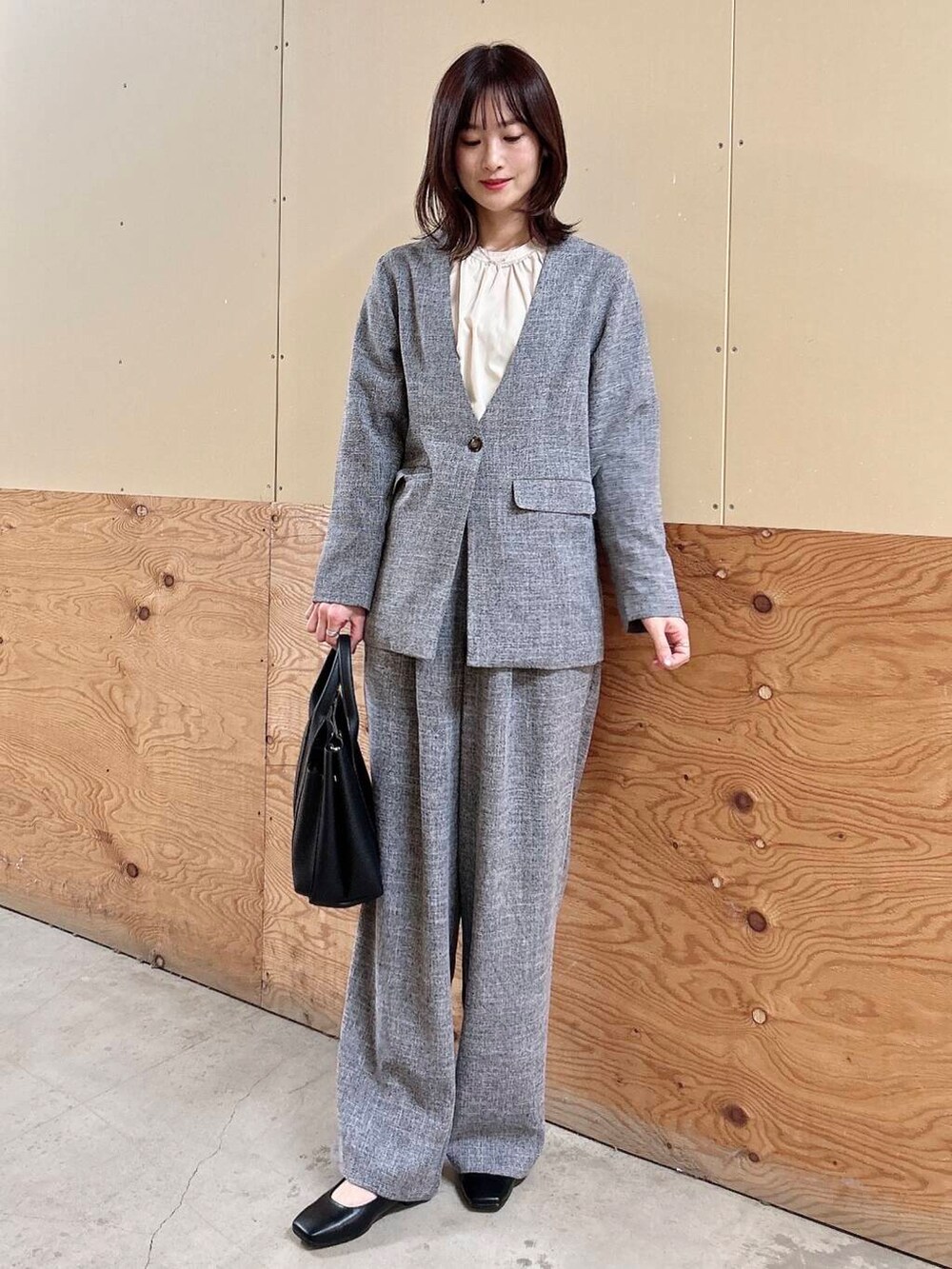 カチッとし過ぎない生地感で、ジャケットはお尻まで隠れる着丈。