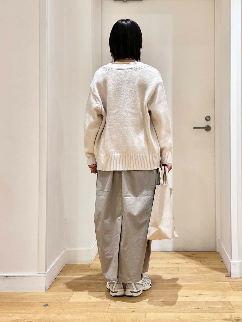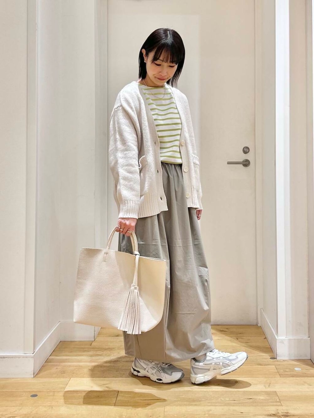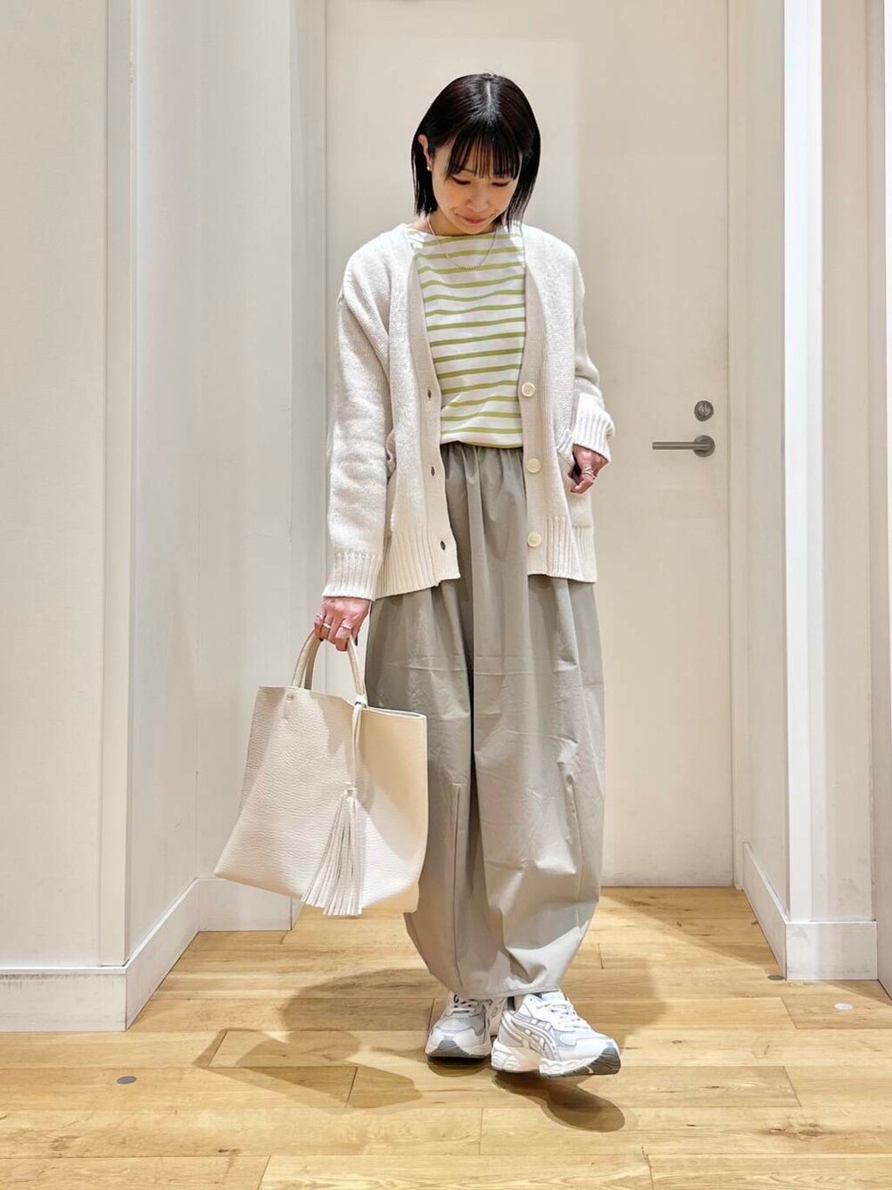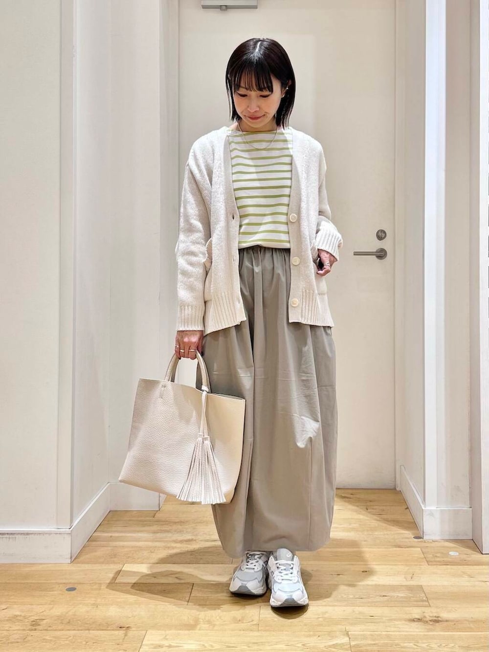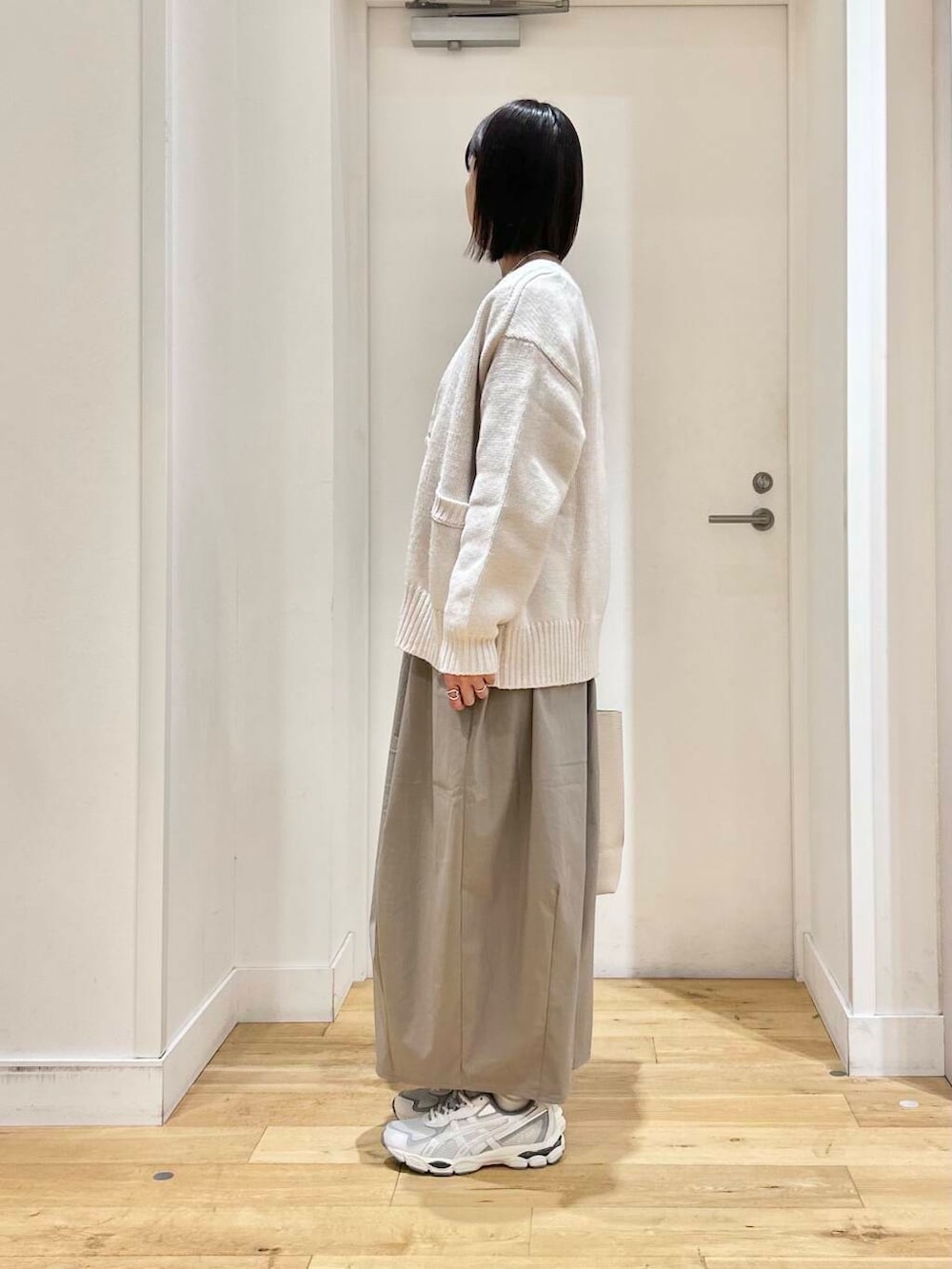 ニットカーディガンは、しっかりした生地感なので、アウター代わりにちょこっと羽織るにもちょうどいいですよ◎