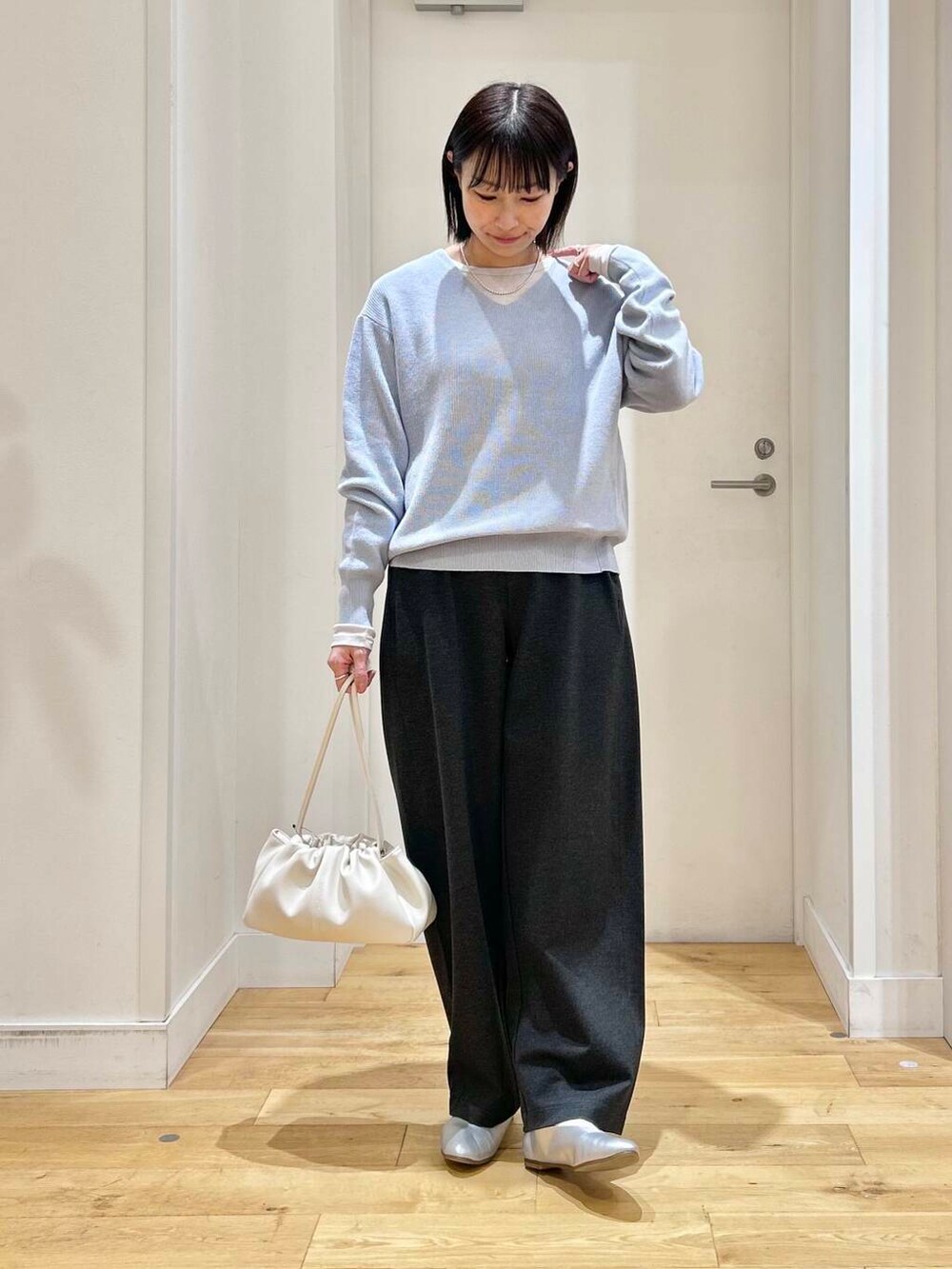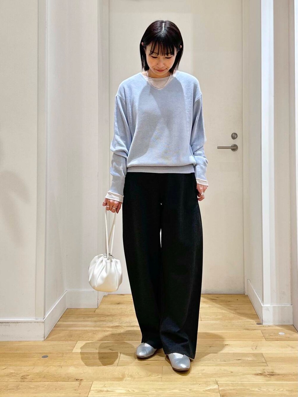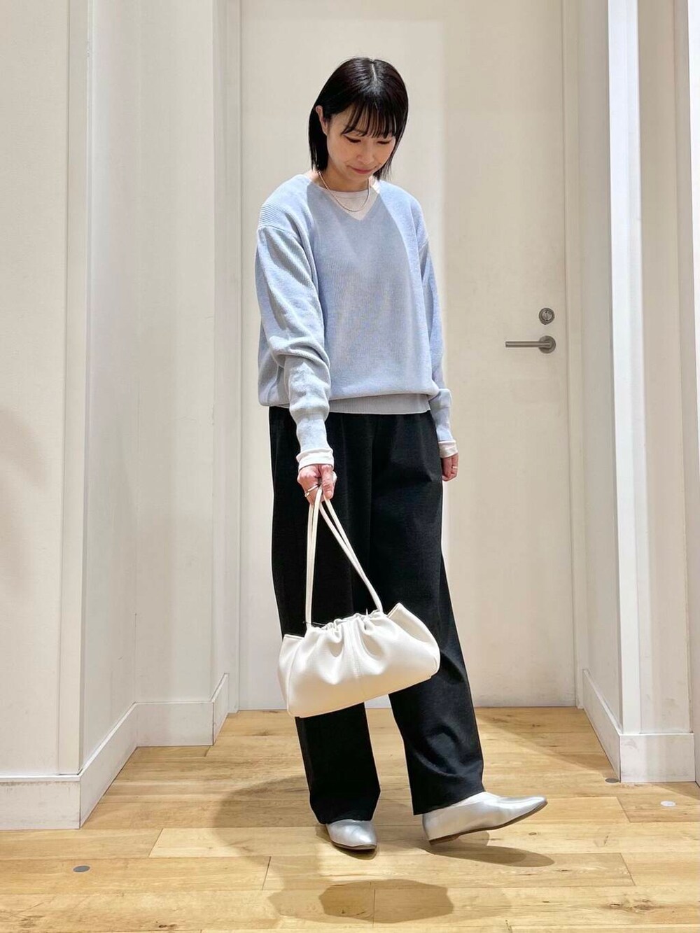 浅めのVネックでインナーも気にせず着用できて、女性らしい上品な印象も与えてくれます◎