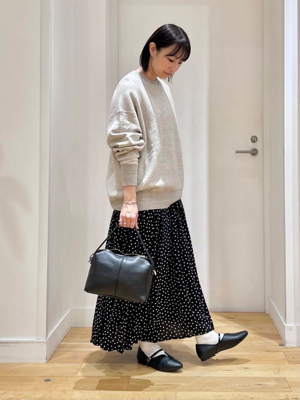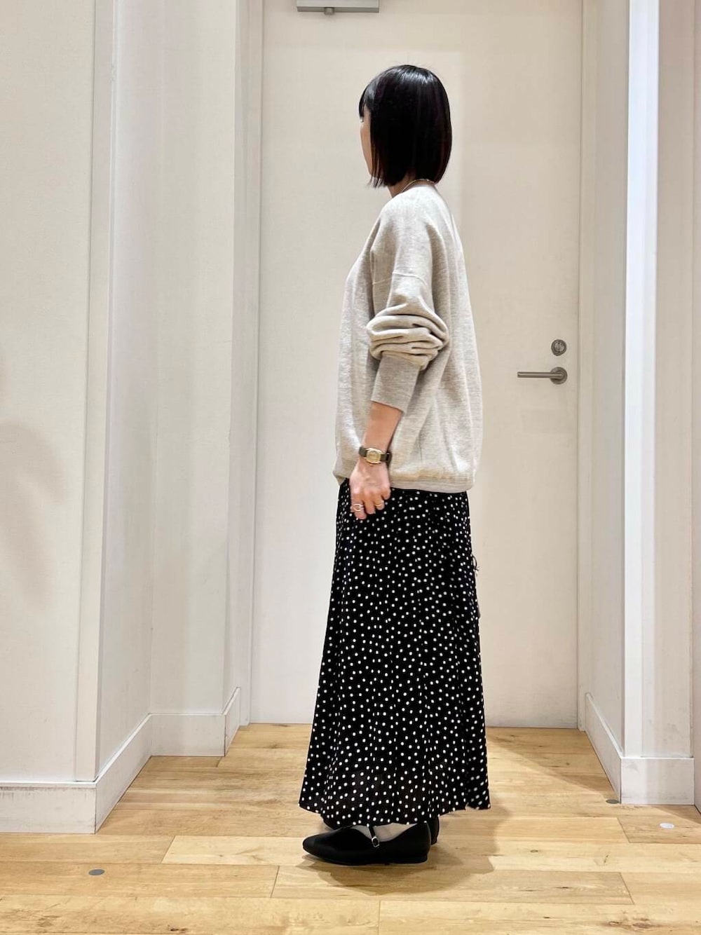 スカートは、レーヨン100%の滑らかな質感で落ち感があるのでスッキリとしたシルエットで着用できますよ◎