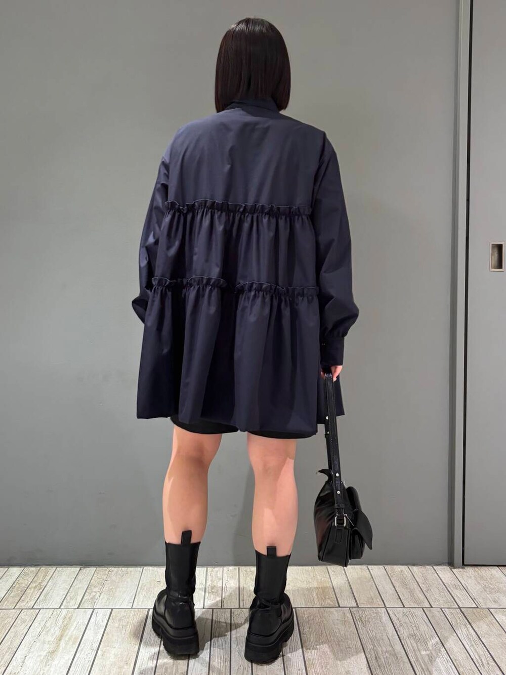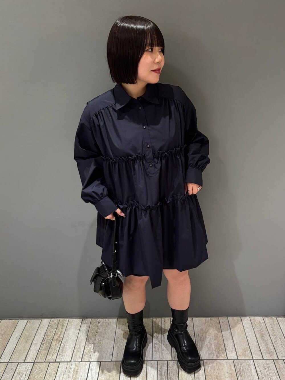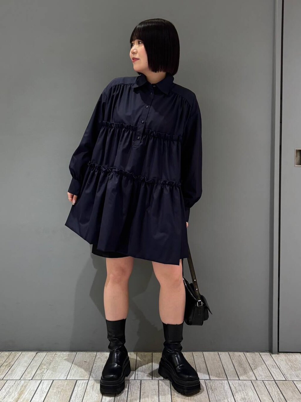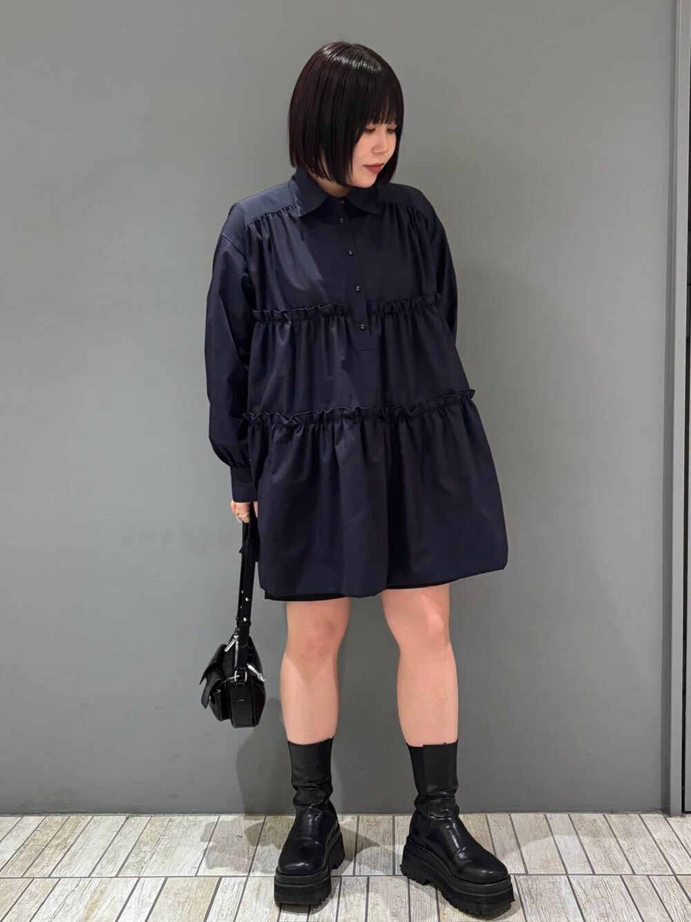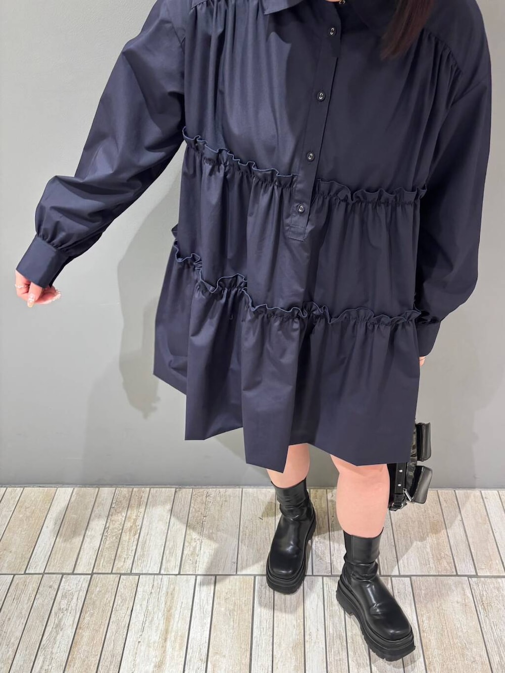 骨格ストレートさんはティアードがあまり似合わないとされていますが、ボタンを1つ開けて首もとスッキリ見せたり、足を出すことでバランス取りやすくなるのでチェックしてみてくださいね👀💕︎