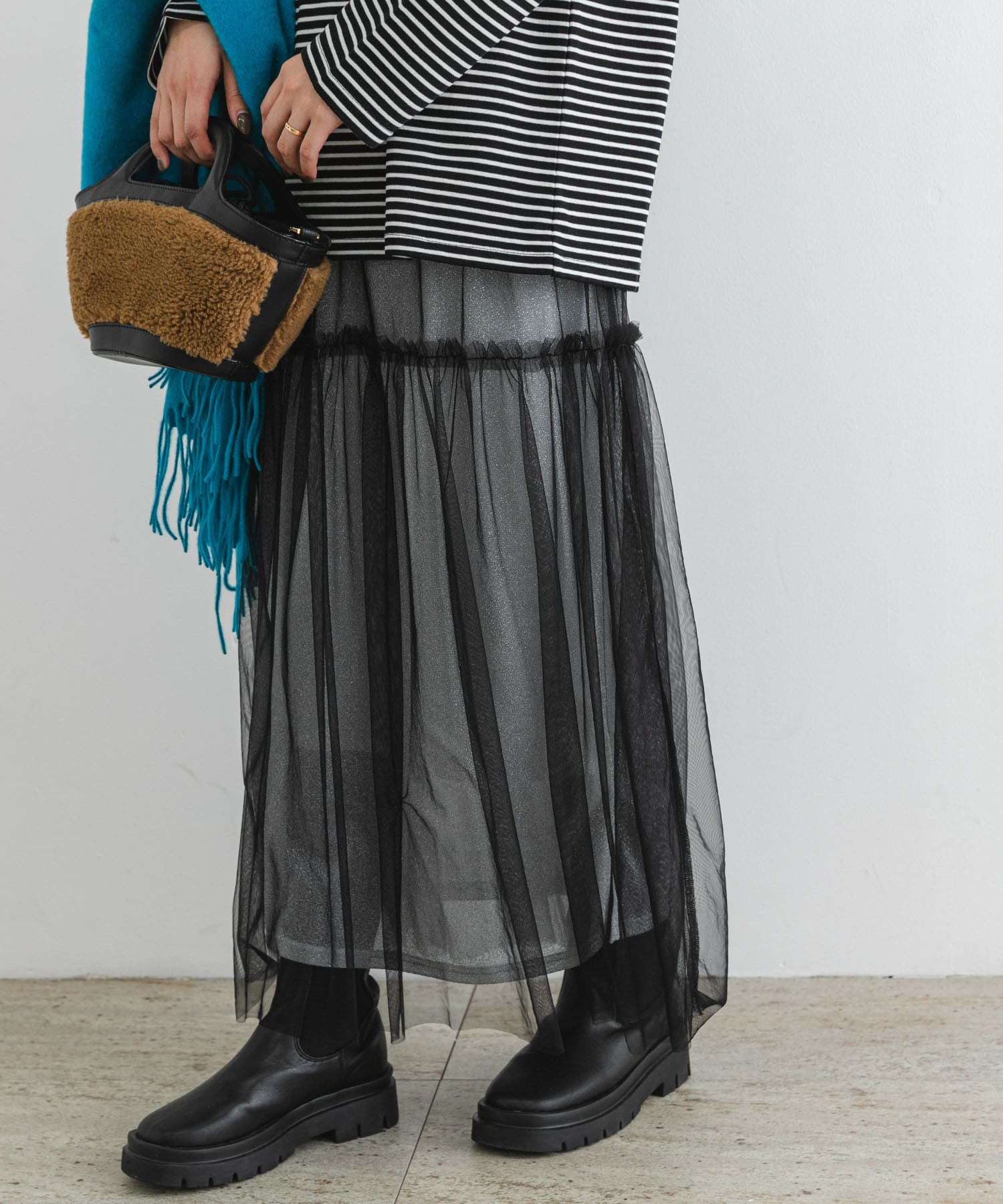 ラメスカートにチュールがレイヤードされたスカートは華やかで上品な印象です。