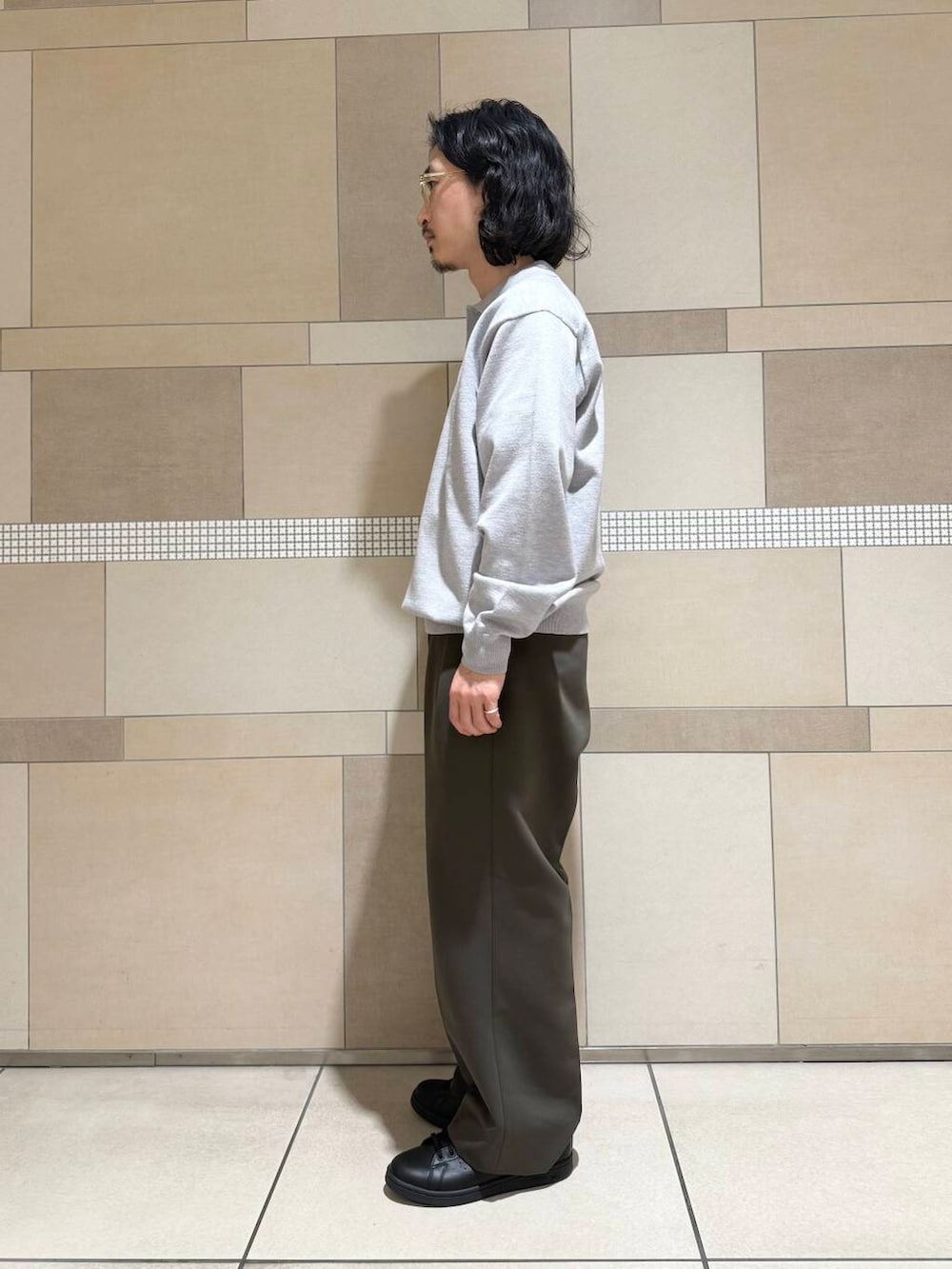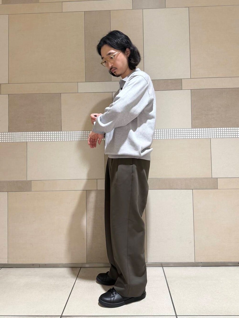 200日ニットポロシャツとキレイめなスラックスで大人コーデで、足元は黒の革スニーカーでかっちりしすぎないようにしました!