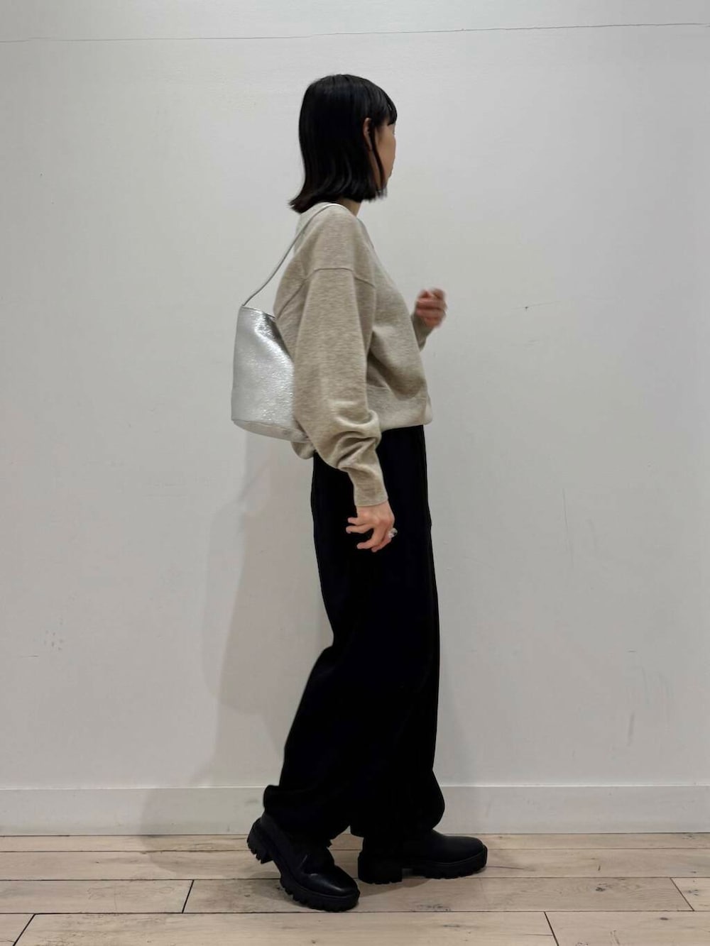 EKALのパンツは裾が絞れるので、今回は絞って着用してます。絞るとブーツがよく見えて足元もポイントになります◎