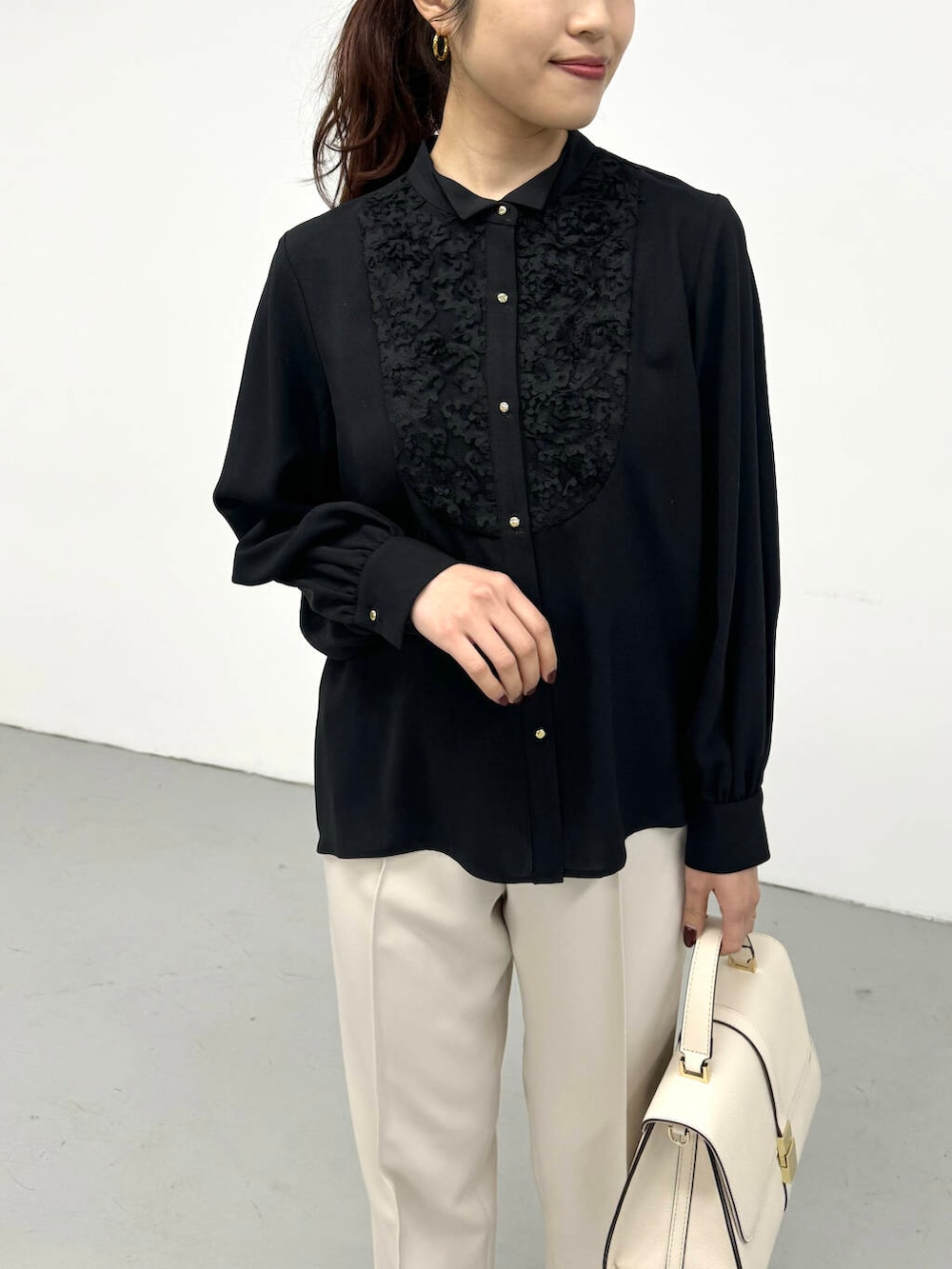 胸元全体のフラワーレース×さり気ない小さなゴールド釦が、華やかな印象に仕上げてくれます。ミニサイズの襟元が首元をすっきりと見せてくれるので、アップヘアもダウンヘアも様になります◎1枚はもちろん、ジャケットやジレをプラスした着こなしもお勧め。