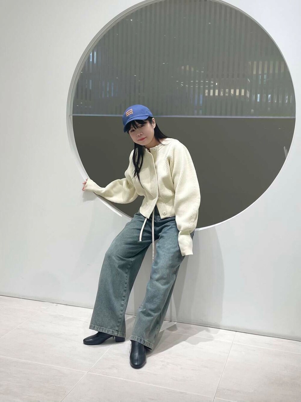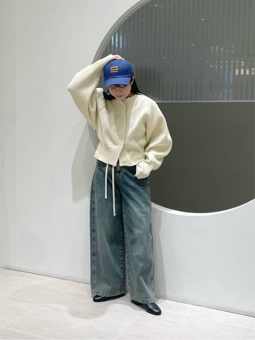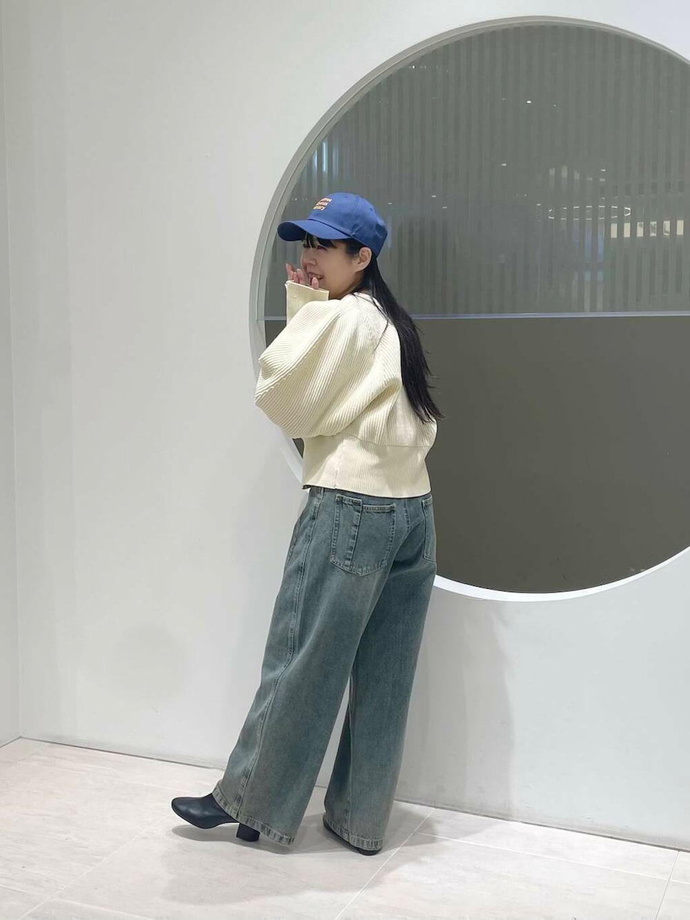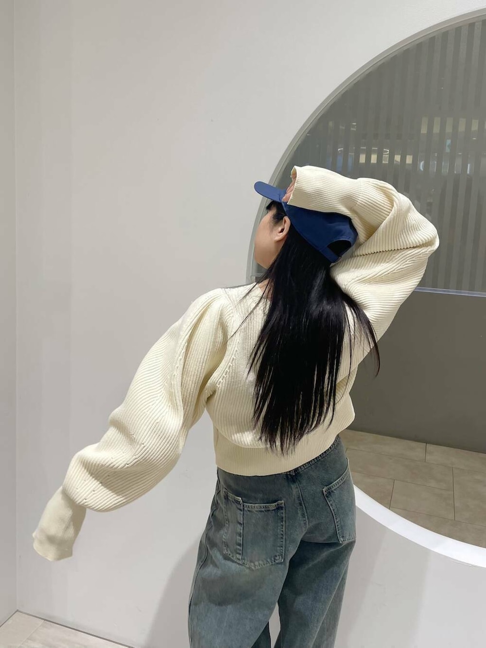 肩がパフスリーブのようにぽわんとした丸みのあるシルエットなので女性らしい印象になります。着丈は裾のリブが太く腰で止まるのでボトムINしなくてもすっきりみえます。