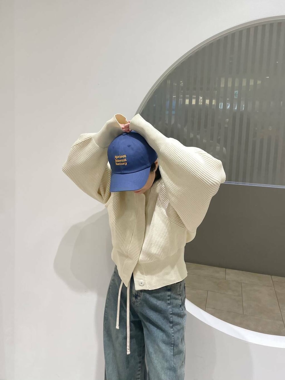 鮮やかめのブルーでカジュアルMIXな印象のキャップ。配色がコーデのポイントになります。