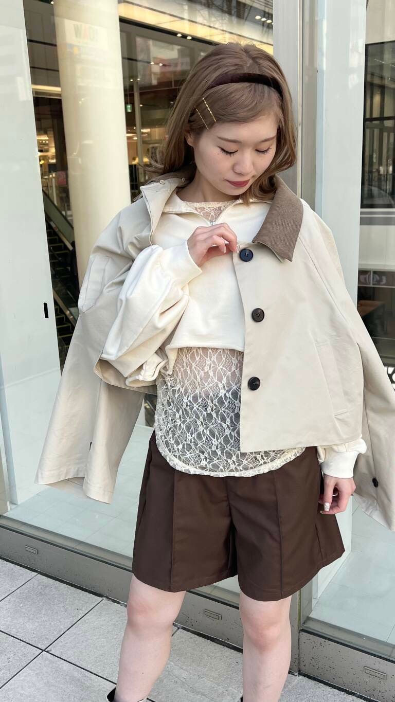 トップスの丈が短めなので、レースのインナーを出してみたり、お手持ちのアイテムをチラ見せでも◎