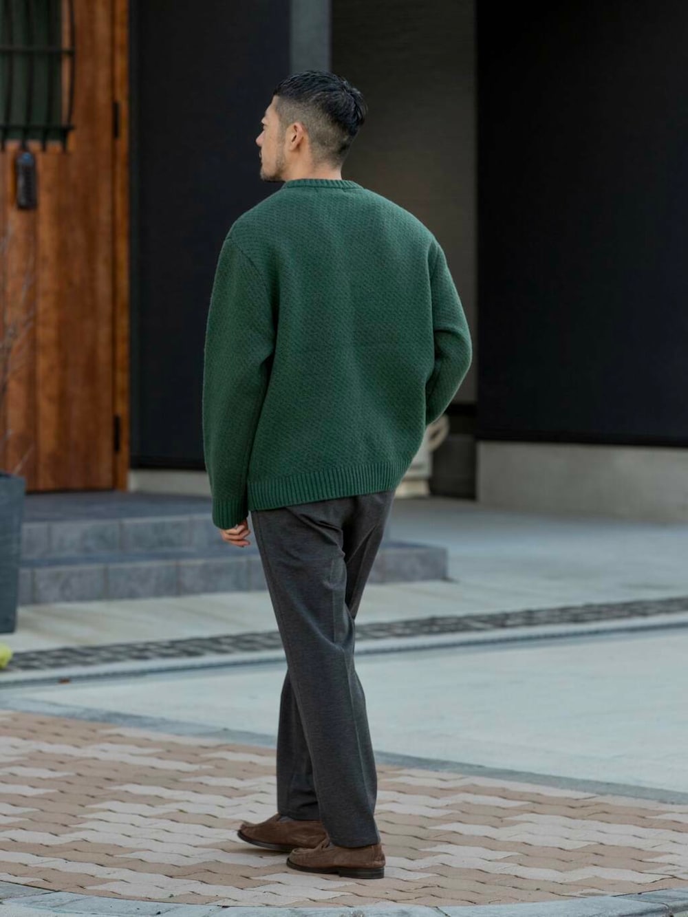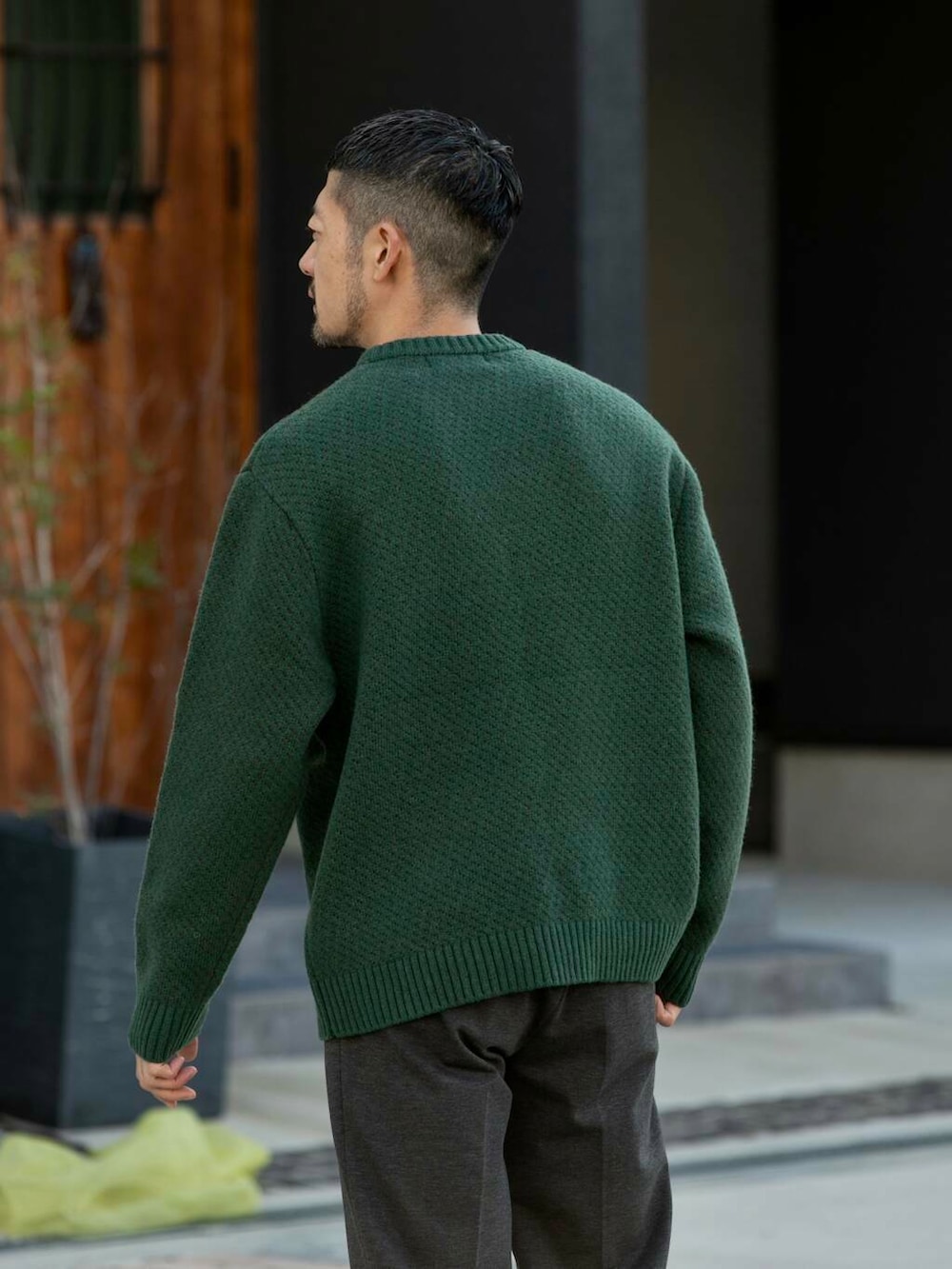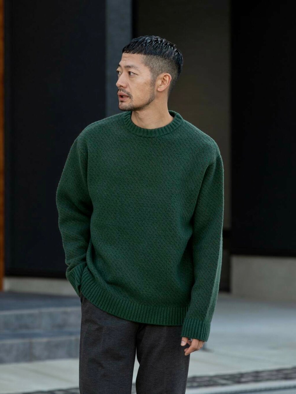 ざっくりした素材感に控えめなバーズアイ柄、インナーはもちろん1枚でも存在感抜群。