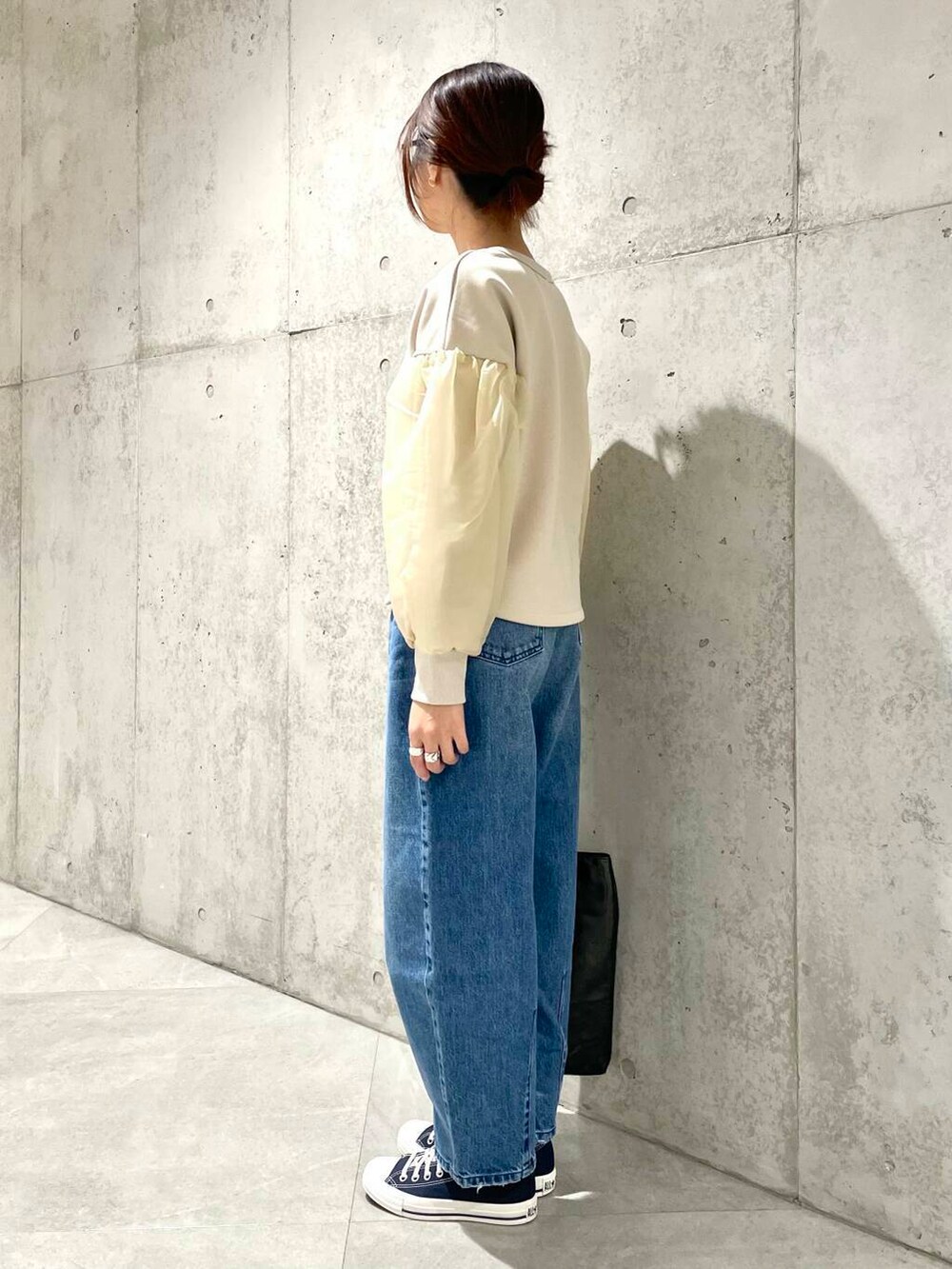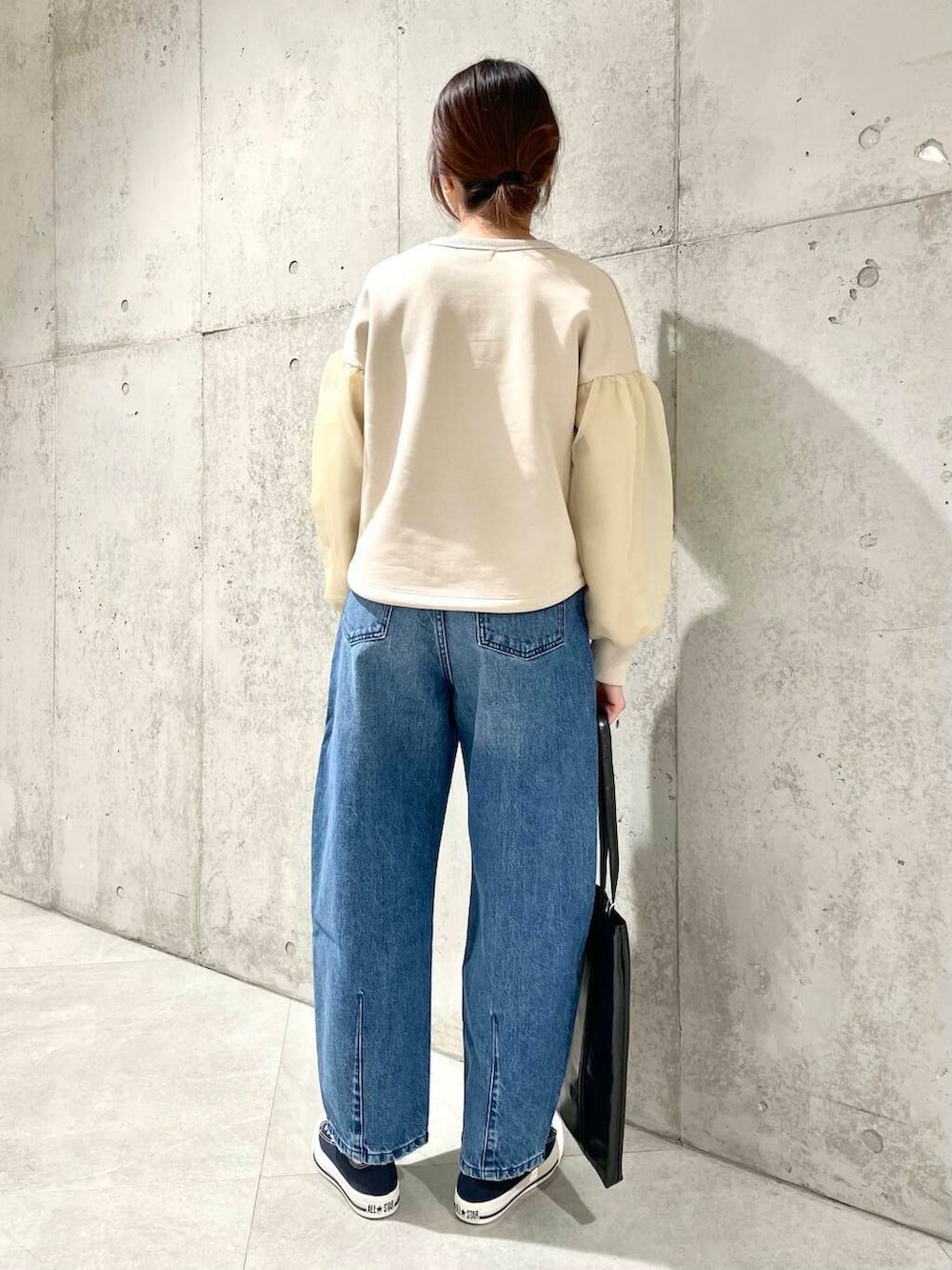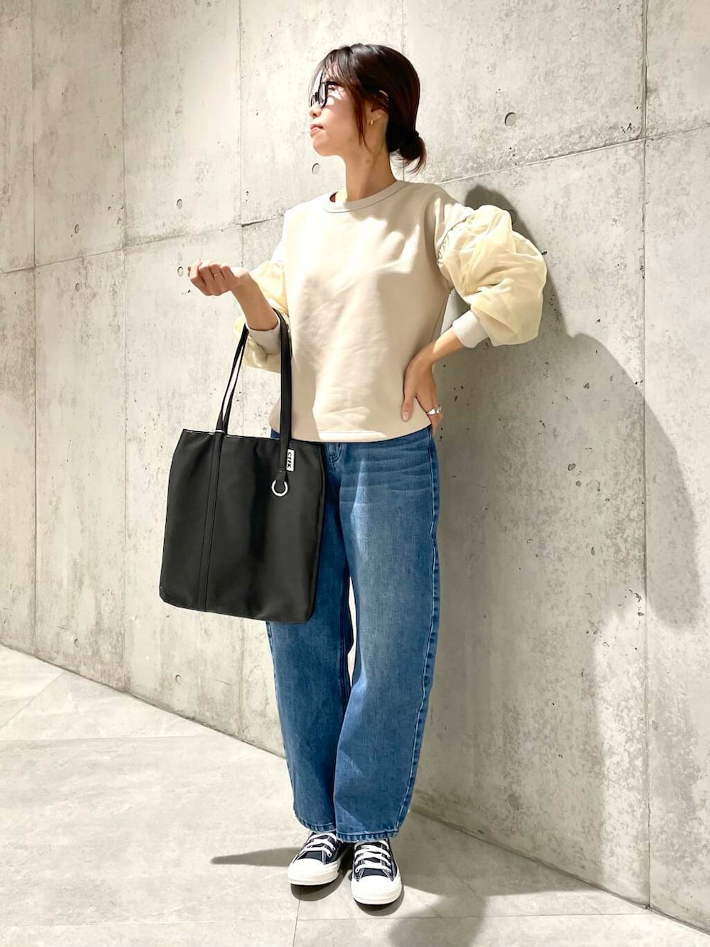甘めトップスにはゆるデニムとスニーカーでラフさを投入するのが私流です^ ^