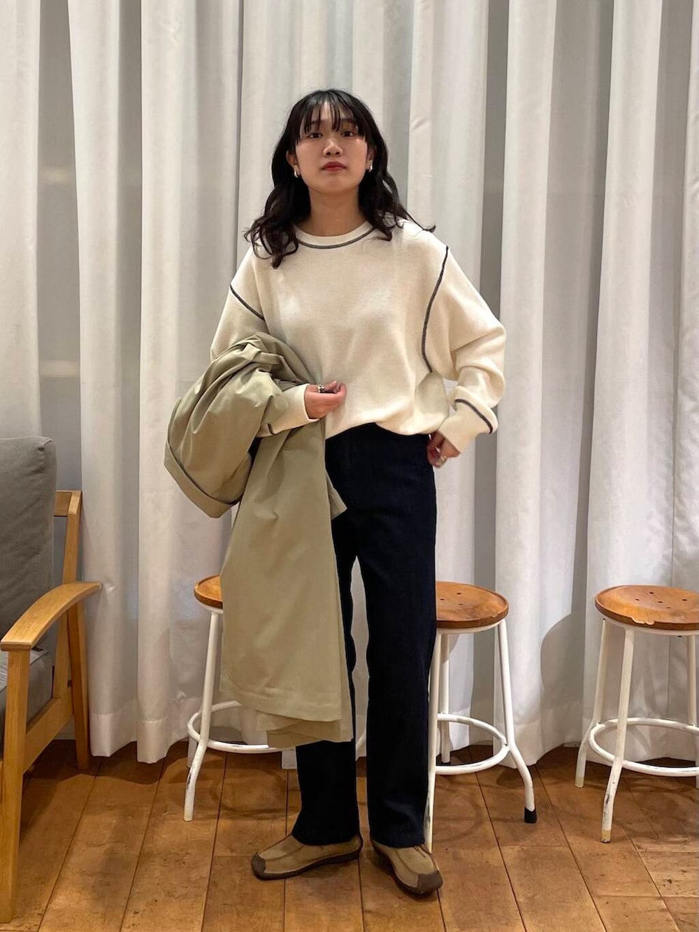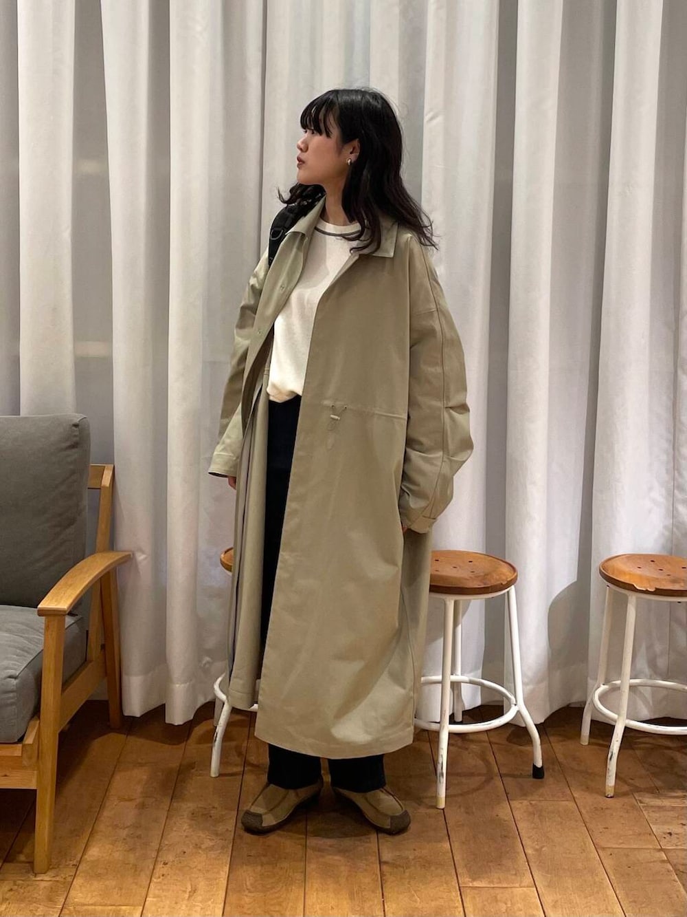ステンカラーコートのカーキベージュの色味が