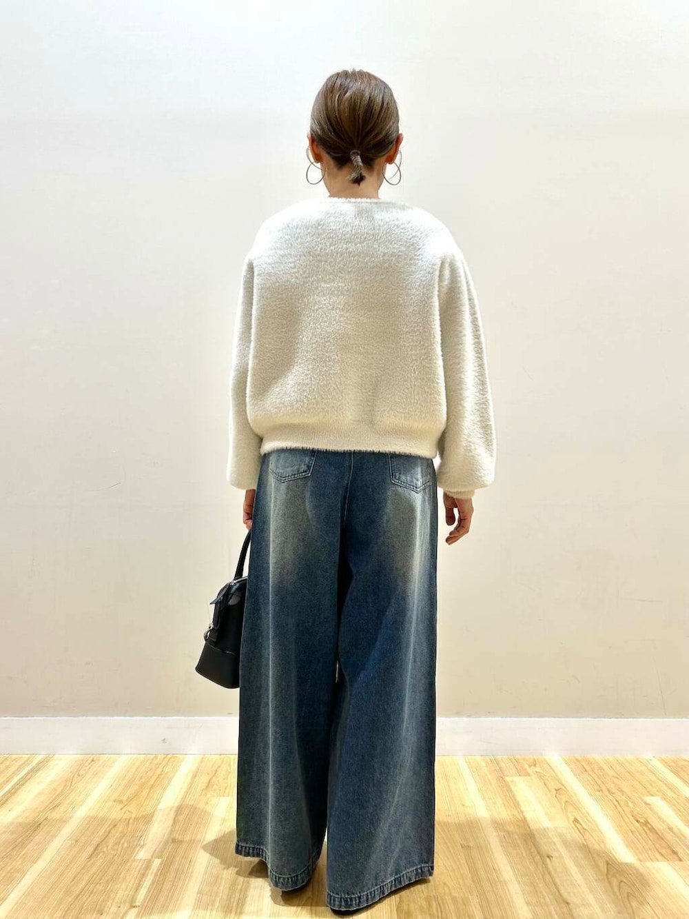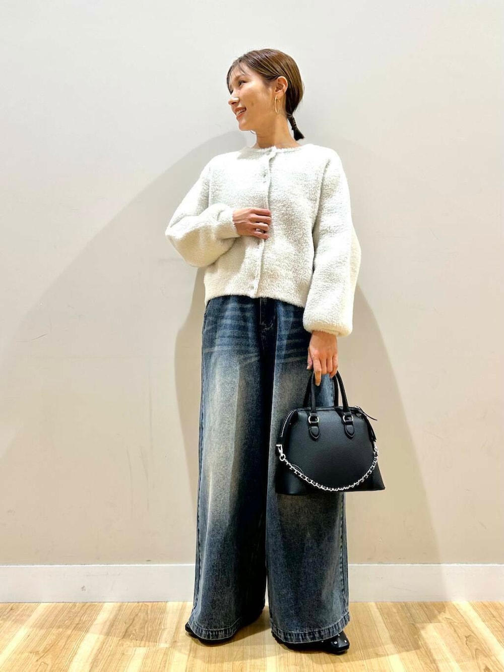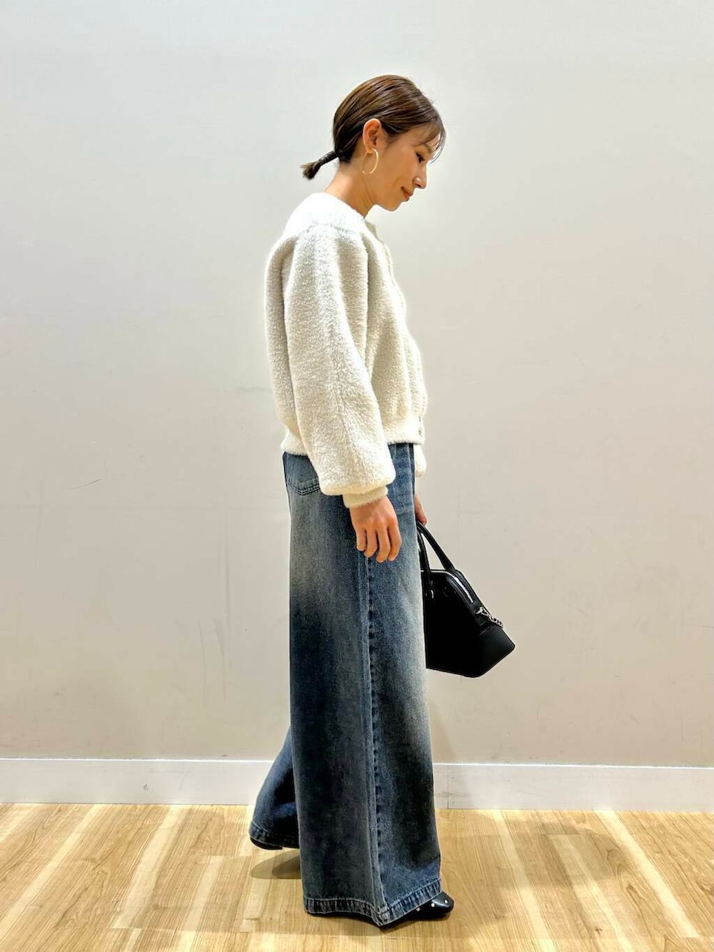 女性らしい雰囲気なので、ユーズド感あるワイドデニムと