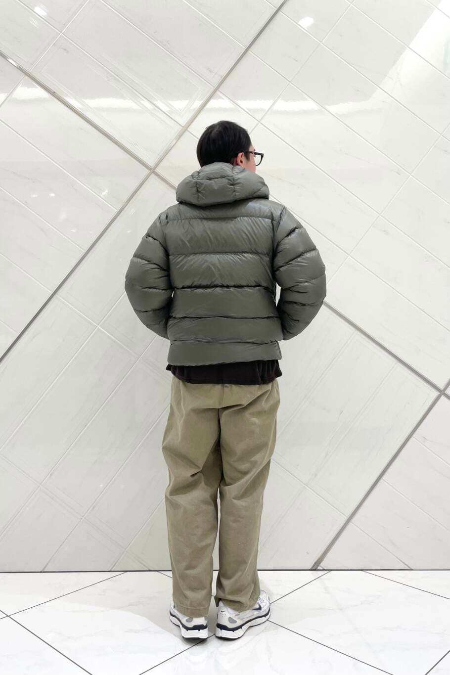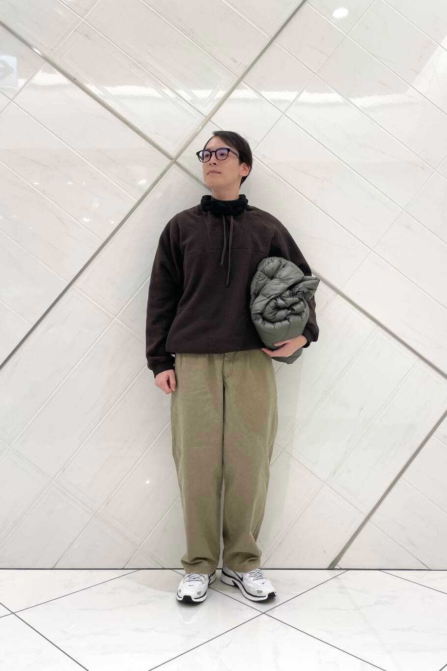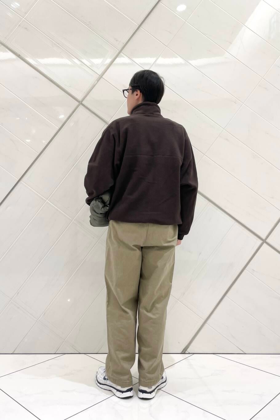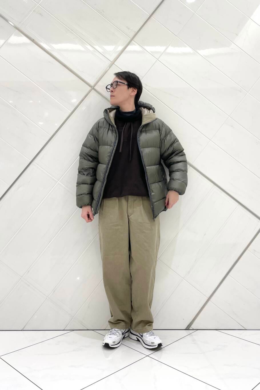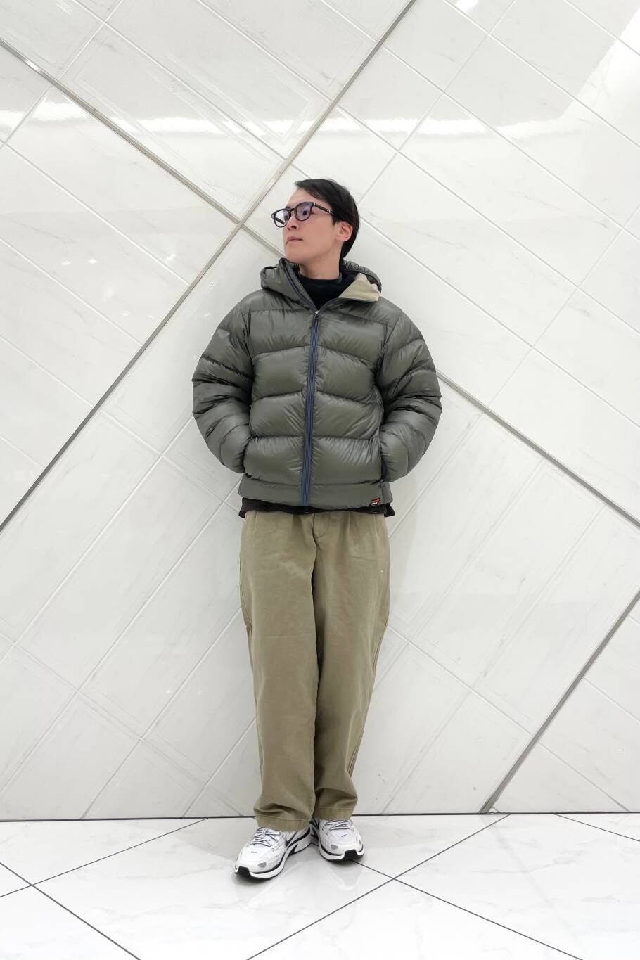EKALのNANGA別注クラシックダウンジャケットと、スタンドカラーフリースを合わせたスタイリングです。