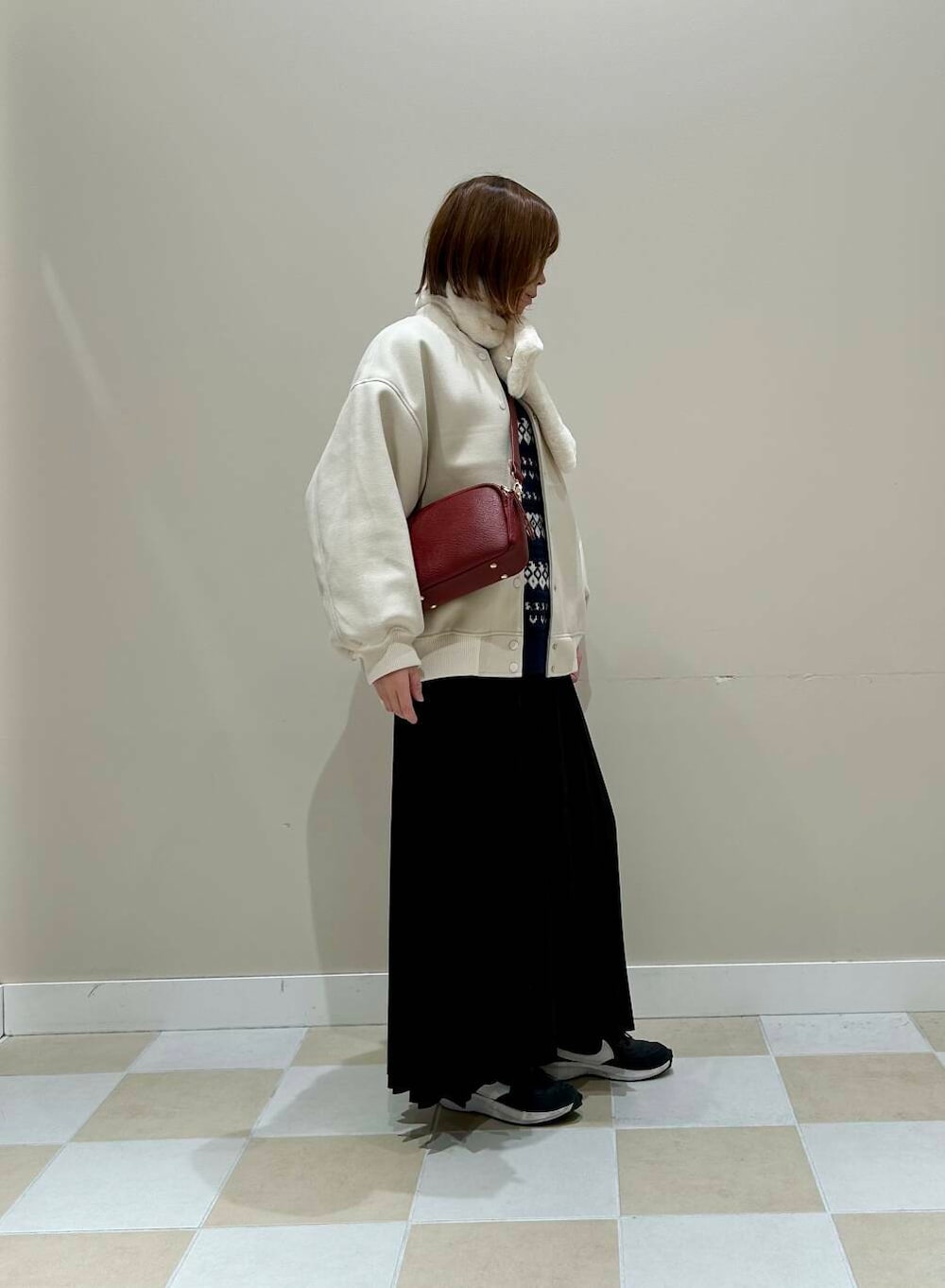 ゆったりしたシルエットが大人可愛いウール調のスタジャン。
