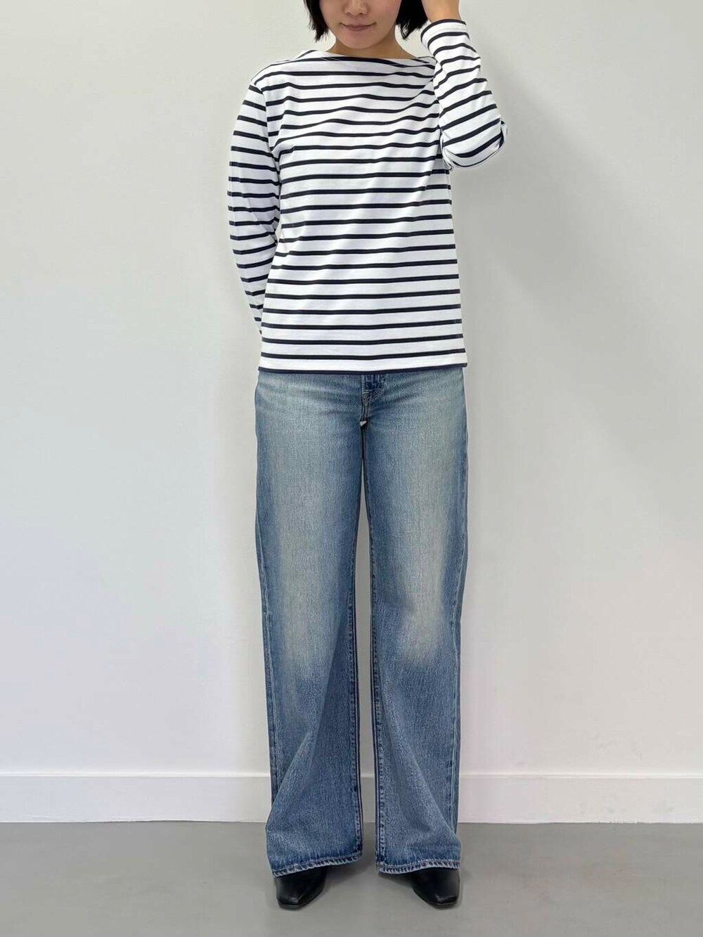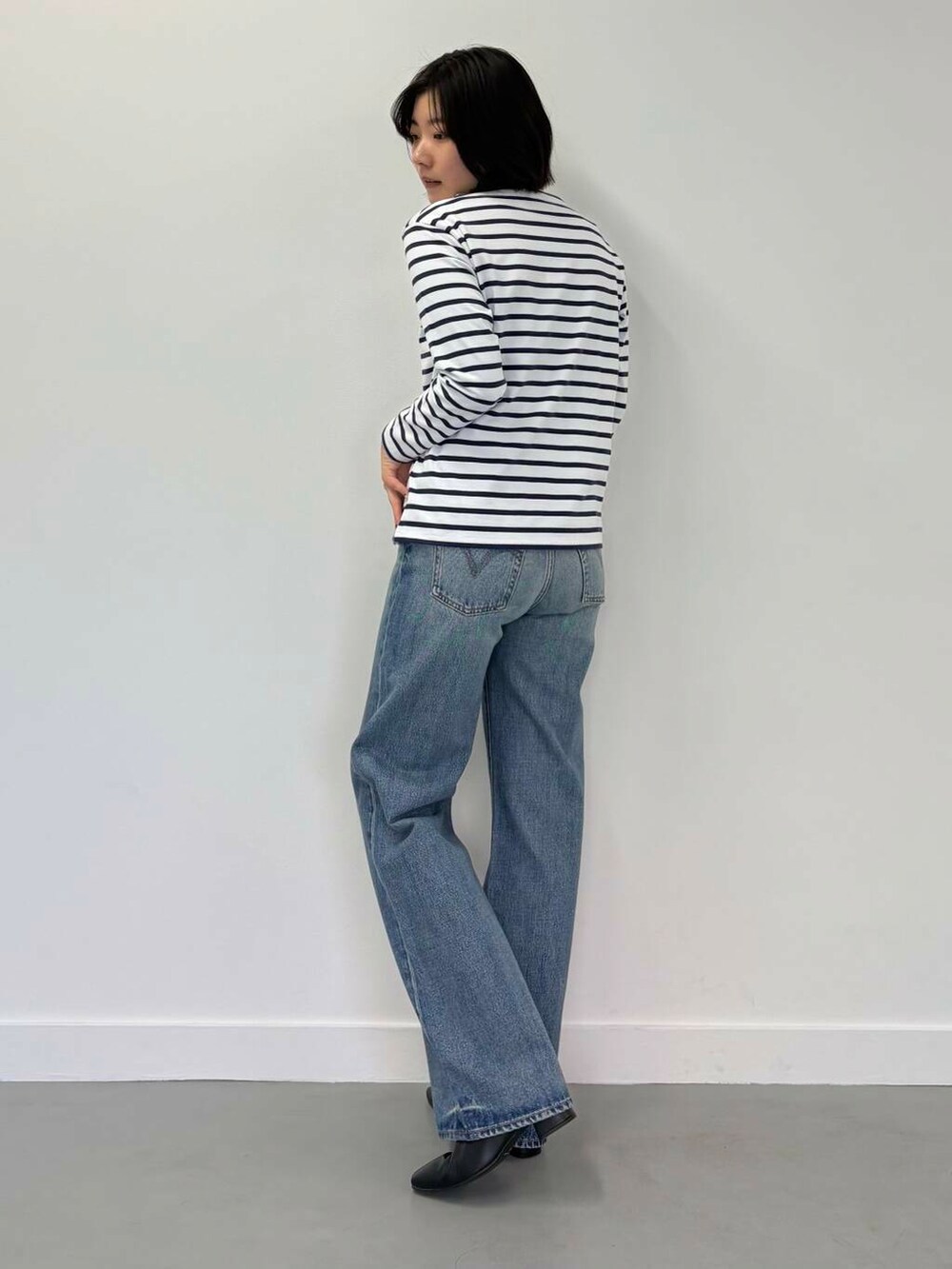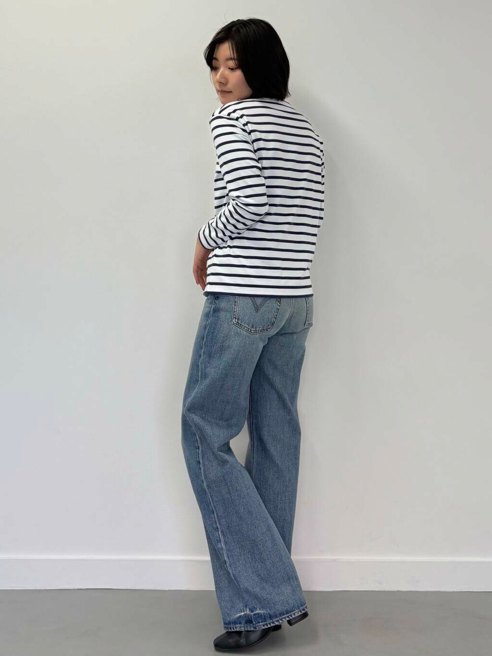 シンプルですがFORK&SPOONの安定のボートネックボーダーにスタイルが良く見えるLevi's Exclusive RIBCAGE WIDEのデニムを履いてみました!169cmでサイズ26を着用してヒールを履いて裾がつかないぐらいです!🙆♀️