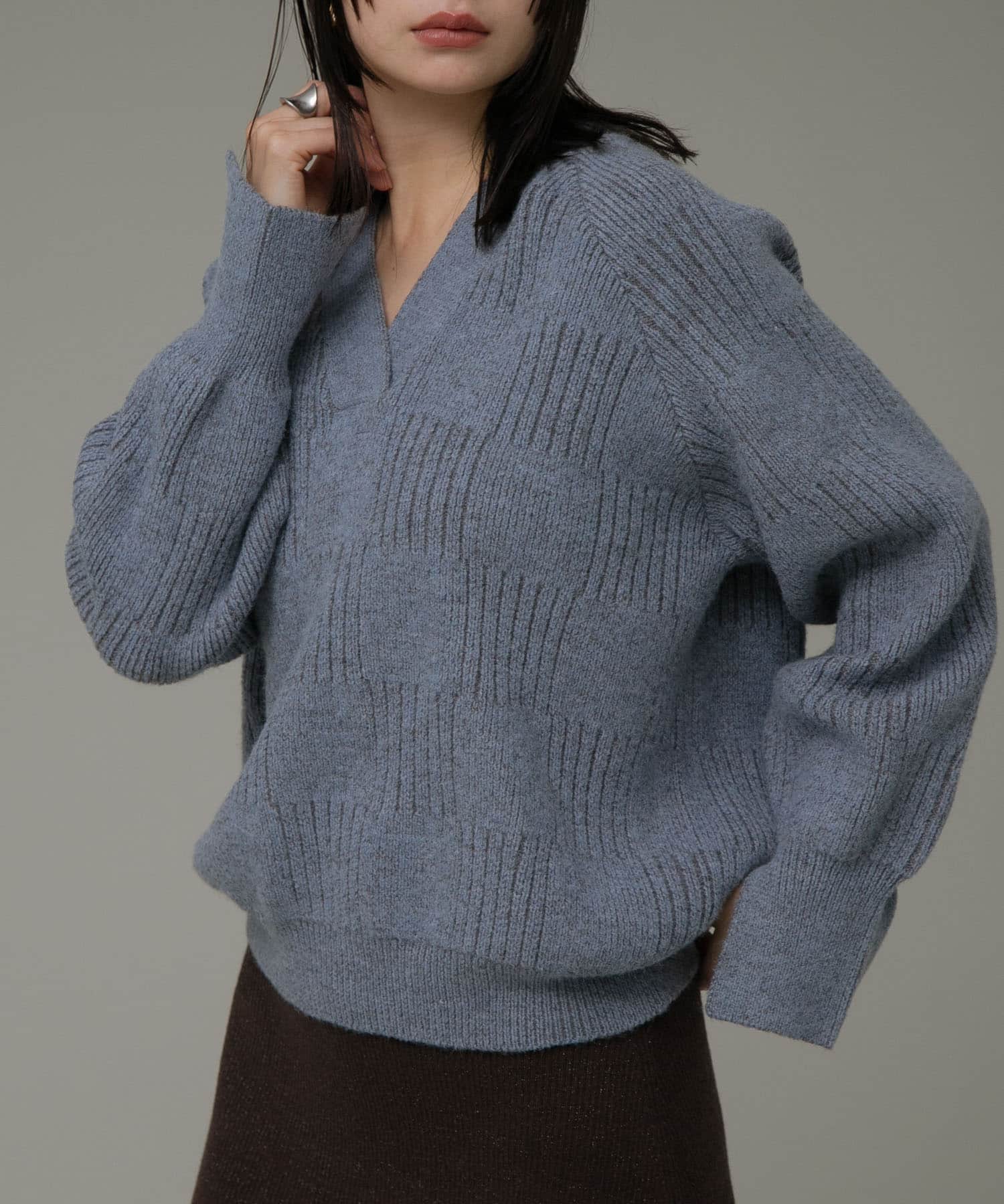 Vネックニットは、袖口にもカットが入っているのがポイント。