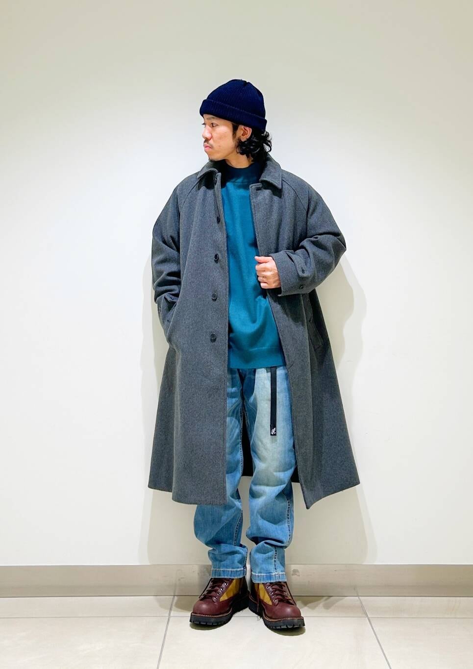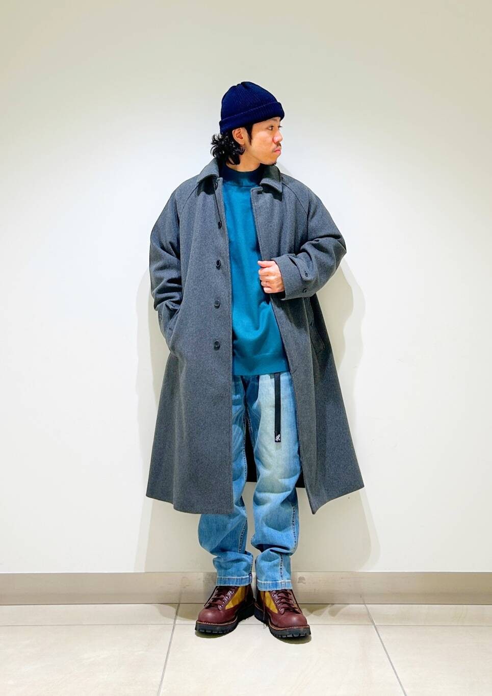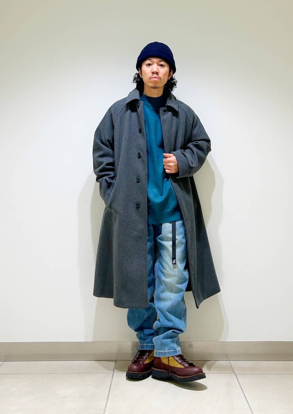 今回はニットメルトンコートとグラミチ別注デニムパンツを使用したコーディネート。