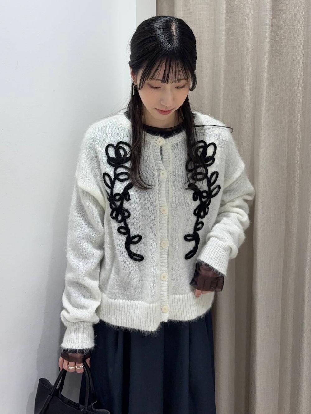 コードのデザインがポイントのカーディガンは主役になるアイテムで、細かいラメが華やかで上品な印象になります♪