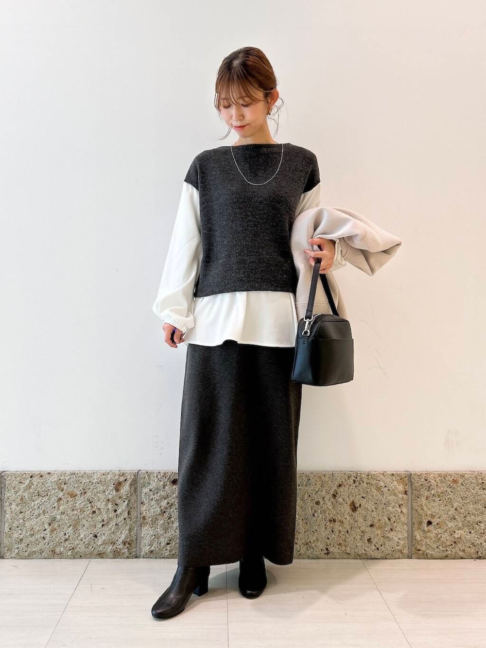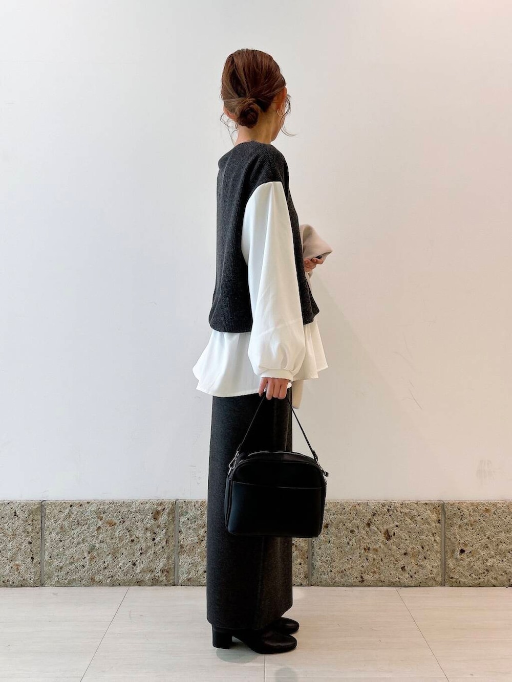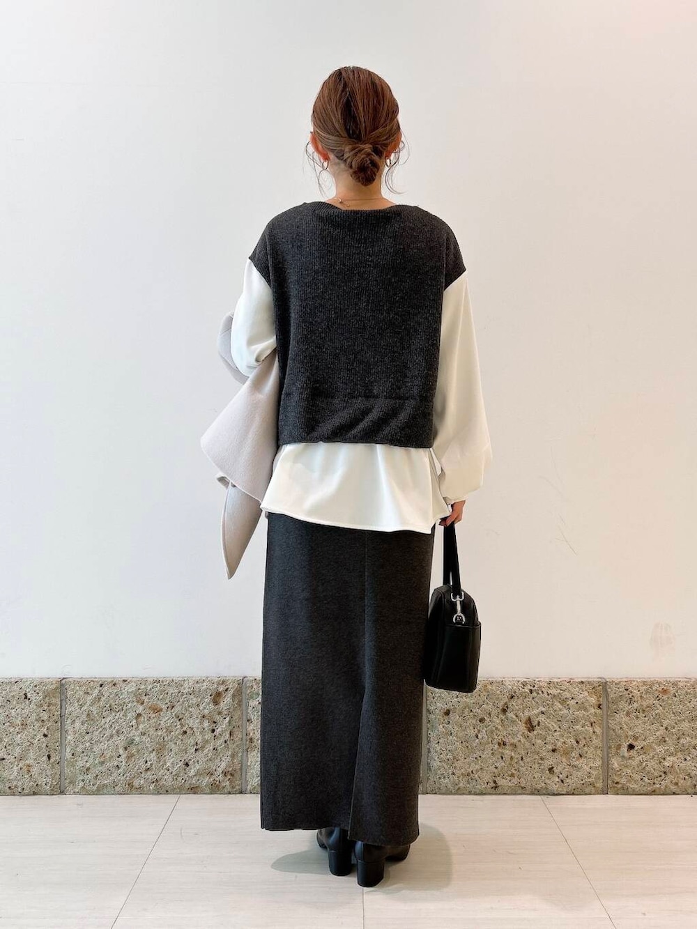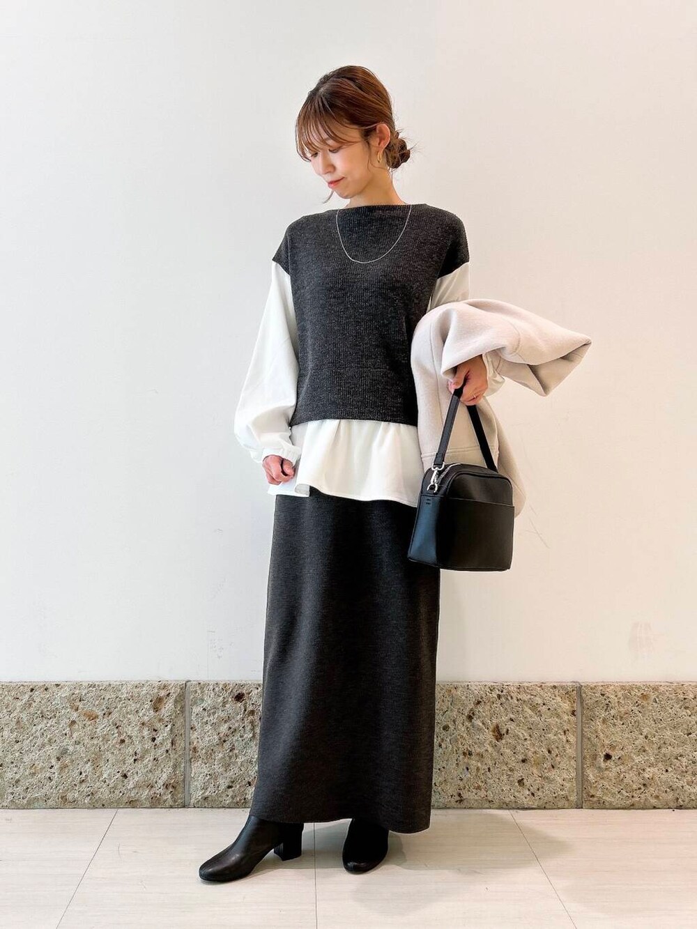 トップスはブラウスにベストを重ねたようなデザインで