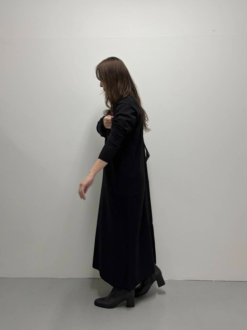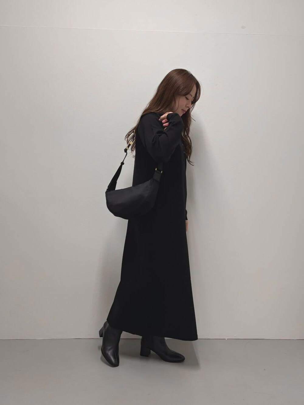 ワンピースは足首が隠れるくらいの丈感で、スニーカー合わせでもすっきりと着用できます。