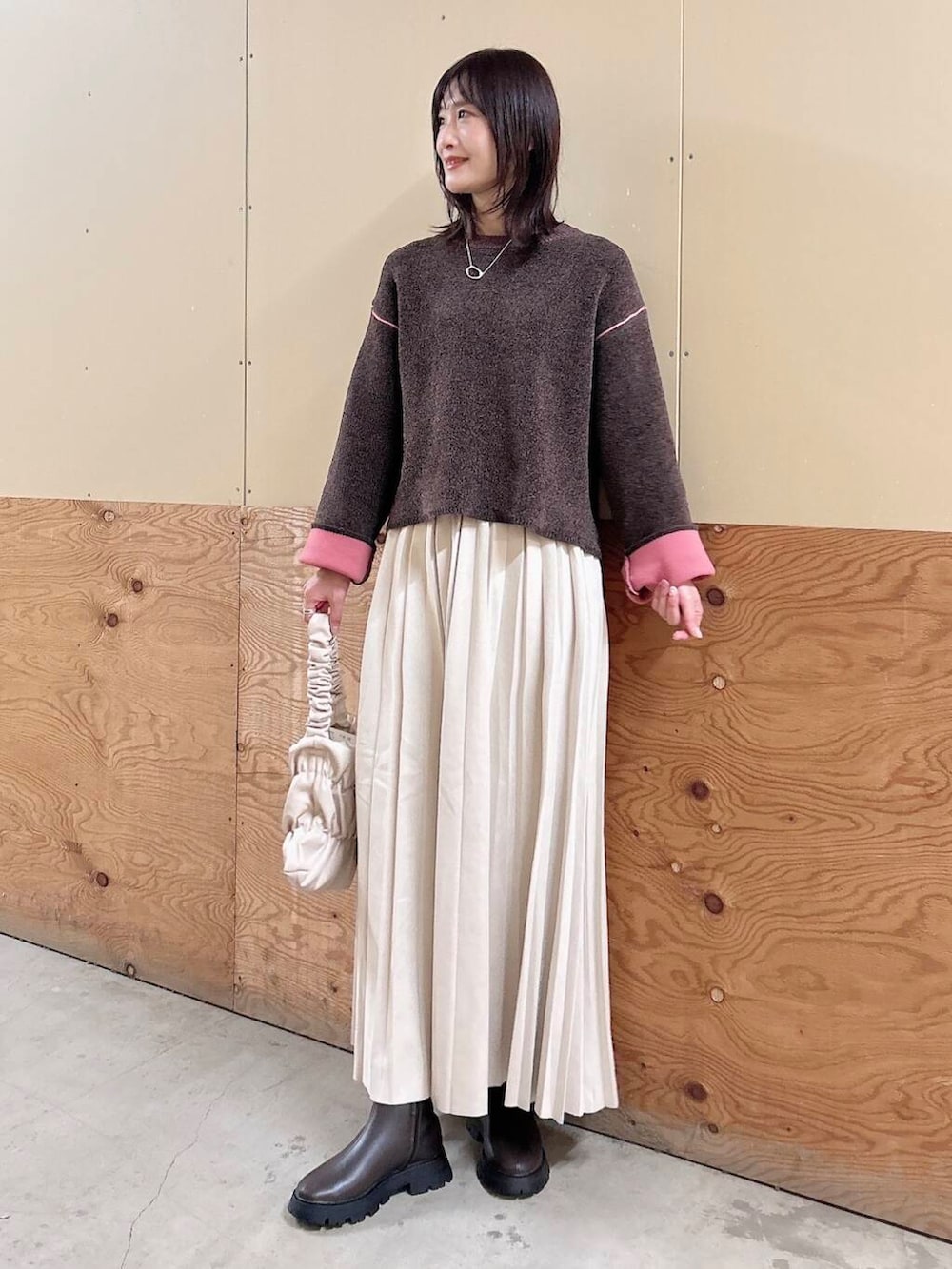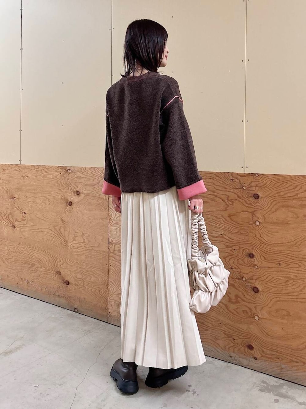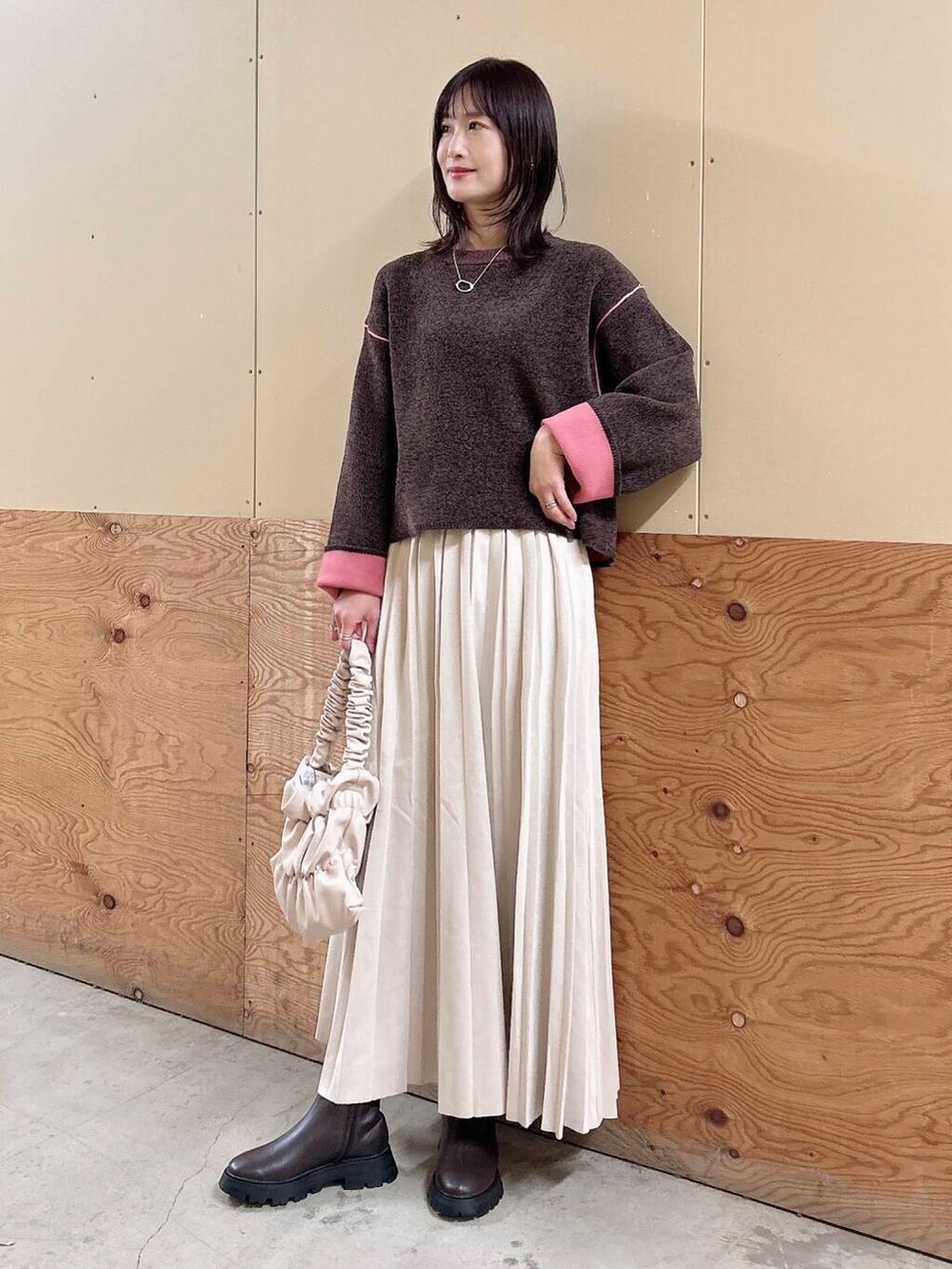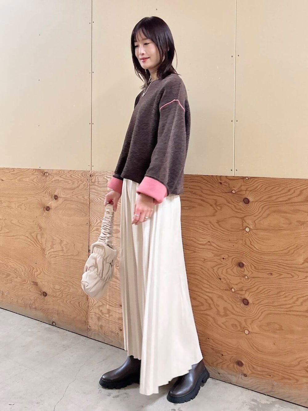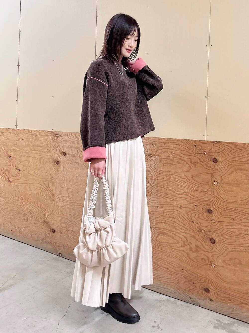 ✔︎スカートは滑らかで落ち感のあるフェイクスエード生地で、ウエストもゴムなので楽に履けます♪春先まで重宝しますよ🥰
