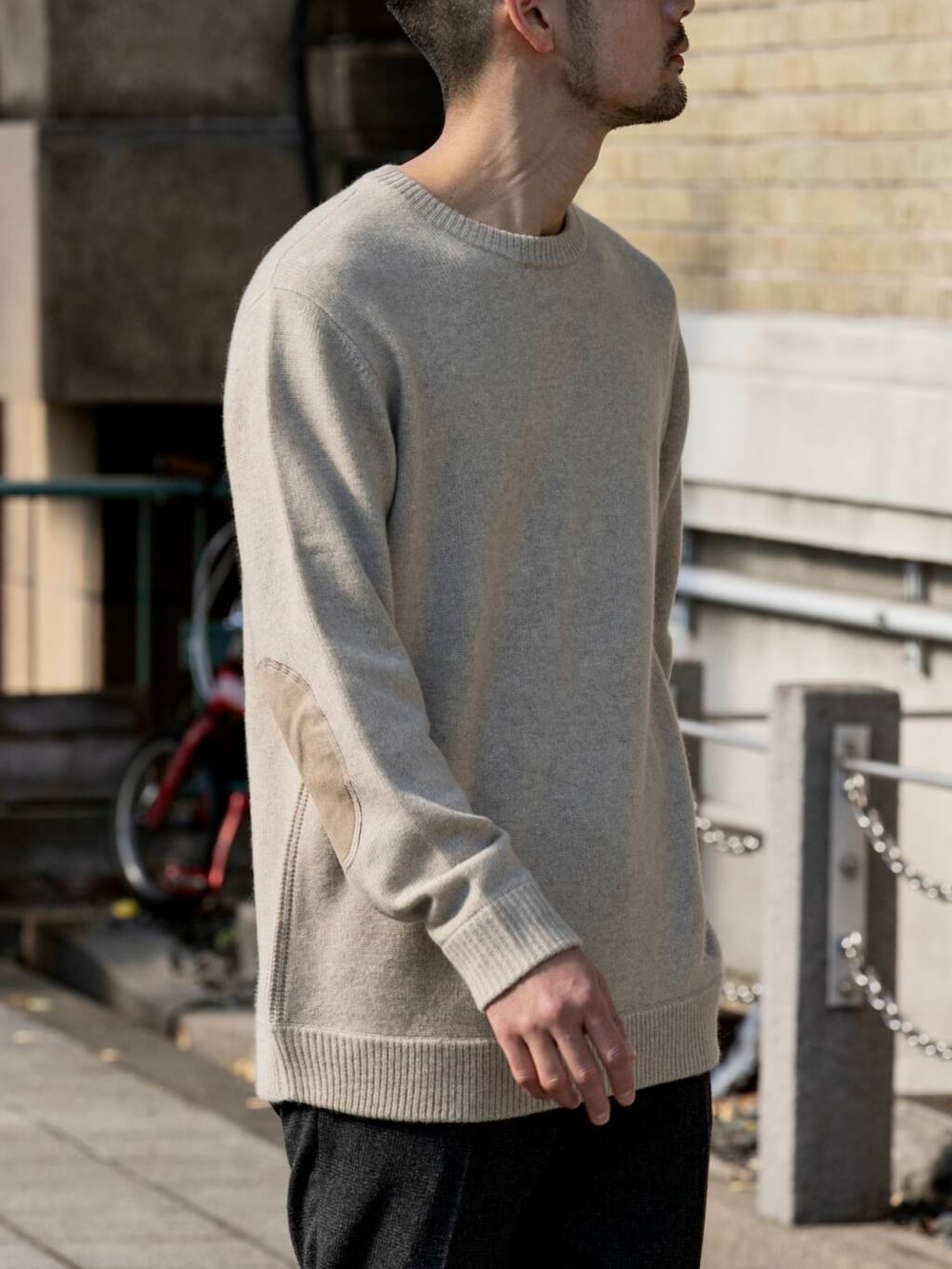柔らかなハミルトンウールにエルボーパッチ、1枚でもアピールできるニット。