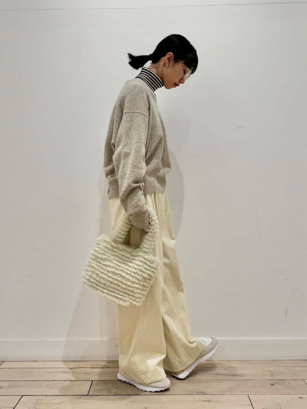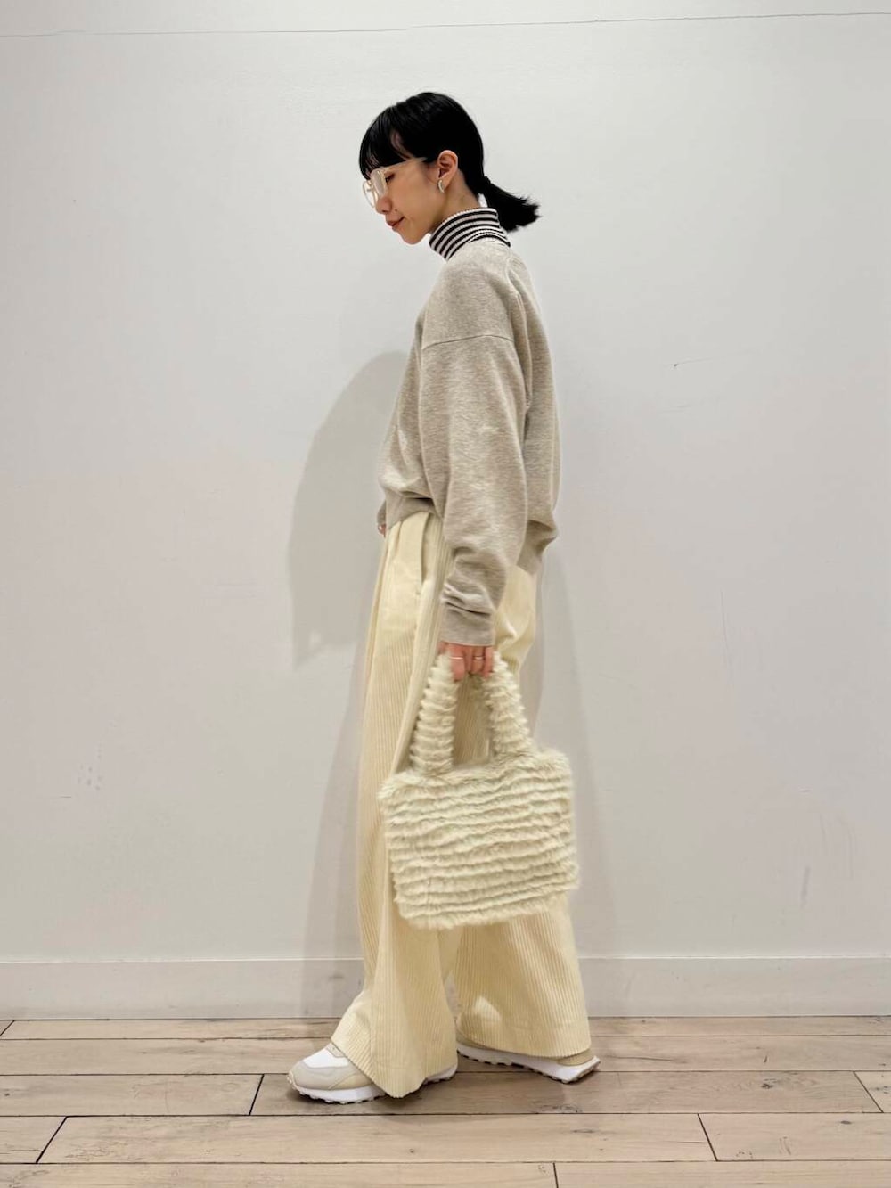 全体的に淡めのベージュを選んだので、インナーのボーダータートルで濃いめの色を入れて少し引き締めました!