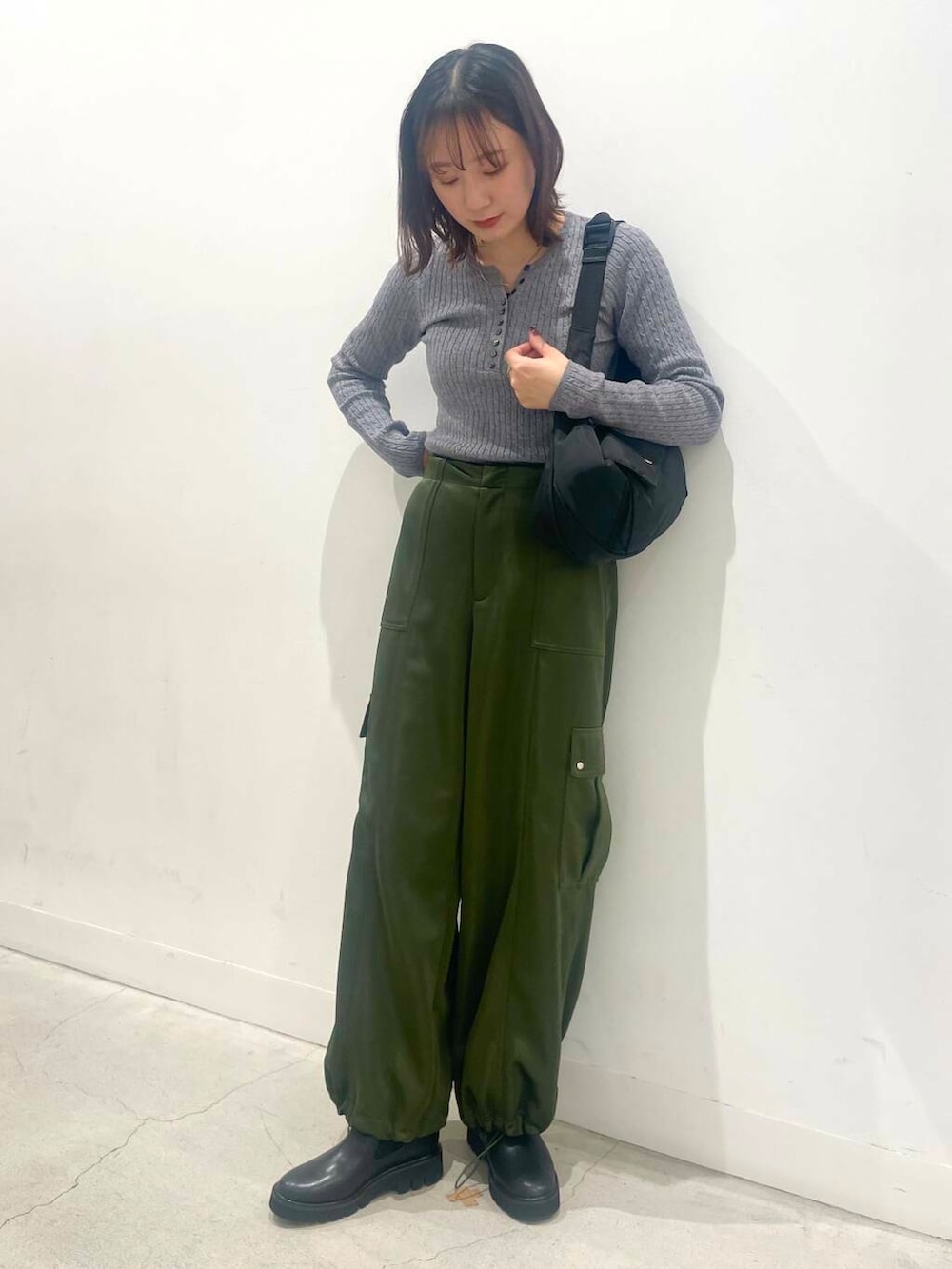 カーゴパンツは光沢感のある生地でカジュアルすぎないアイテム!