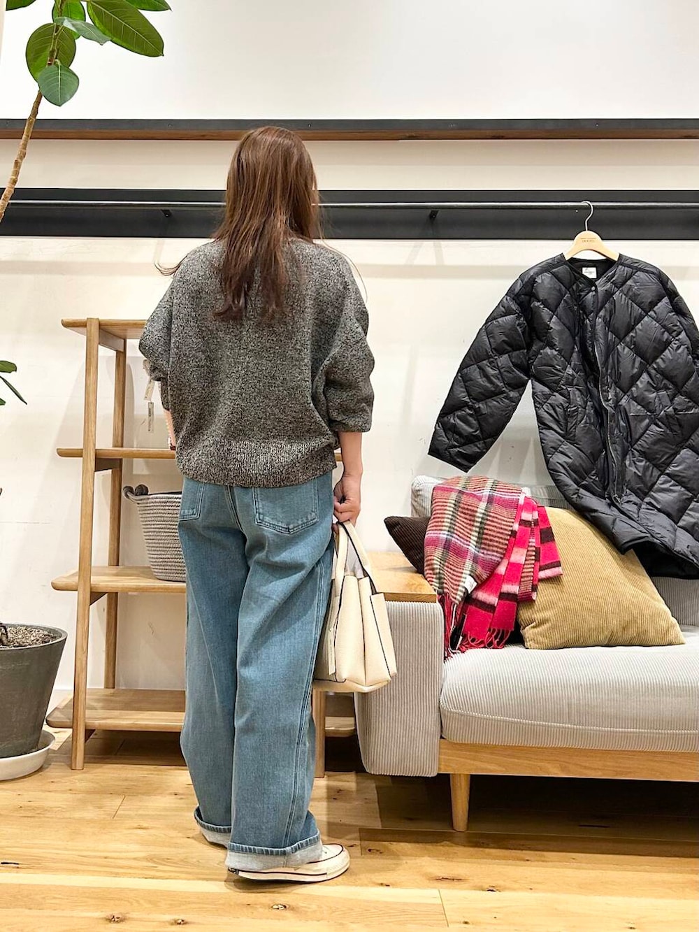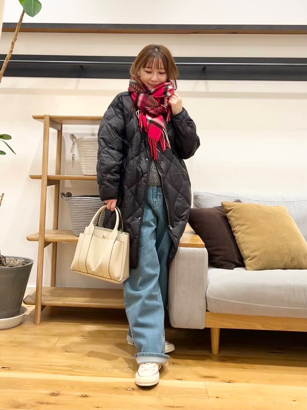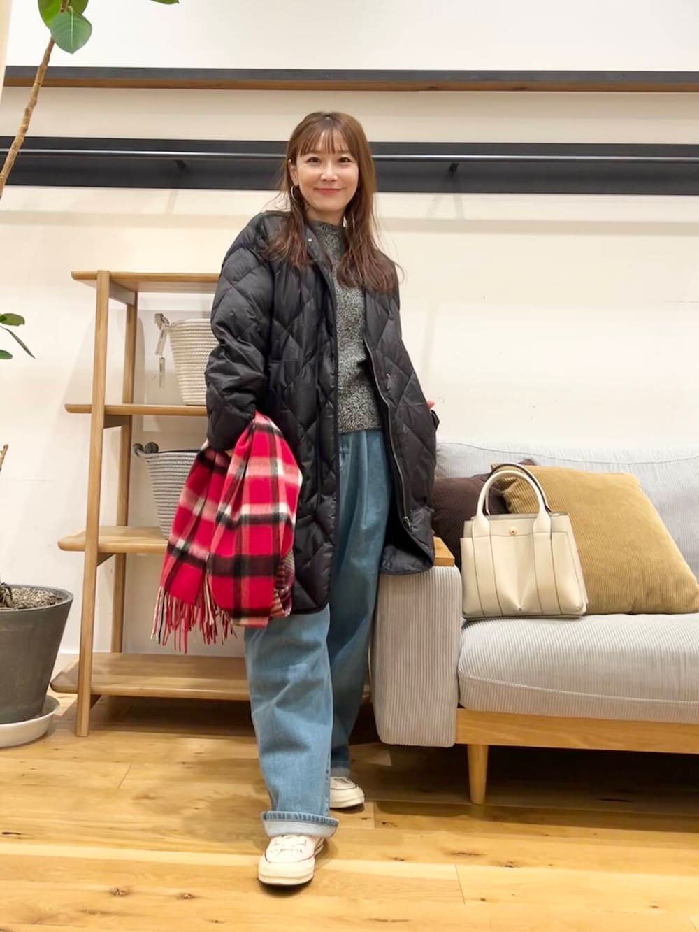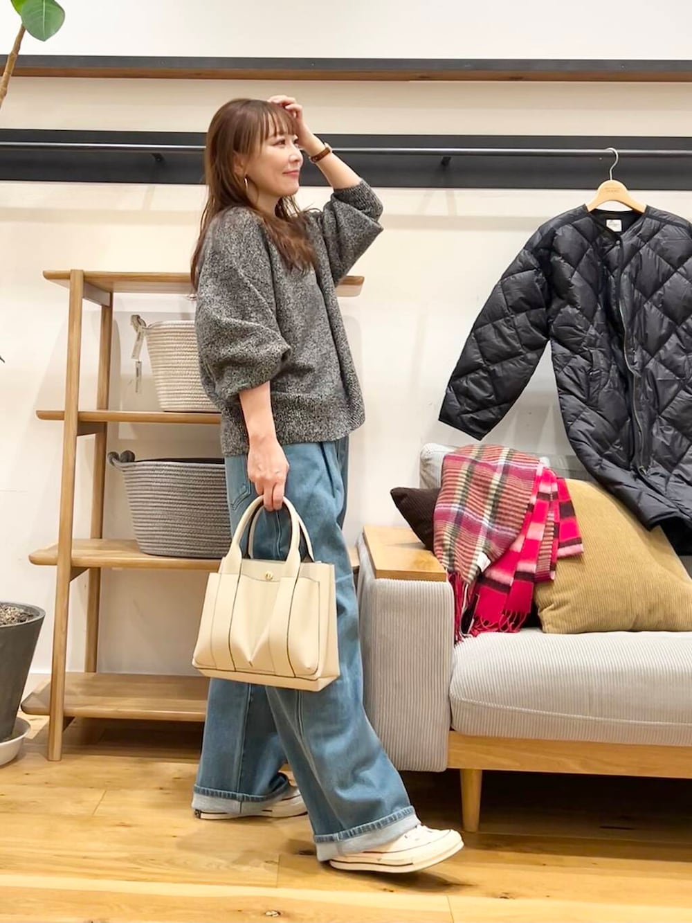 今回はトップス短めでもお尻周り腰回りがゆったり気にならない太めの裏起毛タックデニムパンツを合わせてます。