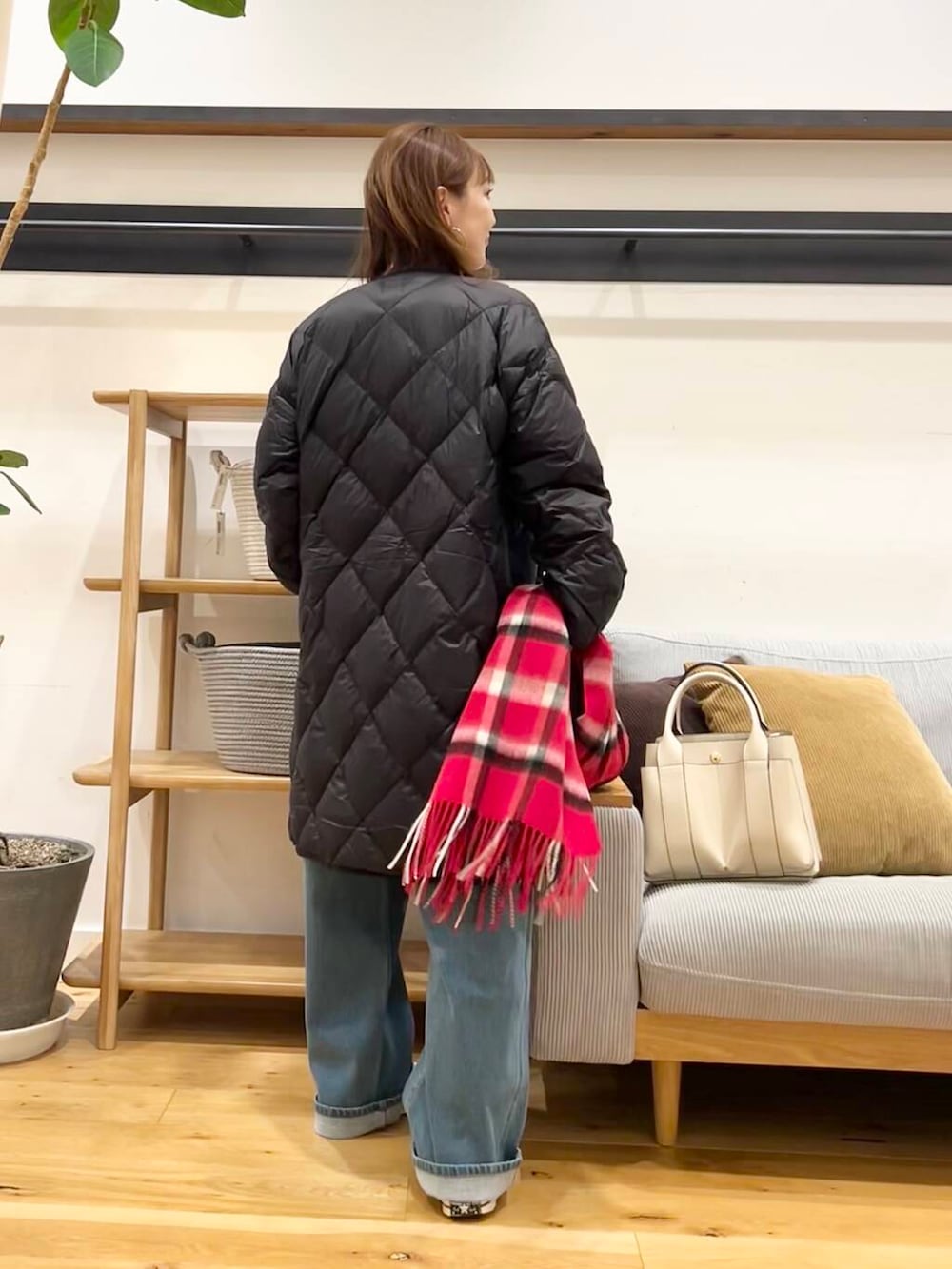 アウターにはライトダウンキルトロングコートを着ています。 ドアーズではもう大人気のこちら。ノーカラーなのでタートルネックやストールも色々楽しめます♪ 脱いで手に持つのも負担にならない軽さ、ふんわり体温を含んで膨らむダウンがとっても暖かです。(^^)