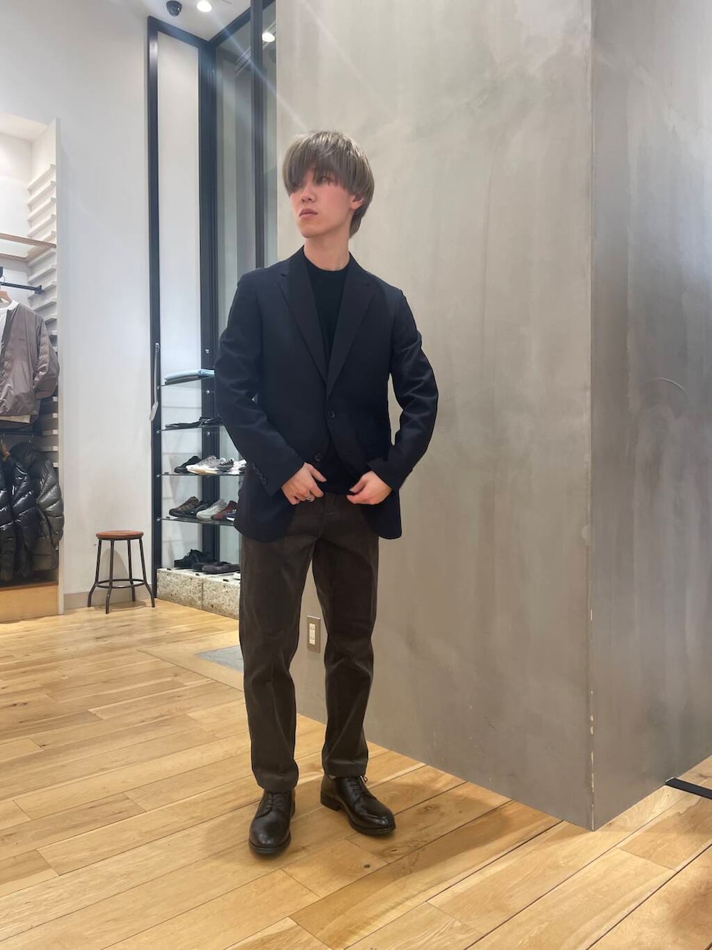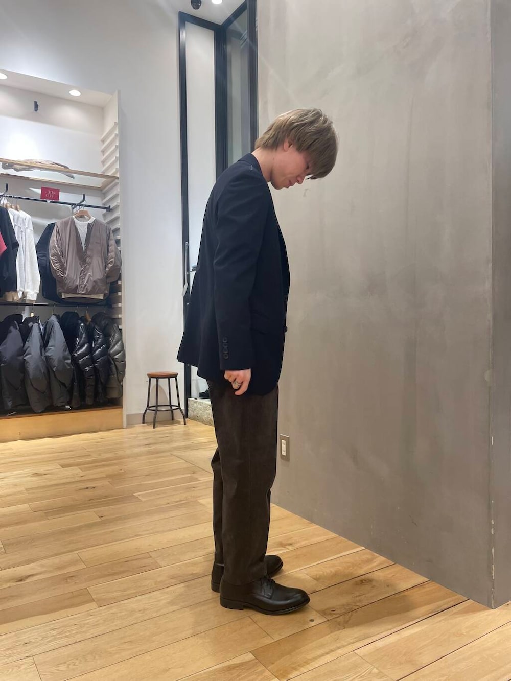 深みのあるオリーブカラーのコーデュロイパンツと全体的にダークトーンでまとめることで、ドレススタイルに程よいカジュアルさを取り入れました。