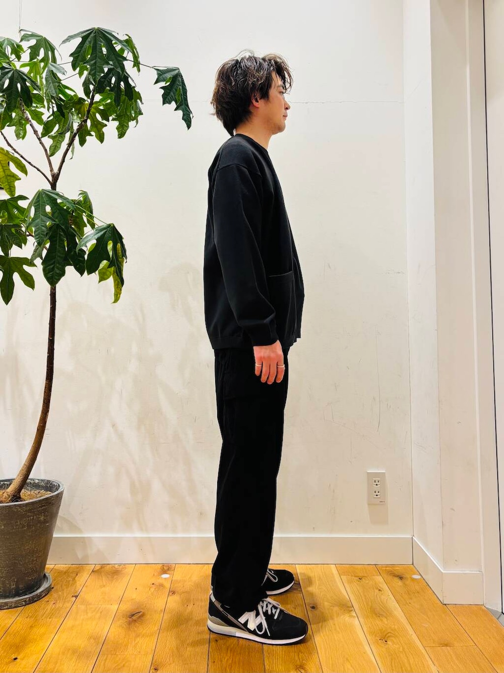 全身ブラックのアイテムで合わせていますが各アイテムのデザインや生地を変えてるのでオールブラックでもシンプルに見えないようにしてます。