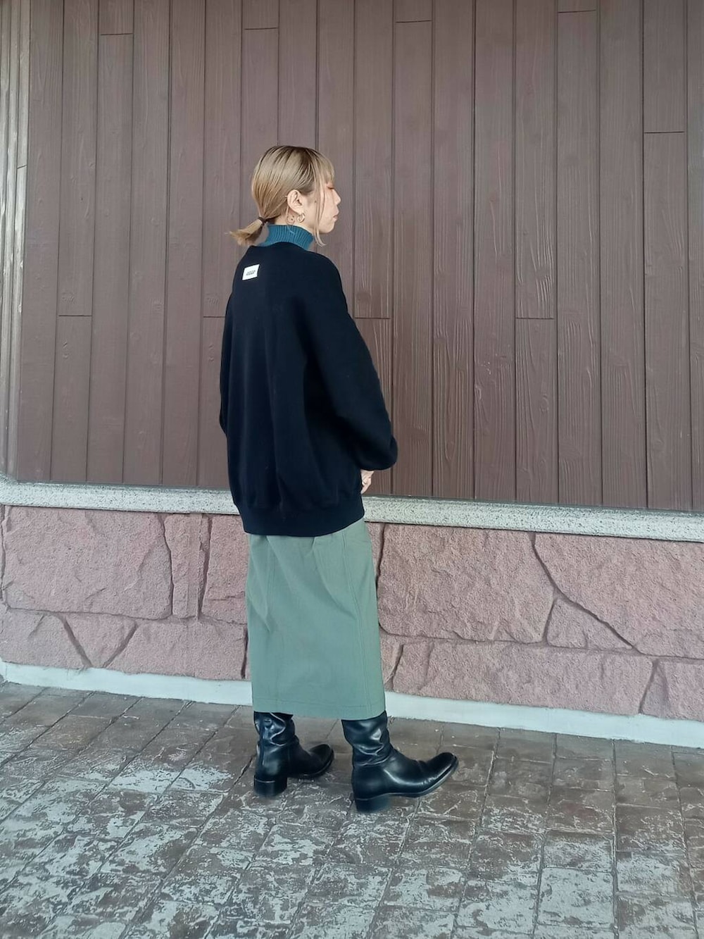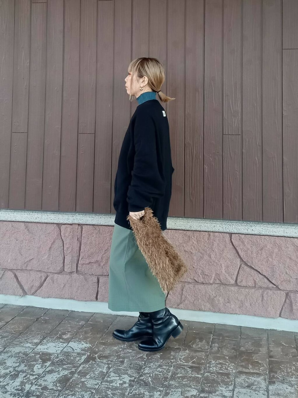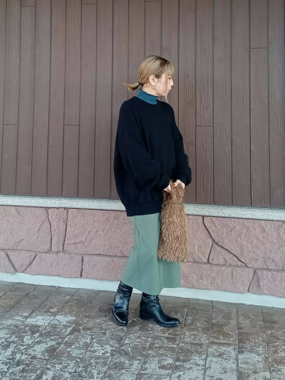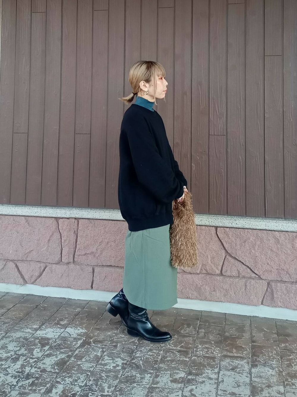 中に着たハイネックニットはタイトな作りでインナーに最適。カラバリも豊富で差し色にとても使える薄手のリブニットです。