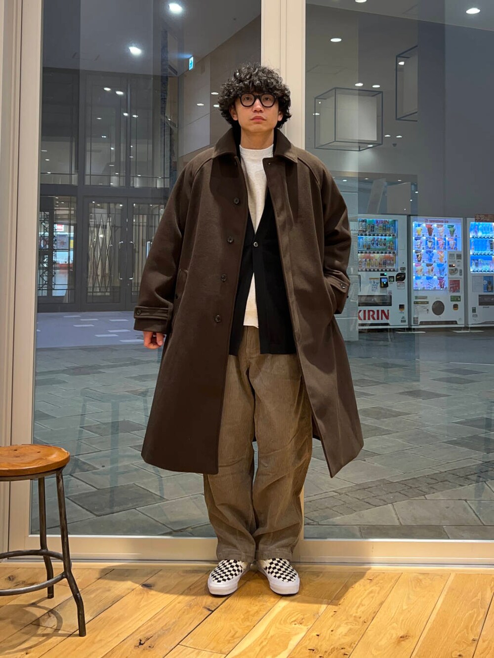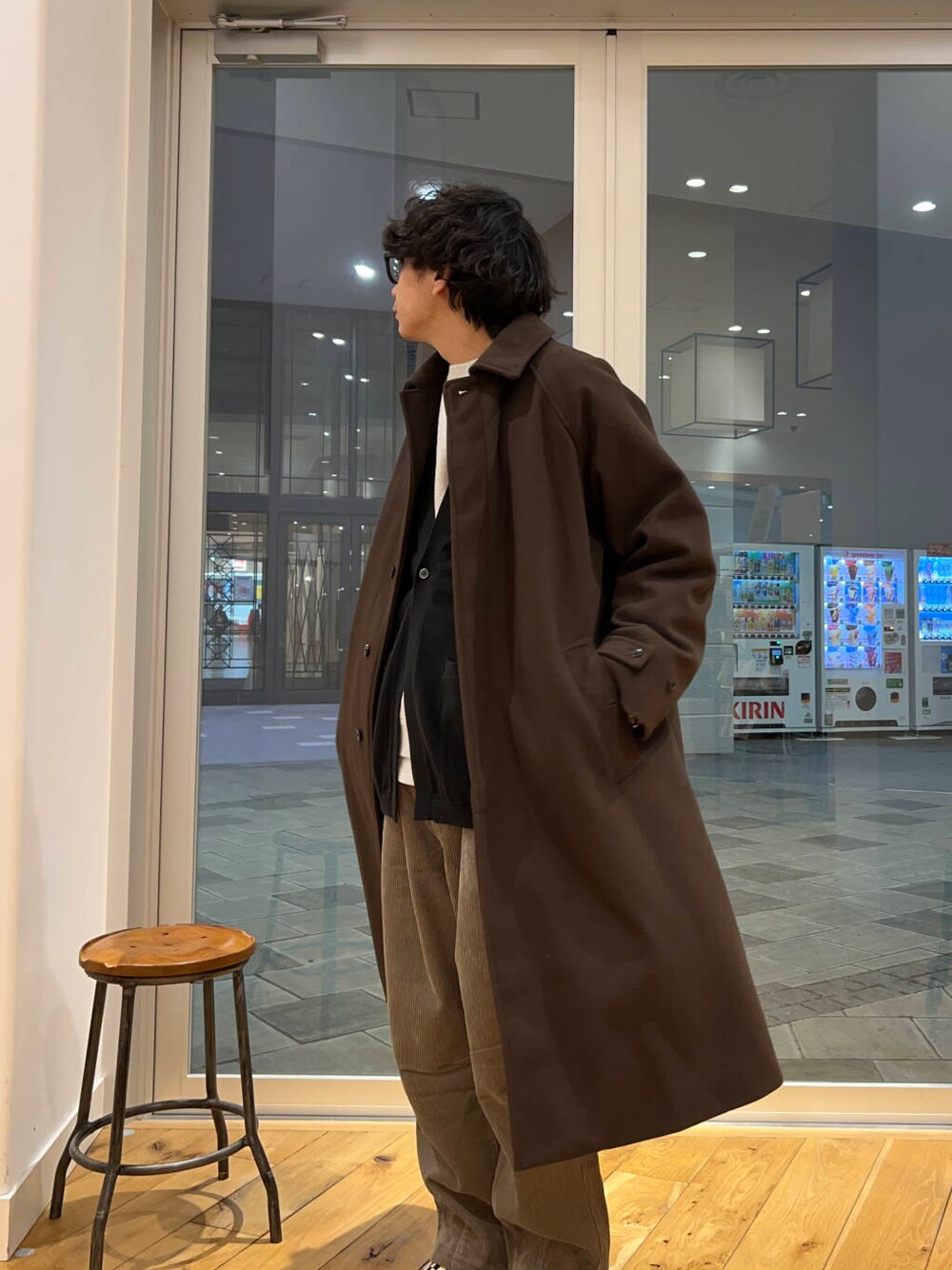 同系色の太畝のコーズと合わせて綺麗だけど少し着崩したコートスタイリング