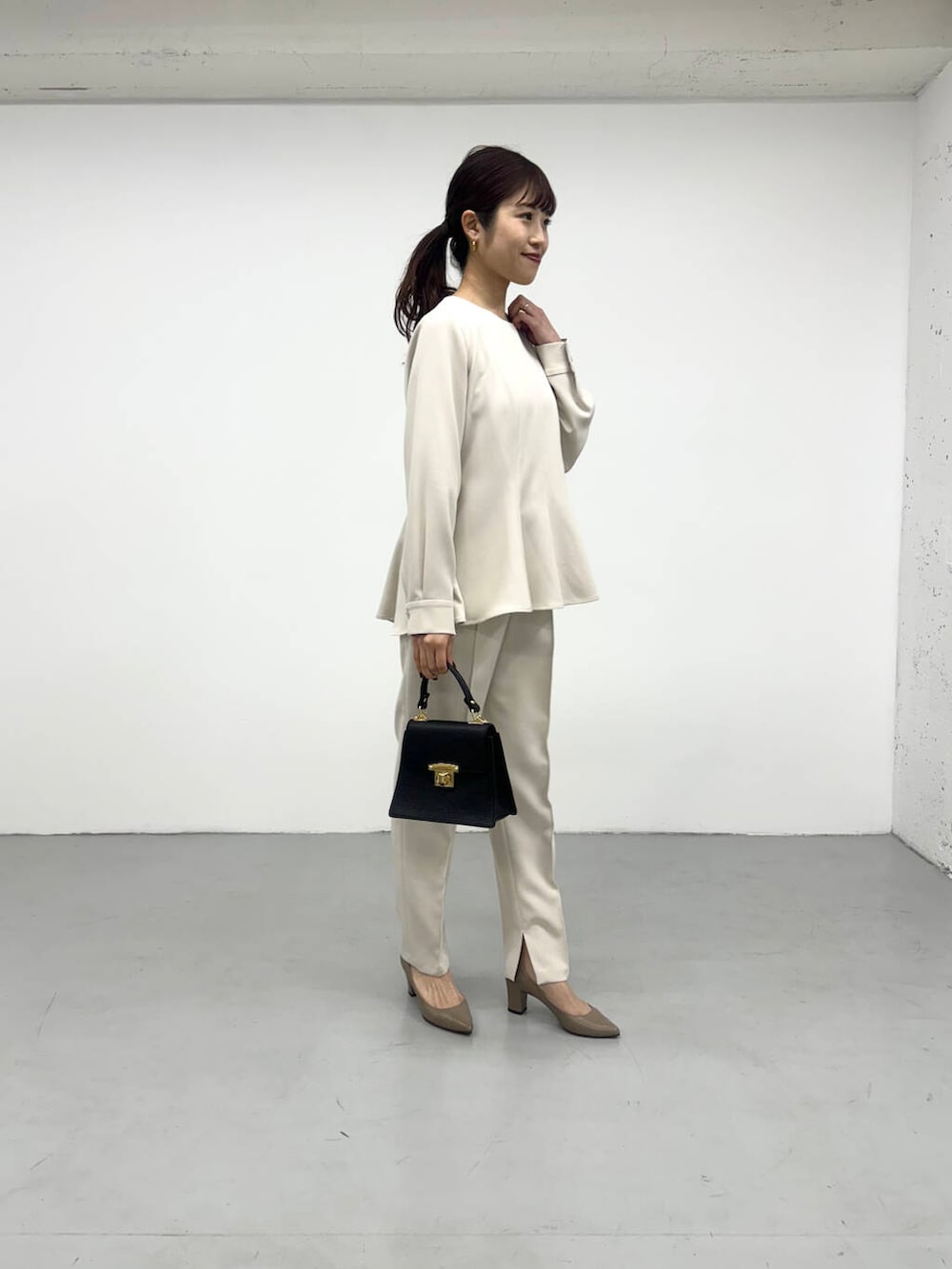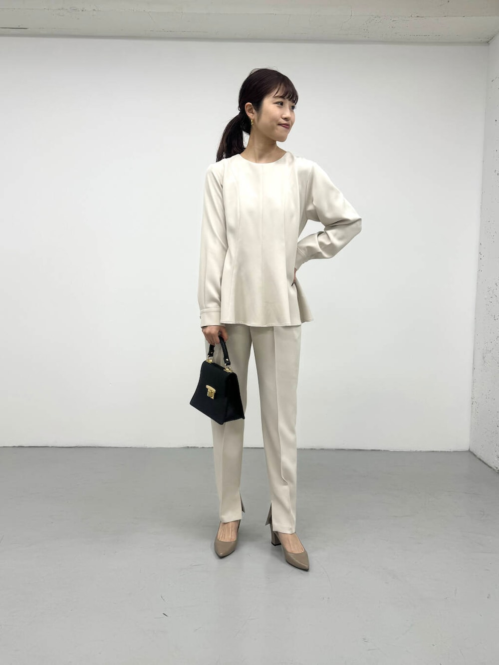 パンツの裾スリットは美脚効果もあるので、ヒール無しのパンプスでもスタイルが良く見えますよ◎