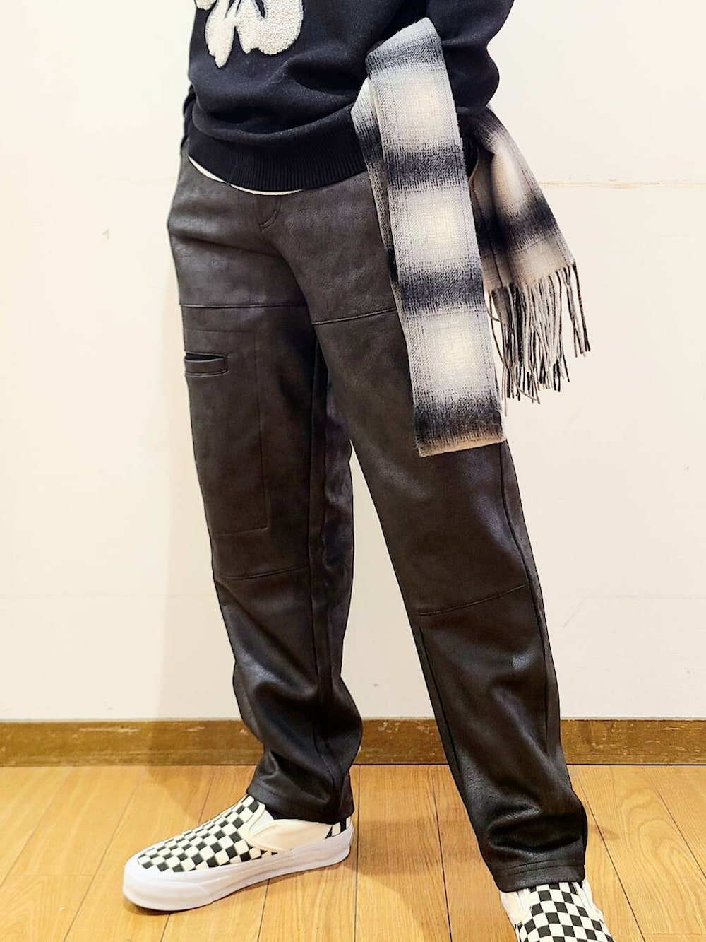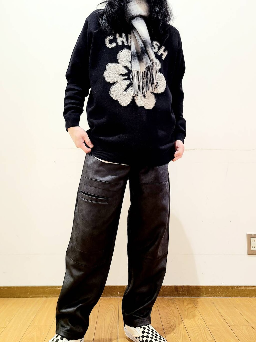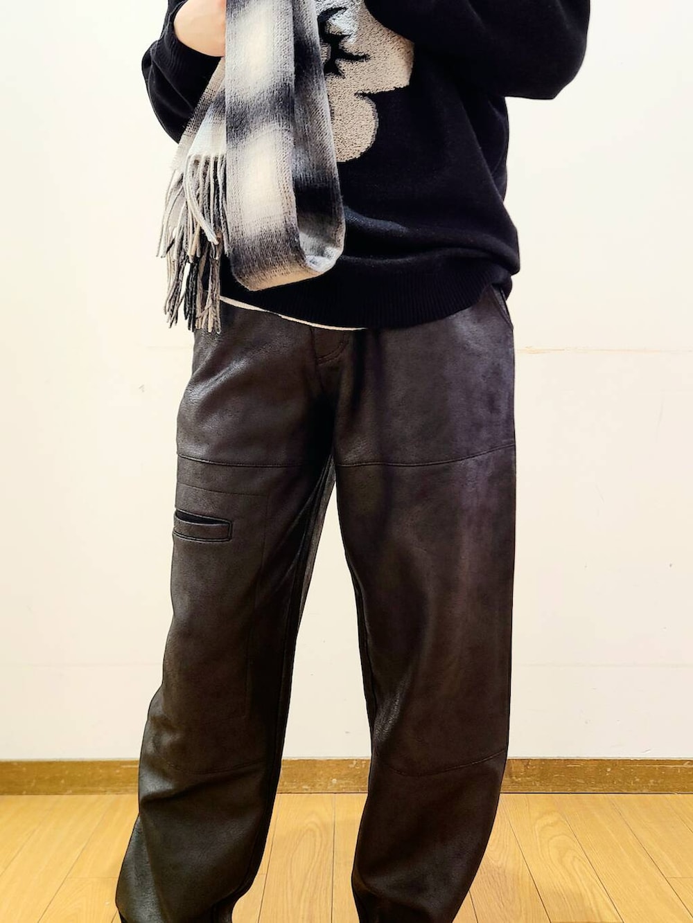フェイクレザーパンツは一見強めの印象ですが、すっきりシルエットでどんなコーディネートにもマッチします。