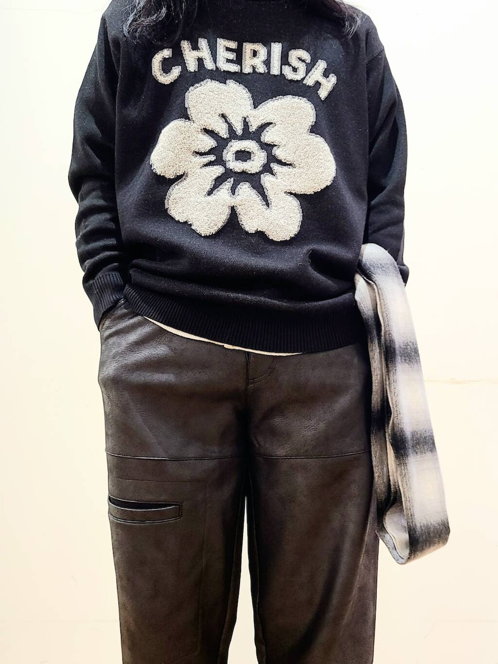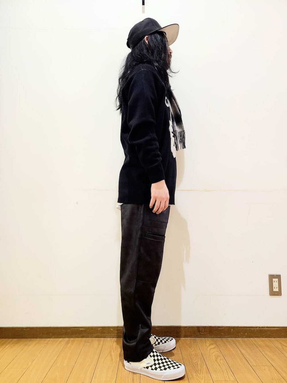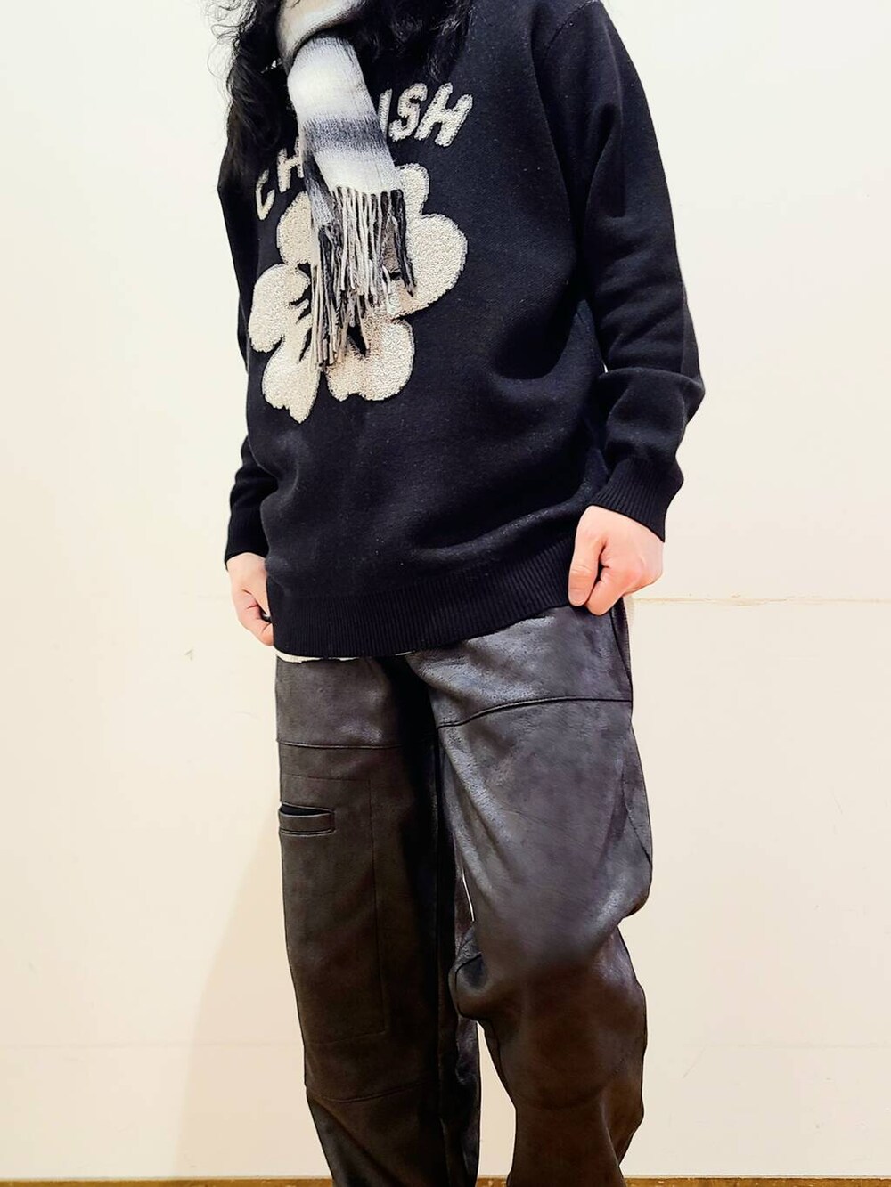 フェイクレザーパンツは一見強めの印象ですが、すっきりシルエットでどんなコーディネートにもマッチします。