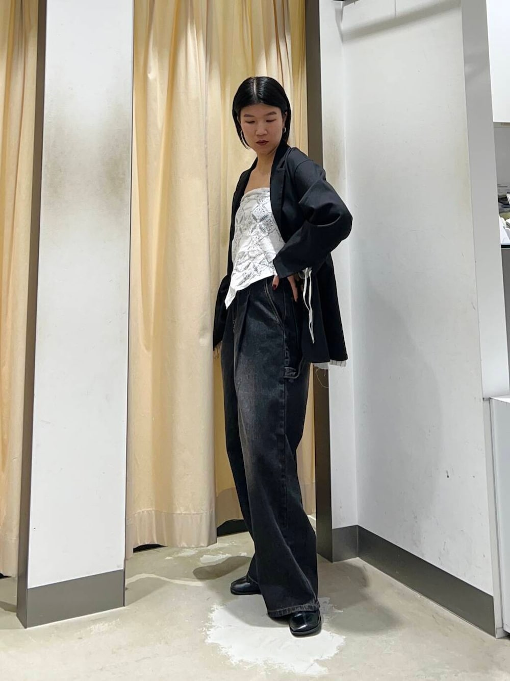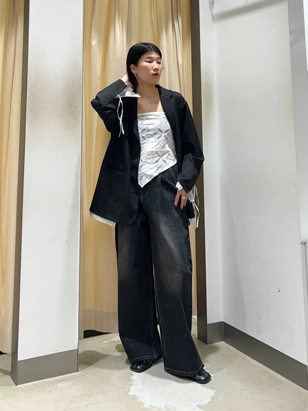 インナーに巻いたレースはそれだけで春らしさをプラス