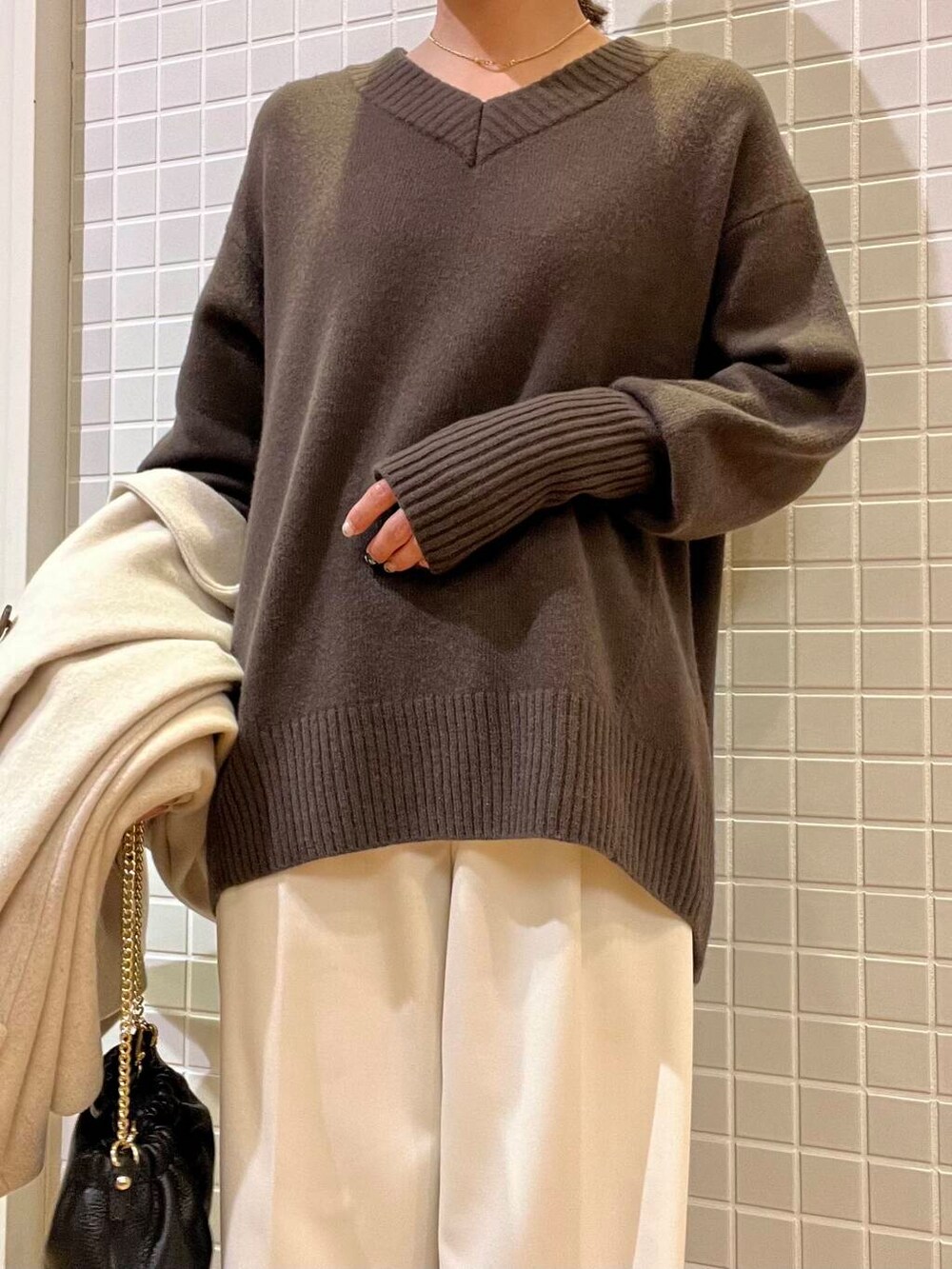 Vネックのニットは袖の長めのリブが可愛いポイントのひとつ。