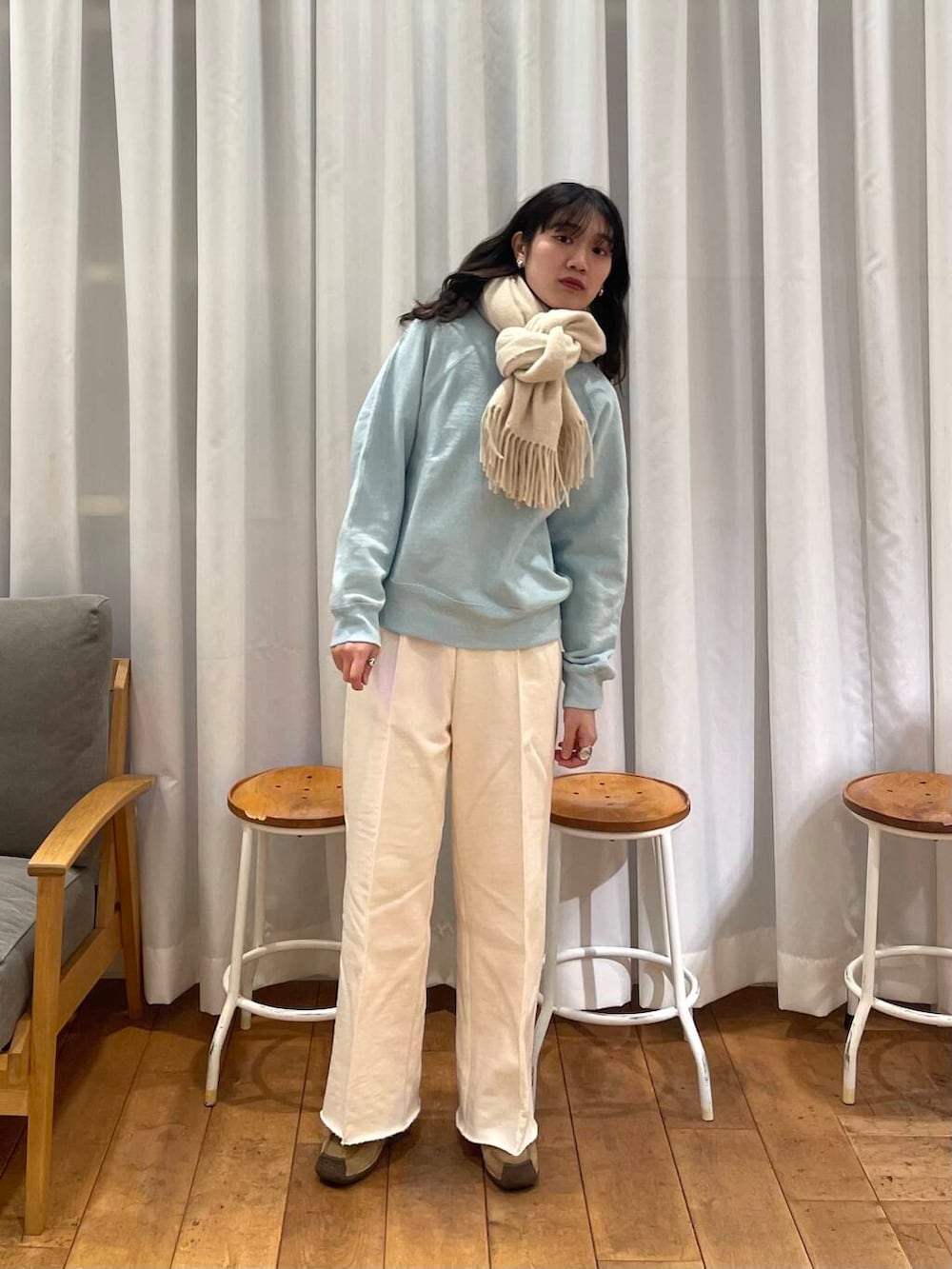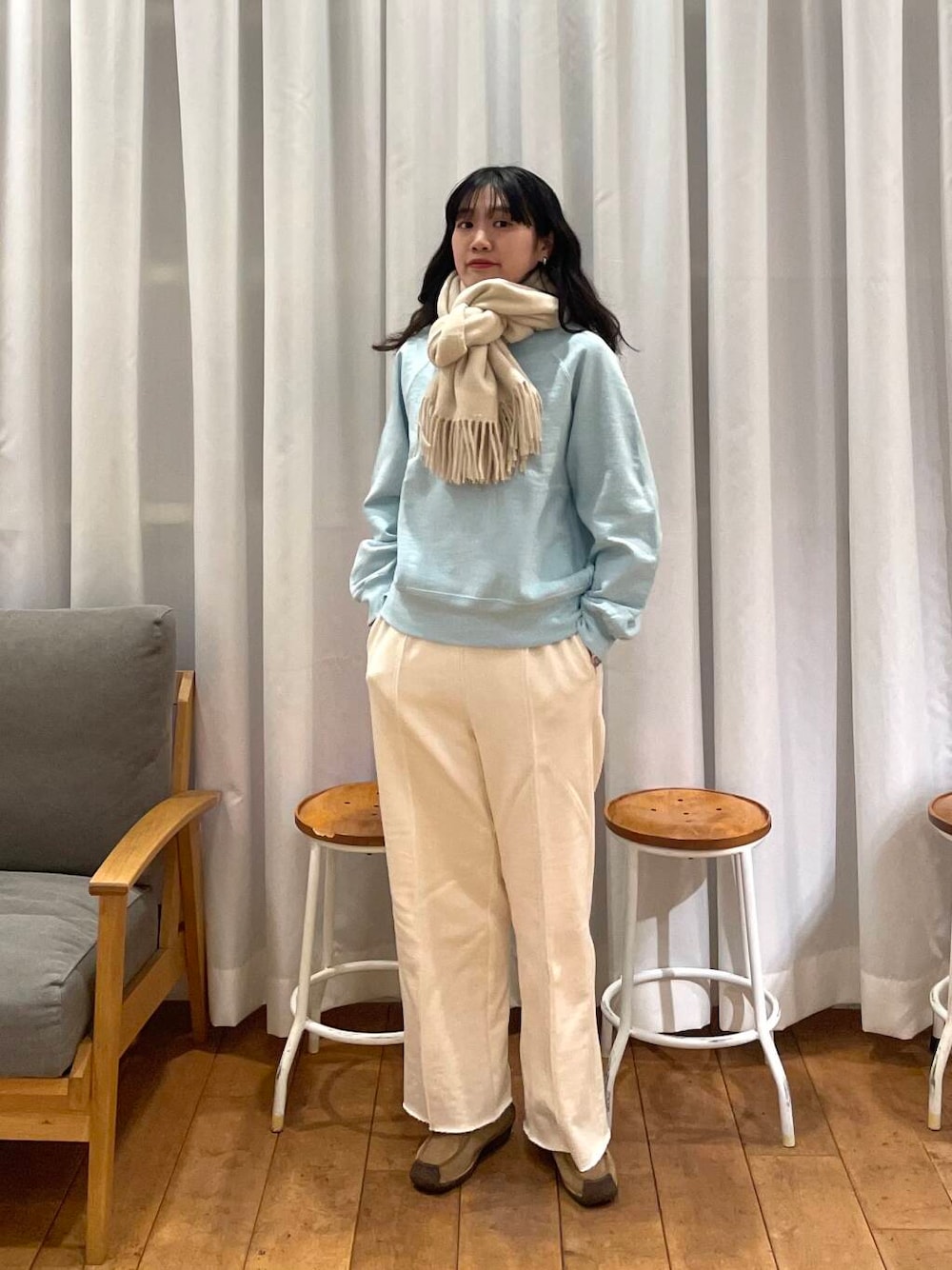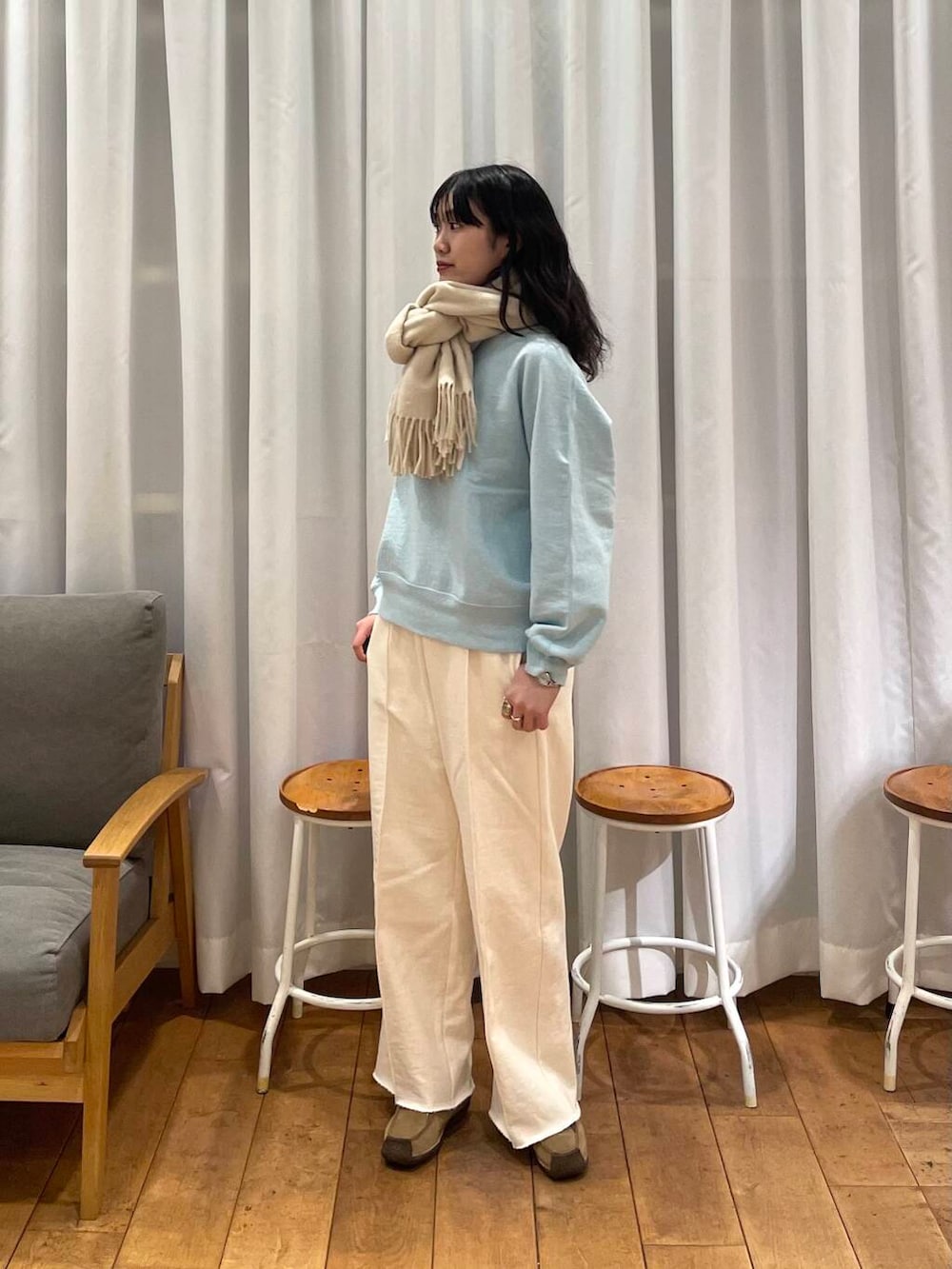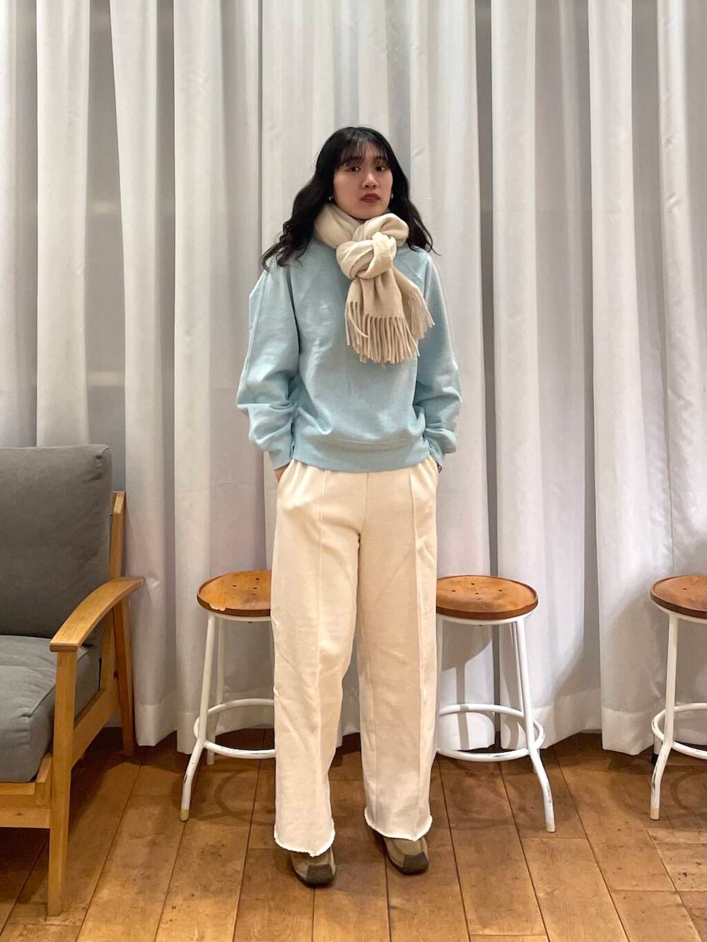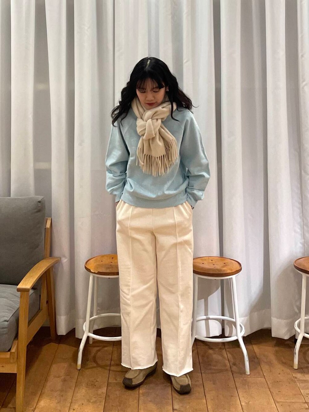 首元にはパンツと同じアイボリーのマフラーをして、爽やかさ増し増しでお出かけしたいです☺️
