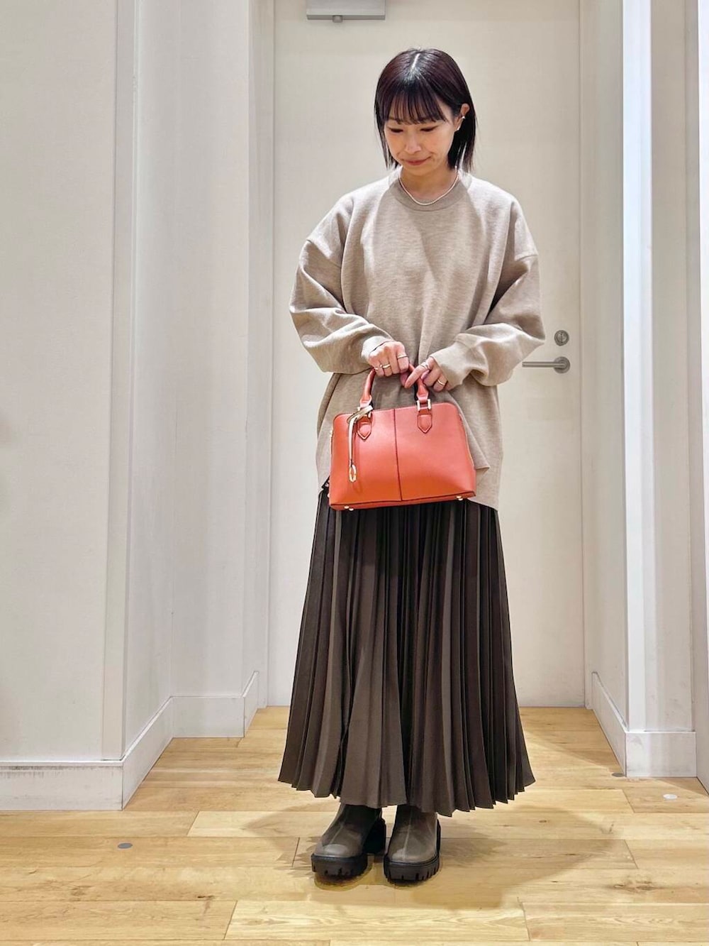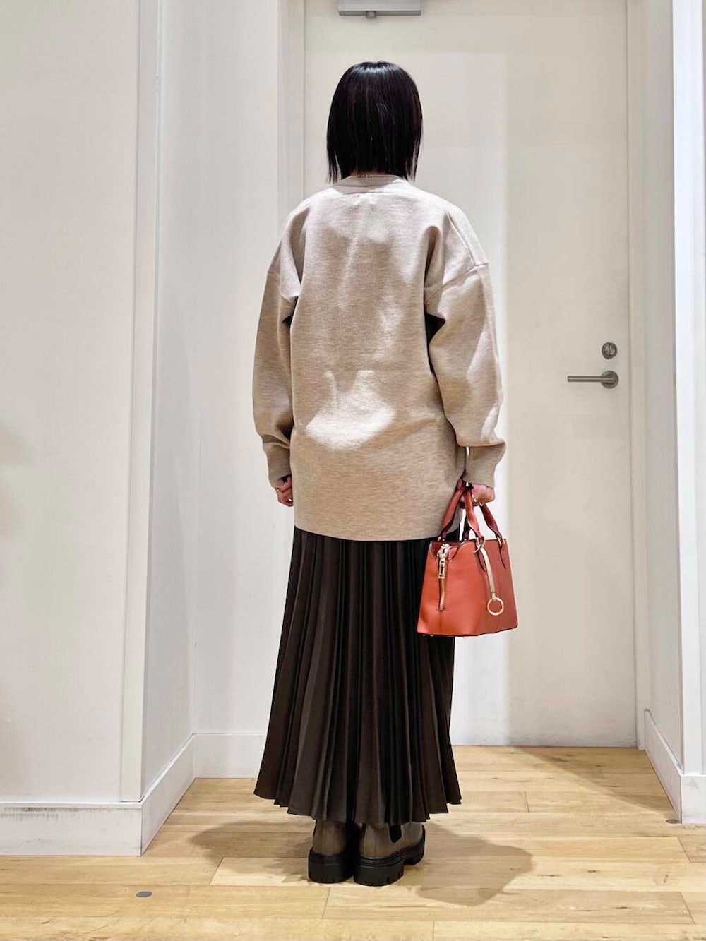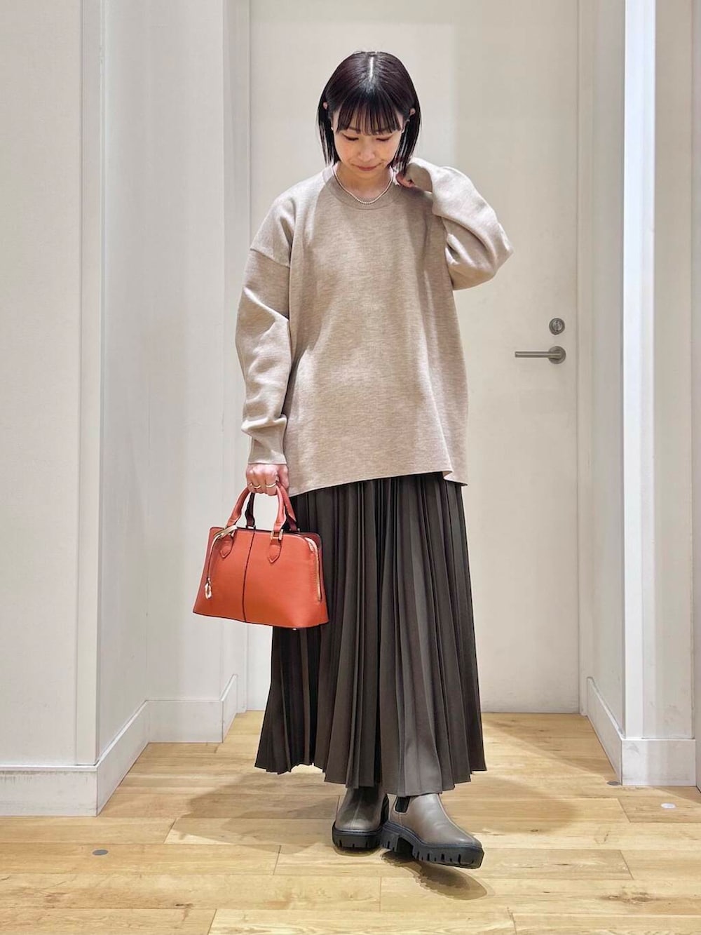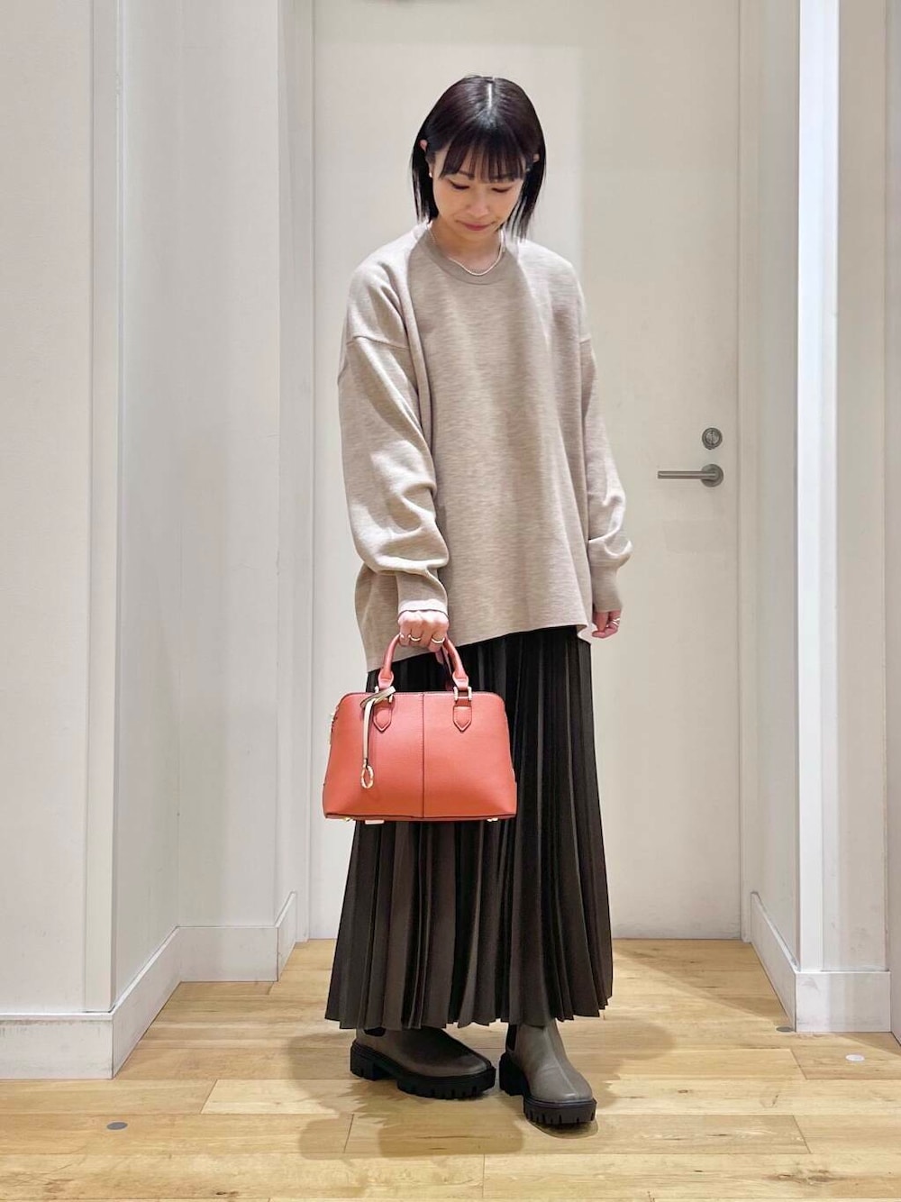トップスがゆったりなので、ボトムスにはスッキリとしたシルエットのプリーツスカートを合わせてみました。
