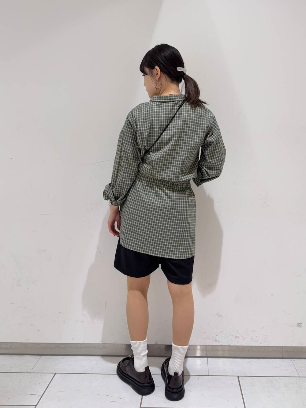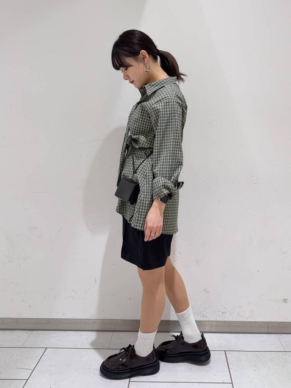 チェックが可愛いシャツは、ウエストがゴムになっているので、ウエストマークされてスタイルアップ効果◎
