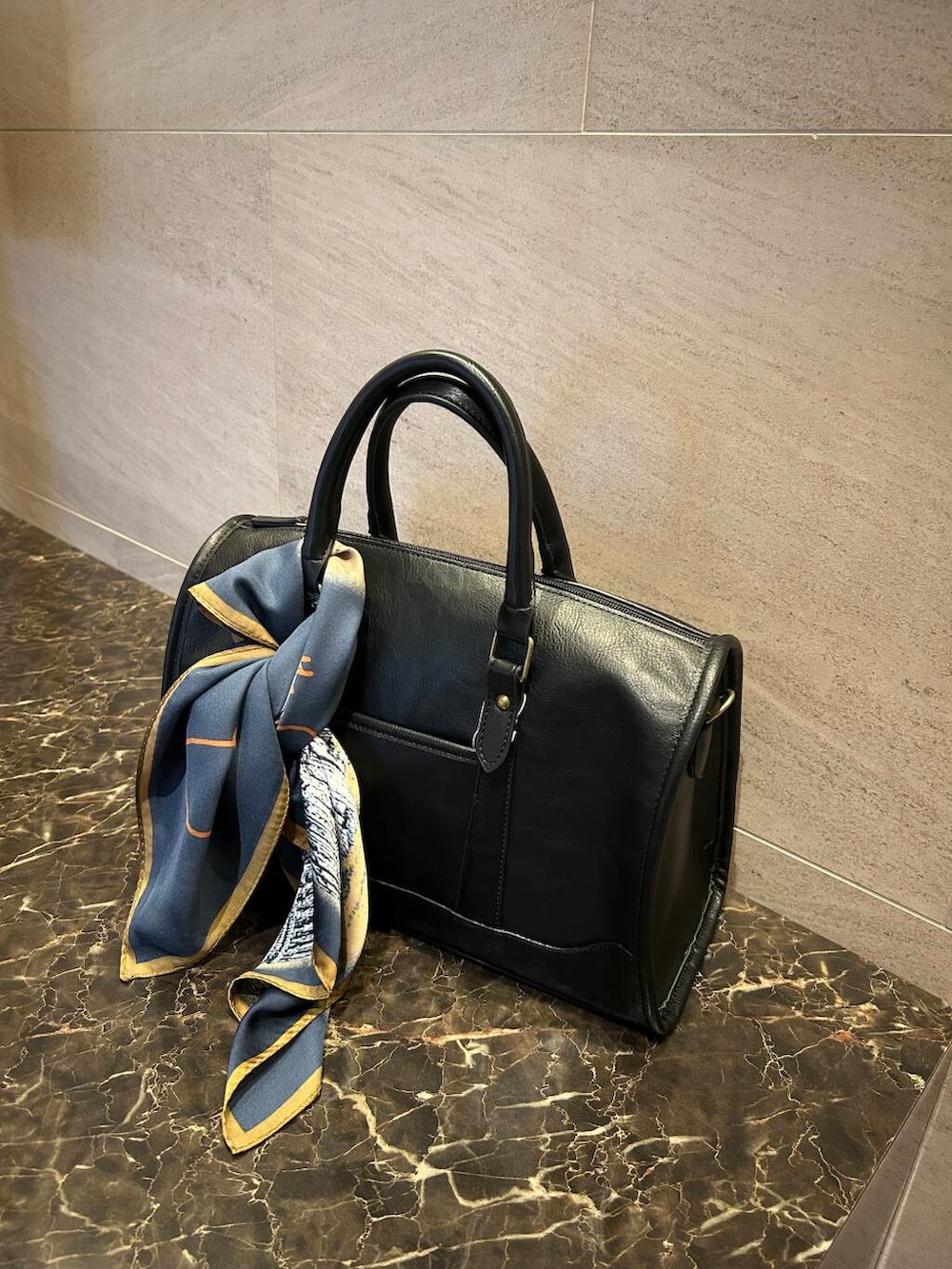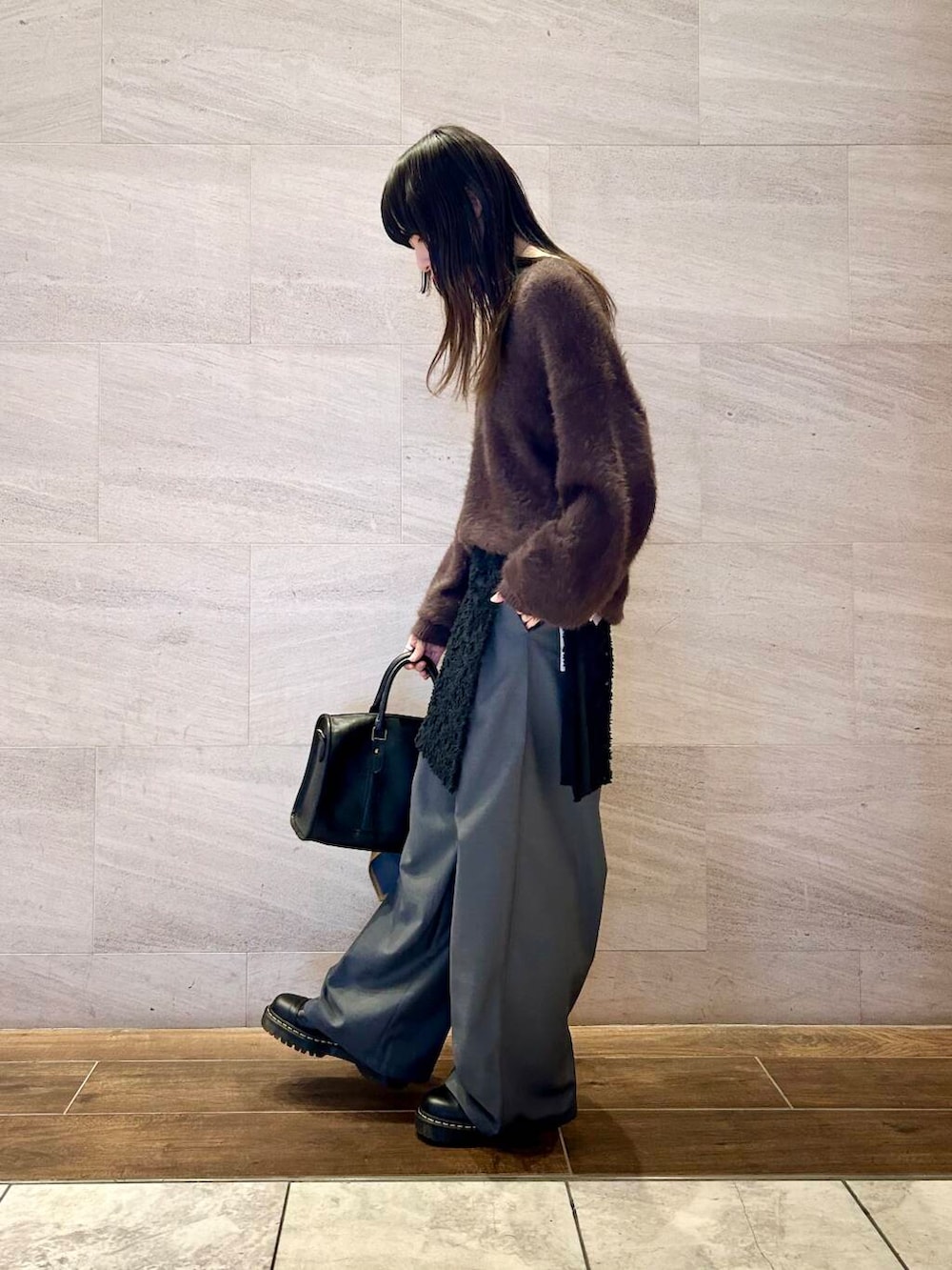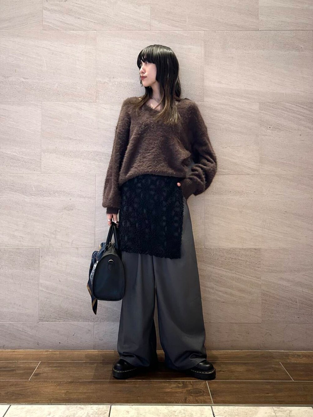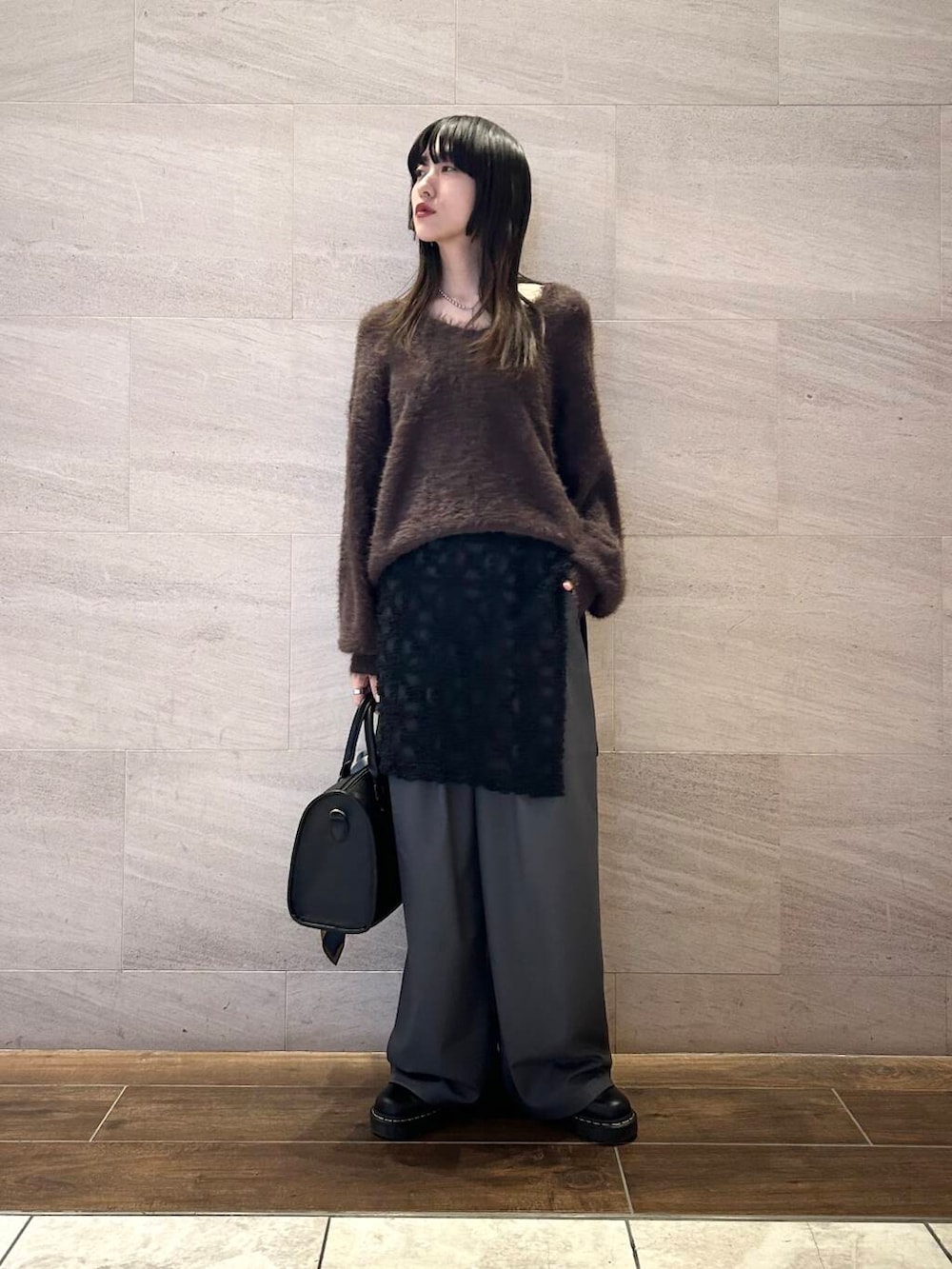 ポイントにブラックのボストンバッグをプラス。