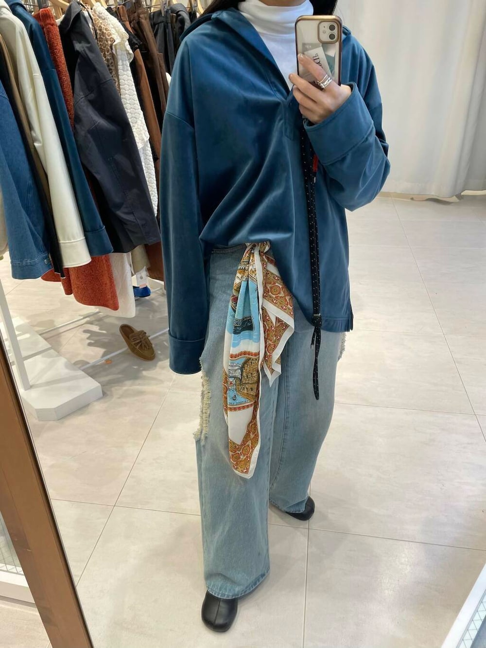 オーバーサイズのシルエットでヒップラインまで隠れます。ベロア素材で透け感もないため、ニットに飽きた方にもおすすめです!