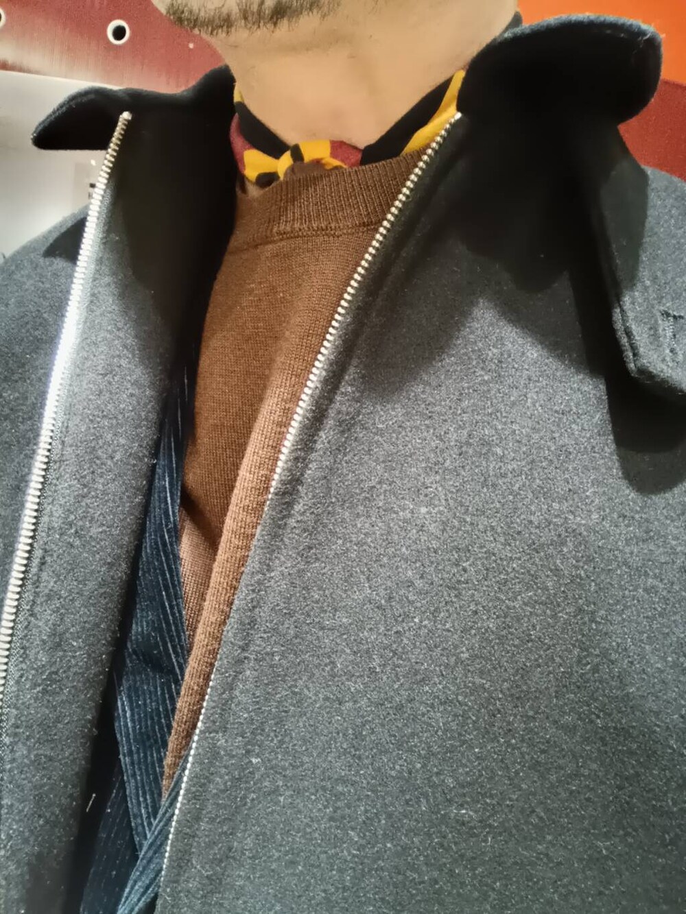 ハリントンジャケットをジャケットの上に羽織ったレイヤードスタイルです。