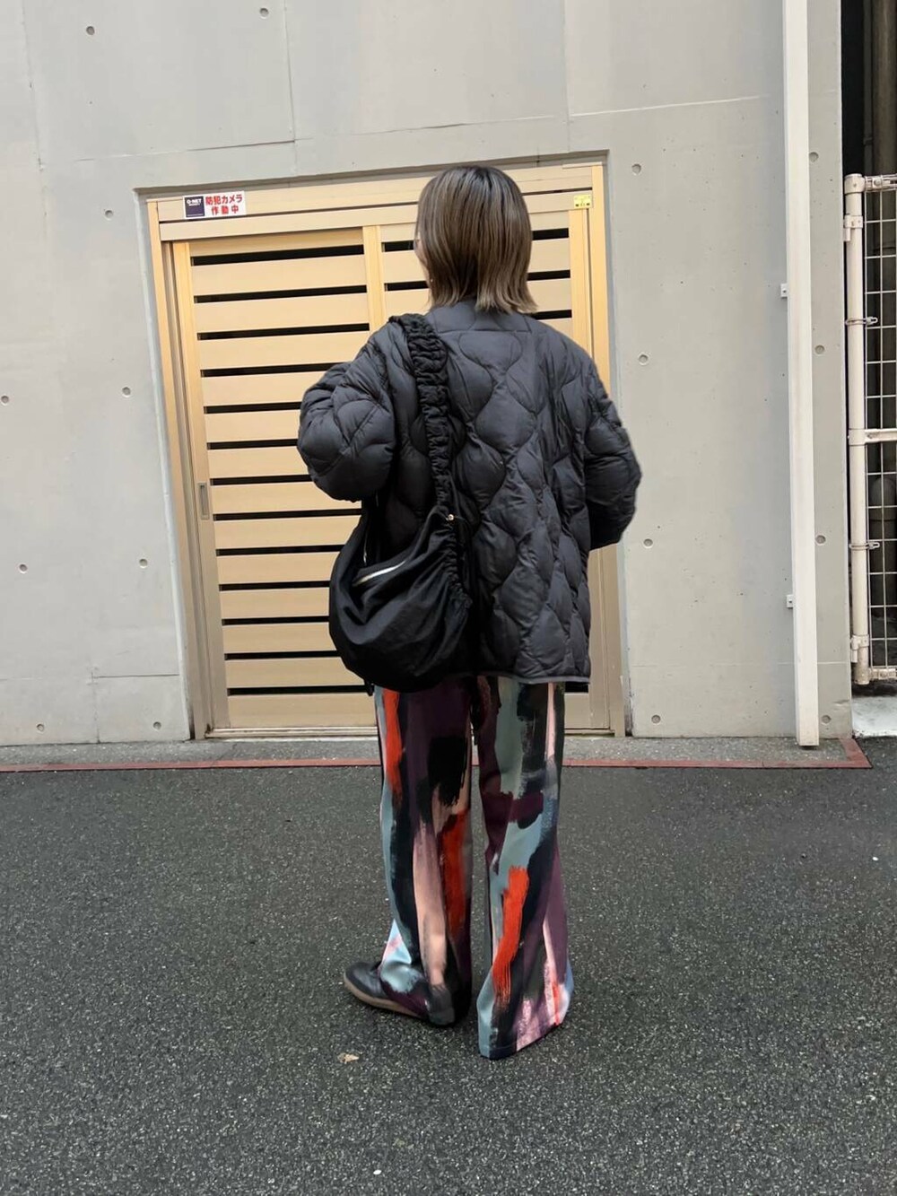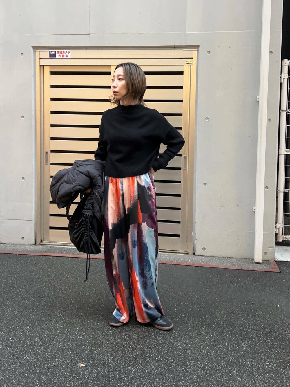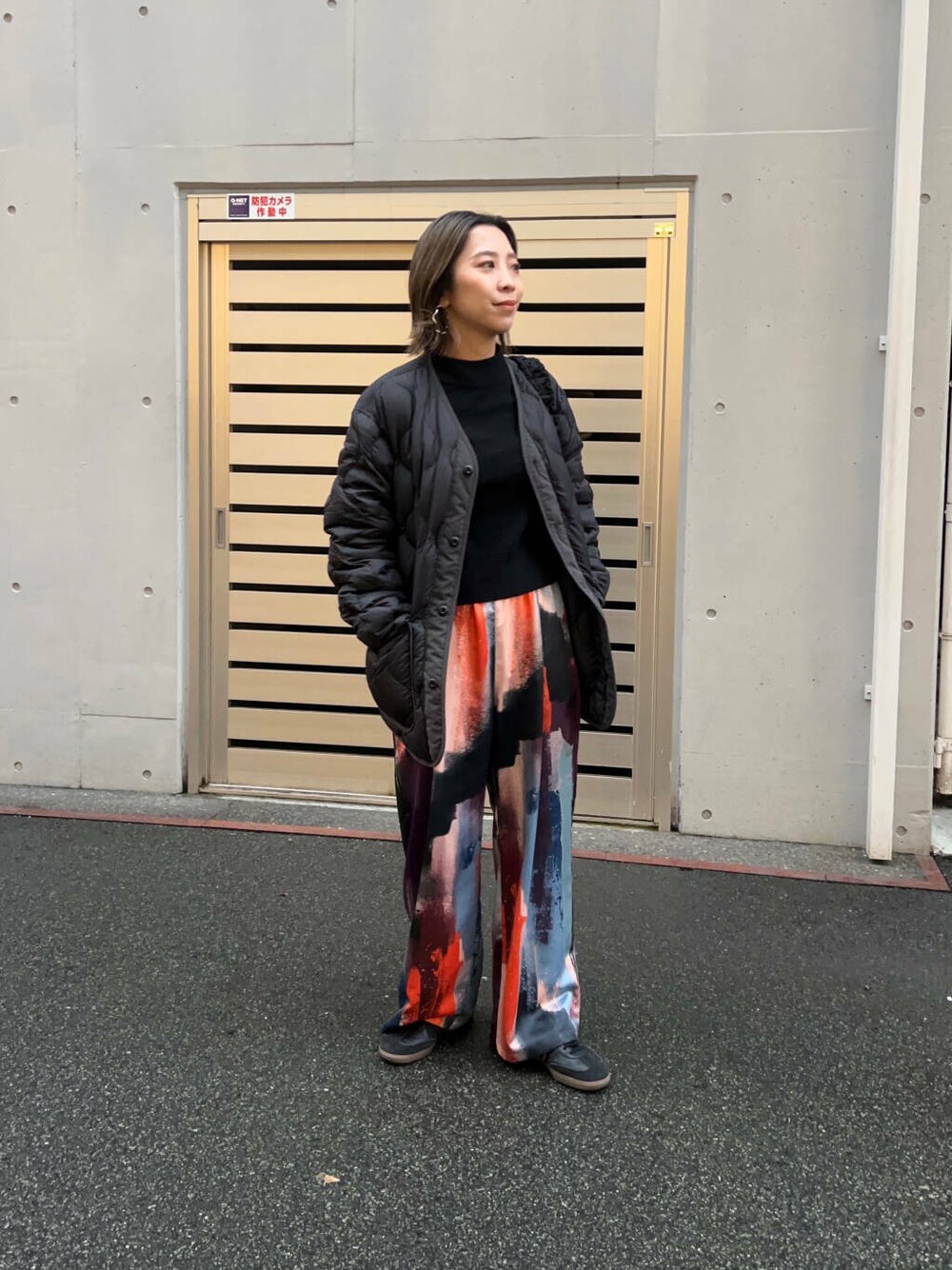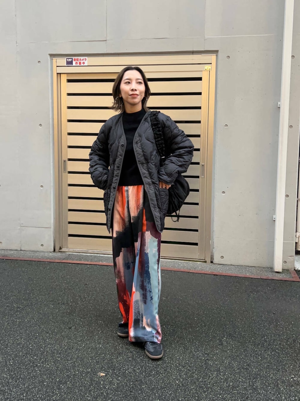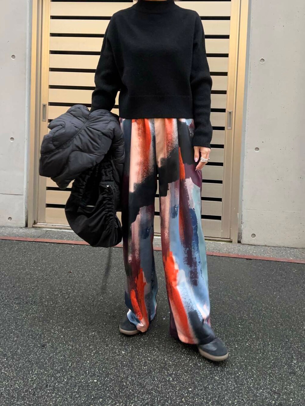 黒でまとめて柄パンツをより