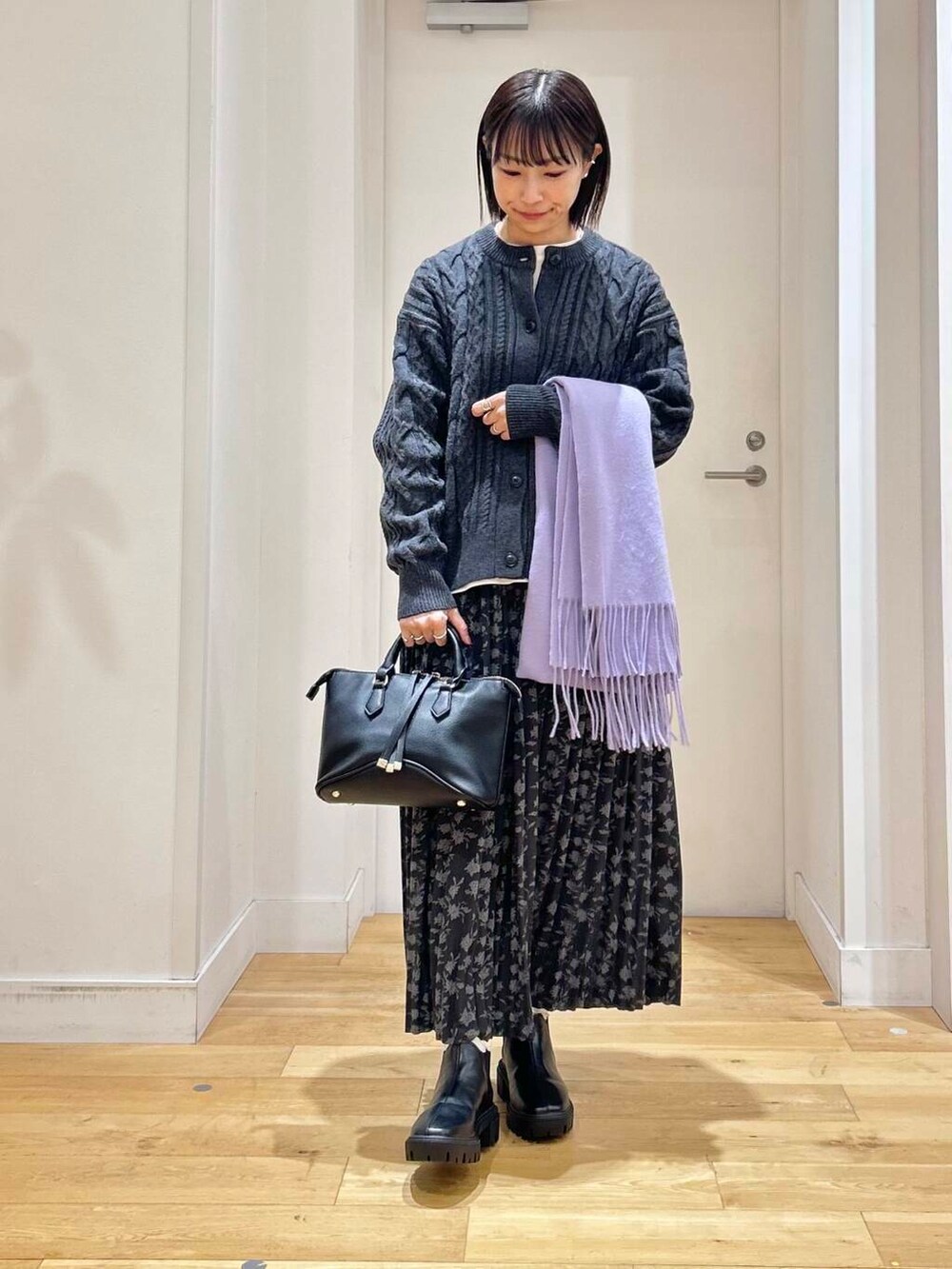 全体的に黒やチャコールでまとめて、差し色にラベンダーカラーのストールを合わせたきれいめカジュアルコーデです!