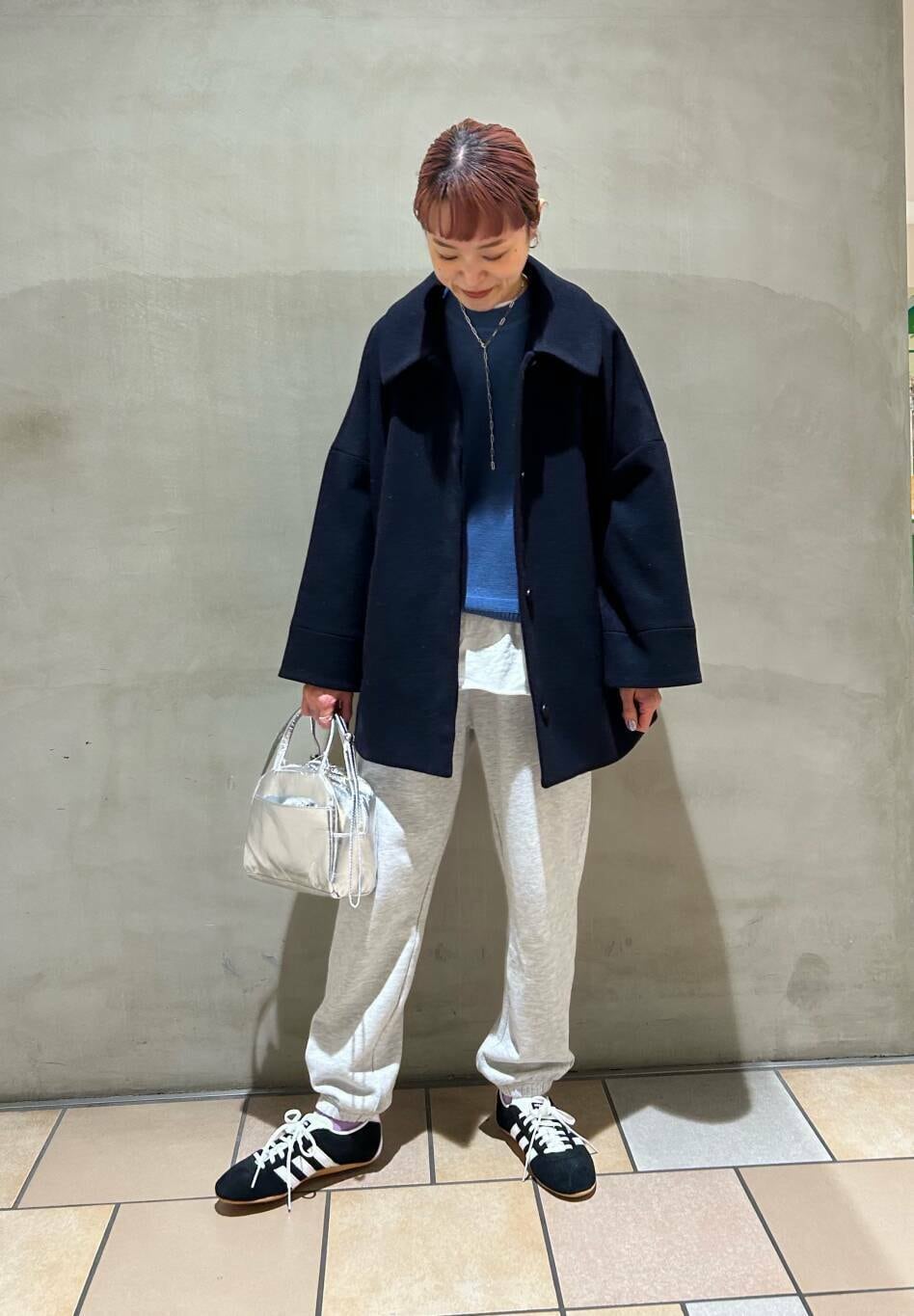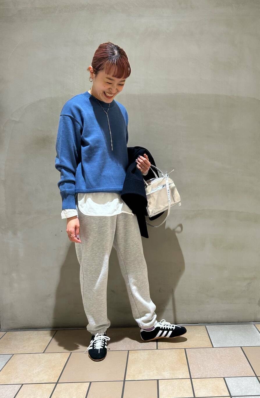 リアルバイのスウェットパンツ、明るいニットと合わせて楽ちんコーデです。
