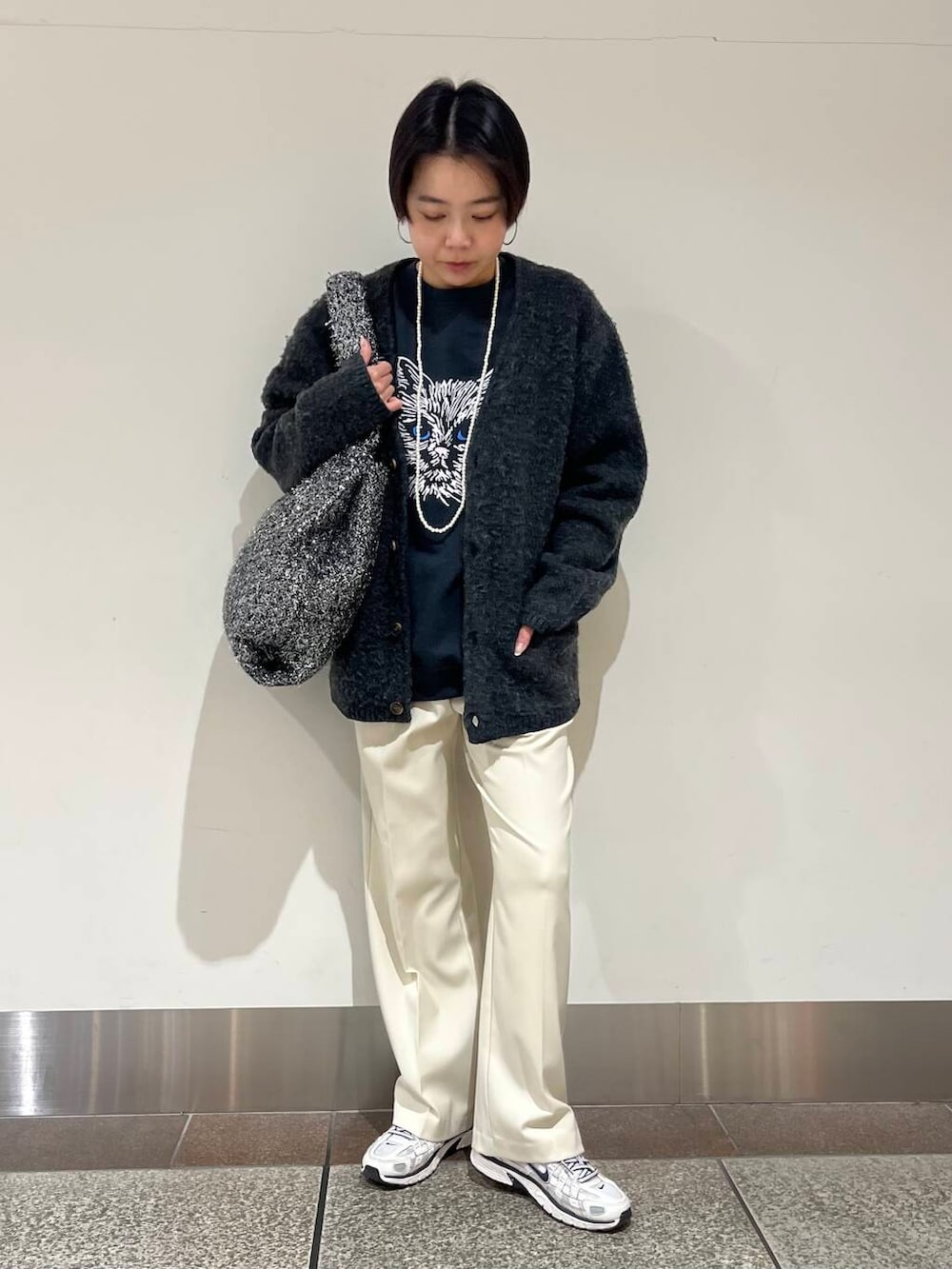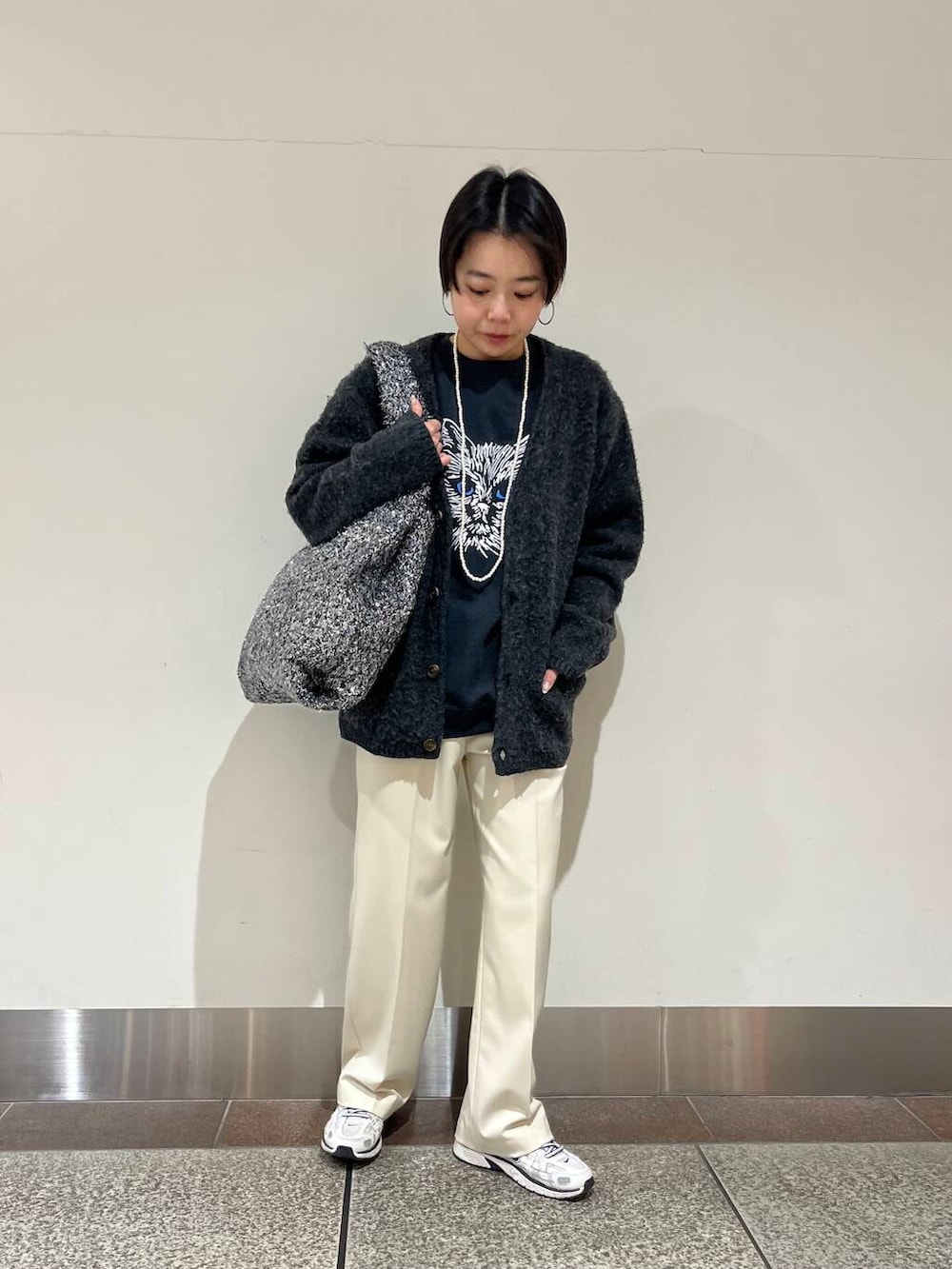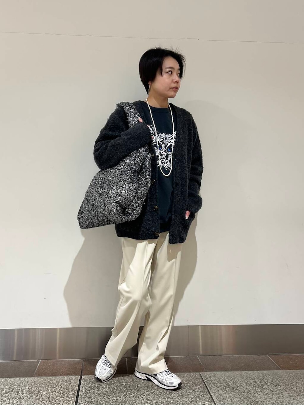 ニットカーディガンとスウェットは、メンズですが158cmの私がMサイズ着用でいい感じのサイズ感です。
